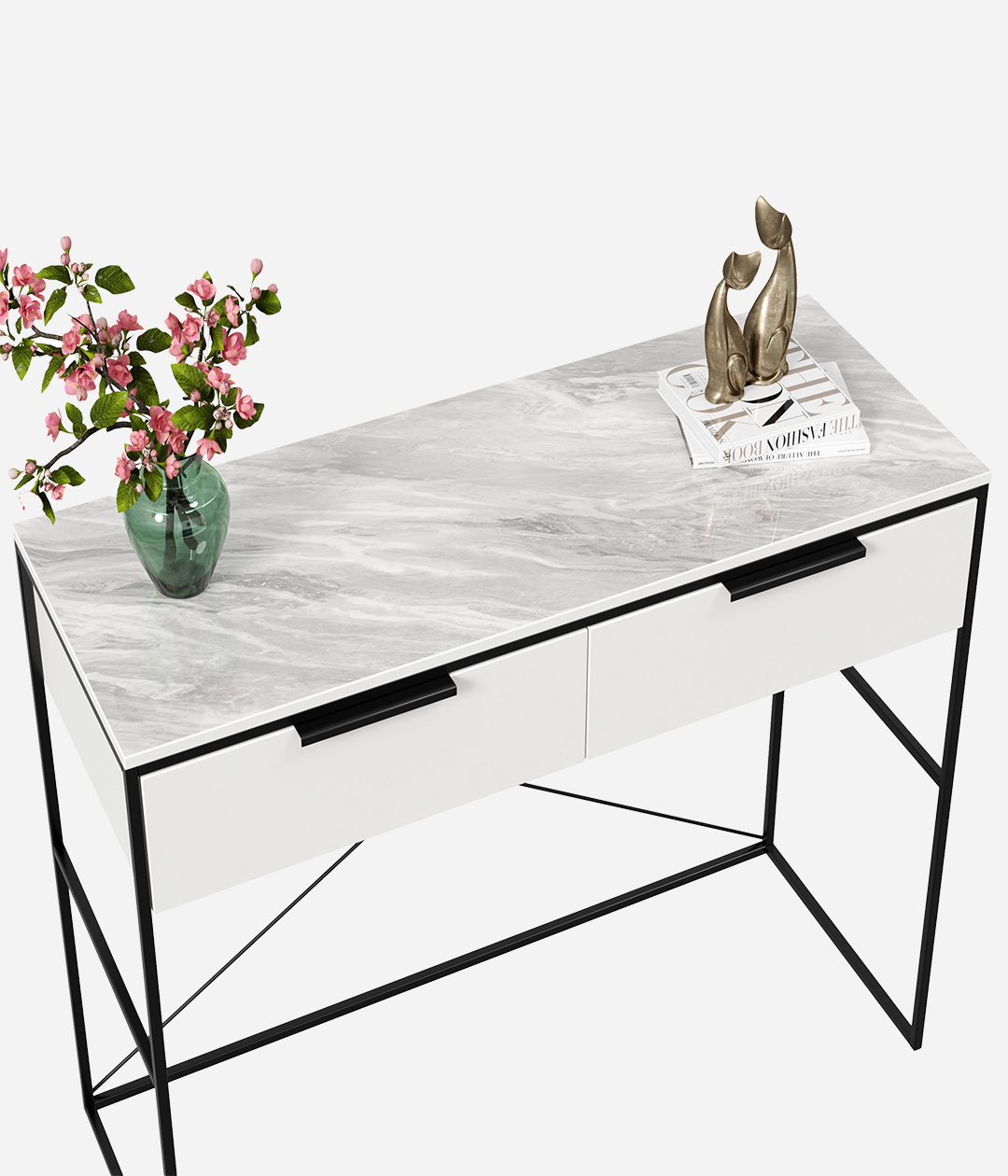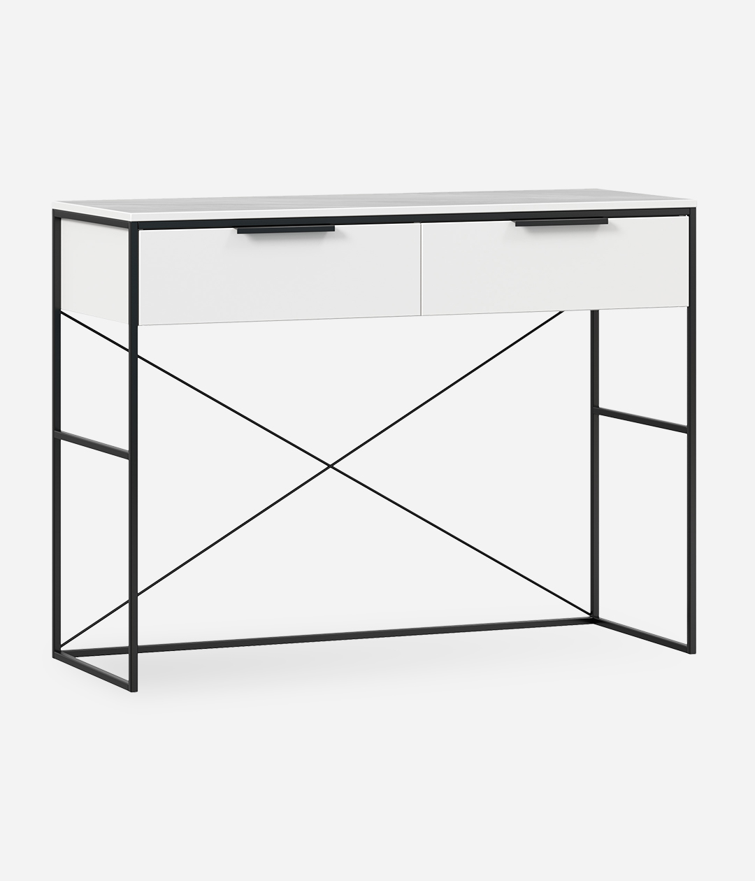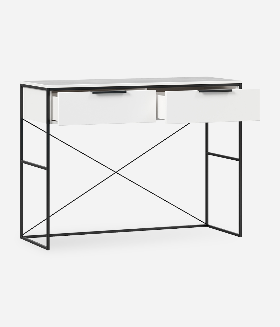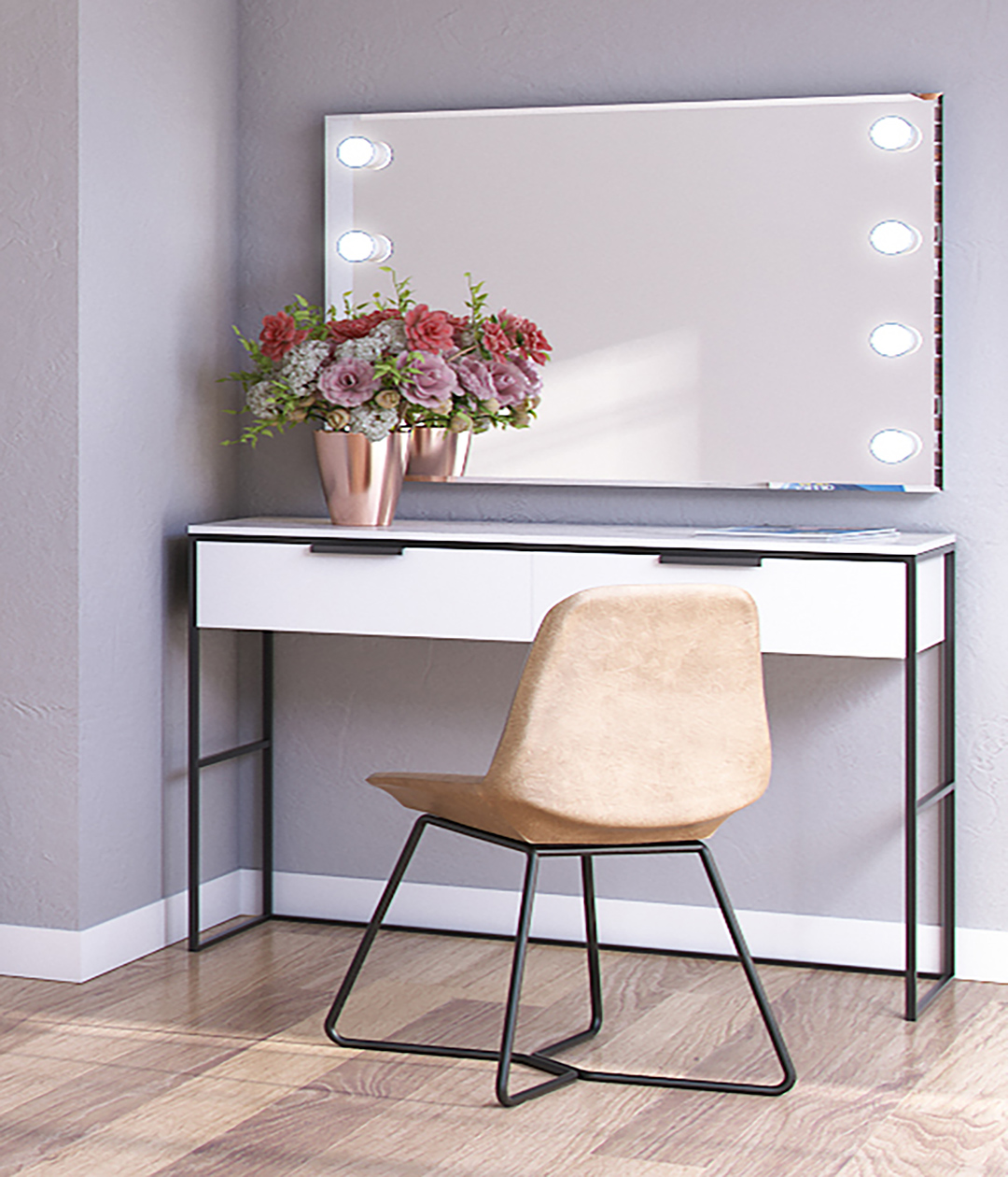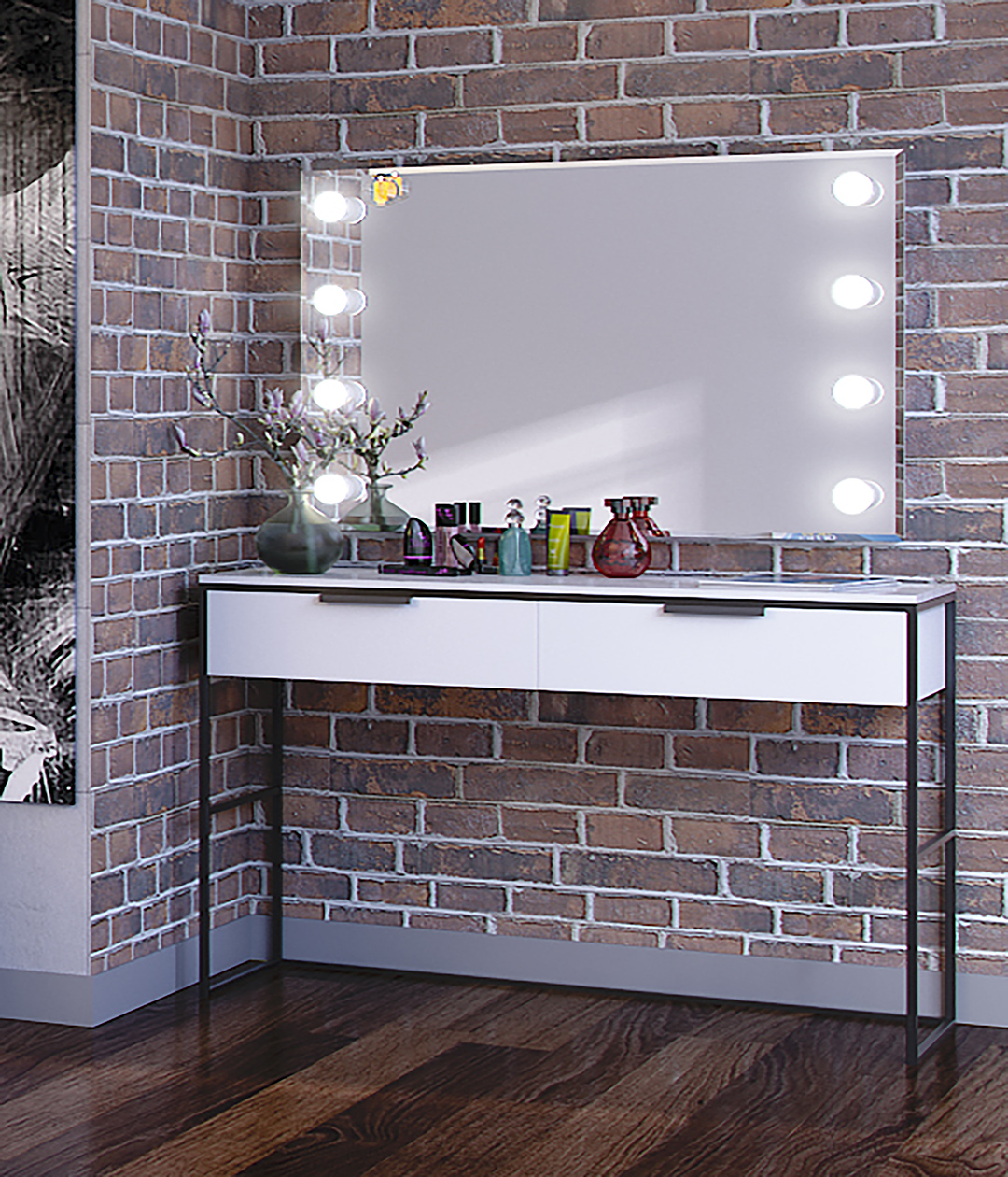 Туалетный стол Нордимеет яркий и лаконичный дизайн. Столик изготовлен в виде консоли на высоких опорах в стиле лофт. Его конструкция включает широкий выдвижной ящик, который справится с задачей хранения всевозможных мелочей, косметики и аксессуаров.