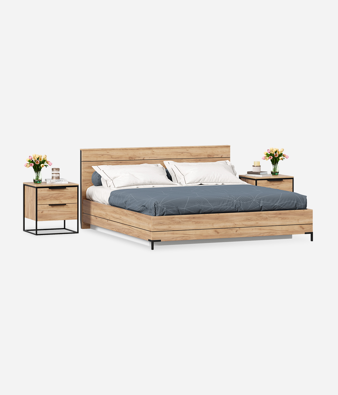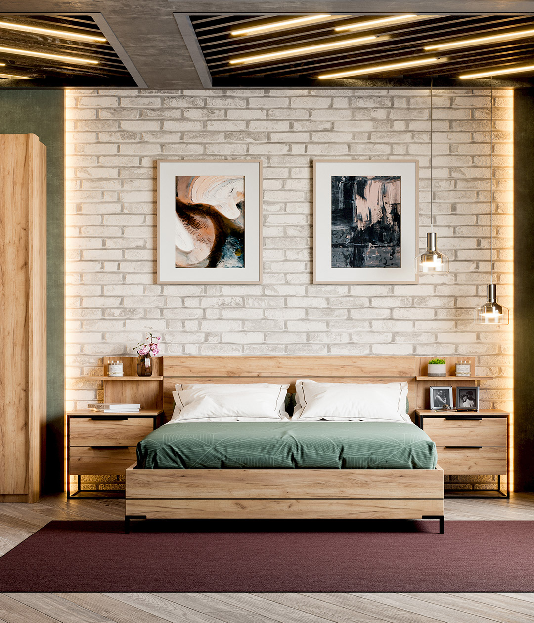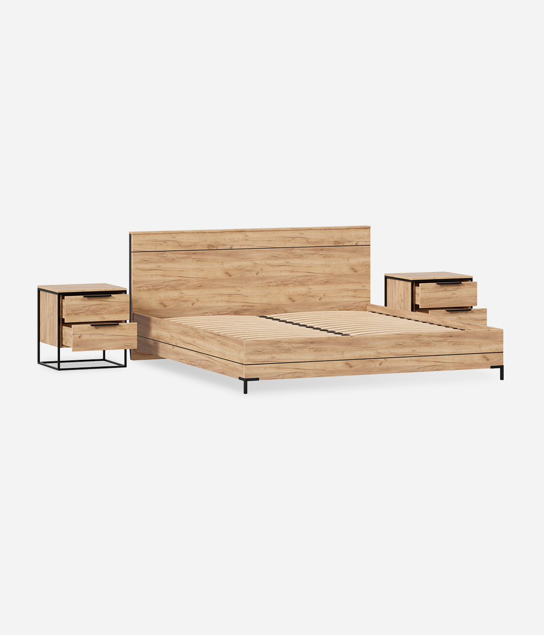 Спальня "Норд" выполнена в современном, скандинавском стиле. Минимализм интерьера только подчеркнет цвет тёплого дерева мебели. Металлические опоры и металлические ручки дают определенный геометрический взгляд на комнату, которая подчеркнет характер стремительных и деловых людей.