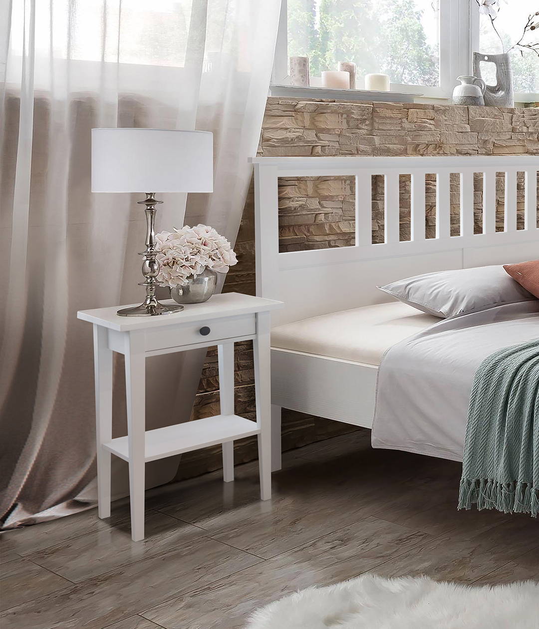 Прикроватная тумбочка «Нортон» с ящиком и полочкой. Модель на ножках и миниатюрной ручкой дополнит интерьер в современном стиле.