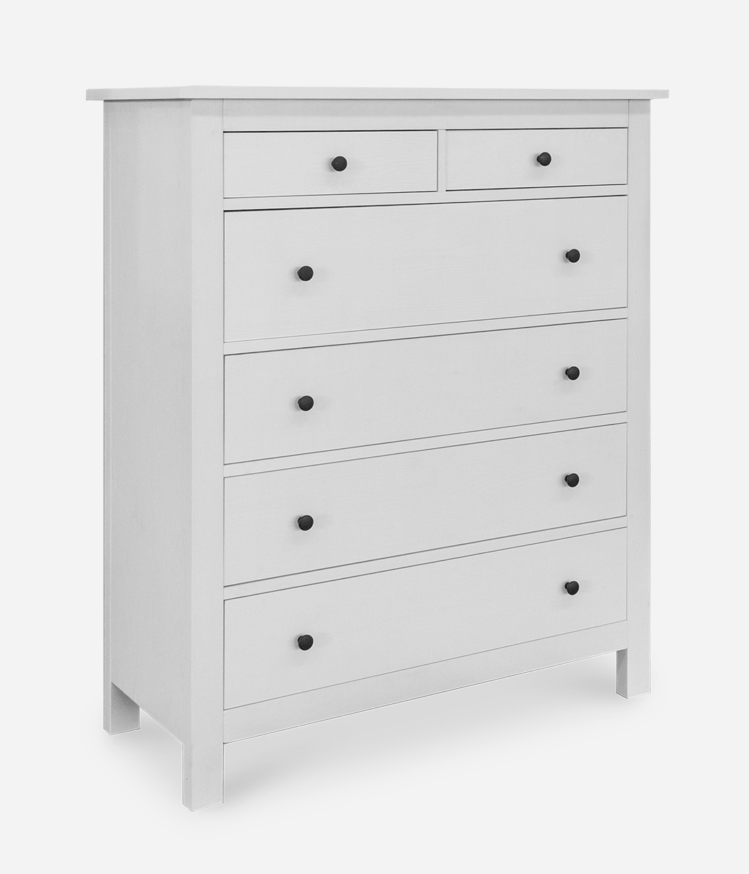 В двух верхних малых ящиках удобно хранить мелочи и аксессуары. Четыре широких нижних ящика вместят в себя белье, постельные принадлежности или сложенные вещи.