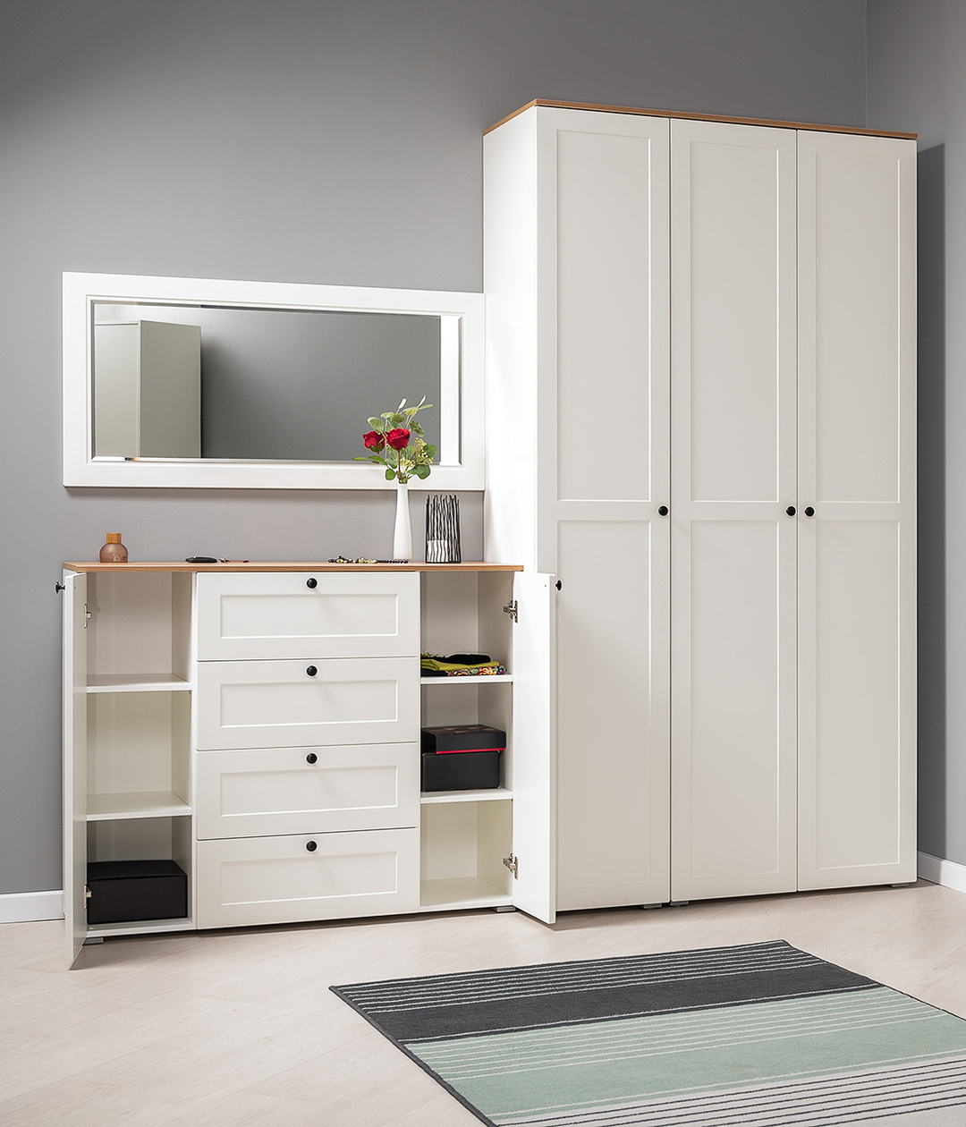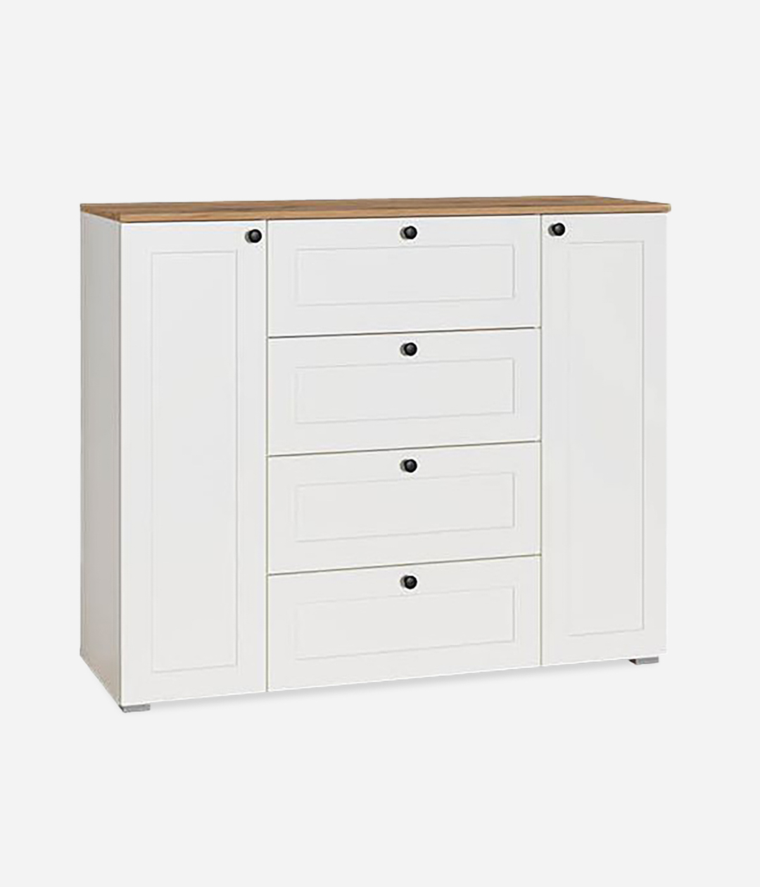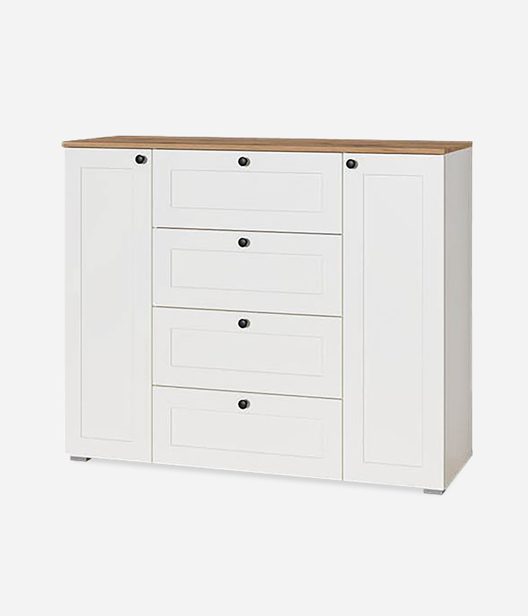 Комод Остин — стильное и практичное решение для оформления интерьера и организации пространства. Комбинированное наполнение предусматривает четыре выдвижных ящика по центру и два отделения с полками за распашными дверцами. Ящики оснащены направляющими скрытого монтажа, что обеспечит выдвижение на всю глубину, плавный бесшумный ход и длительный срок эксплуатации. Опоры регулируются по высоте, что позволит разместить комод на полу с неровностями.