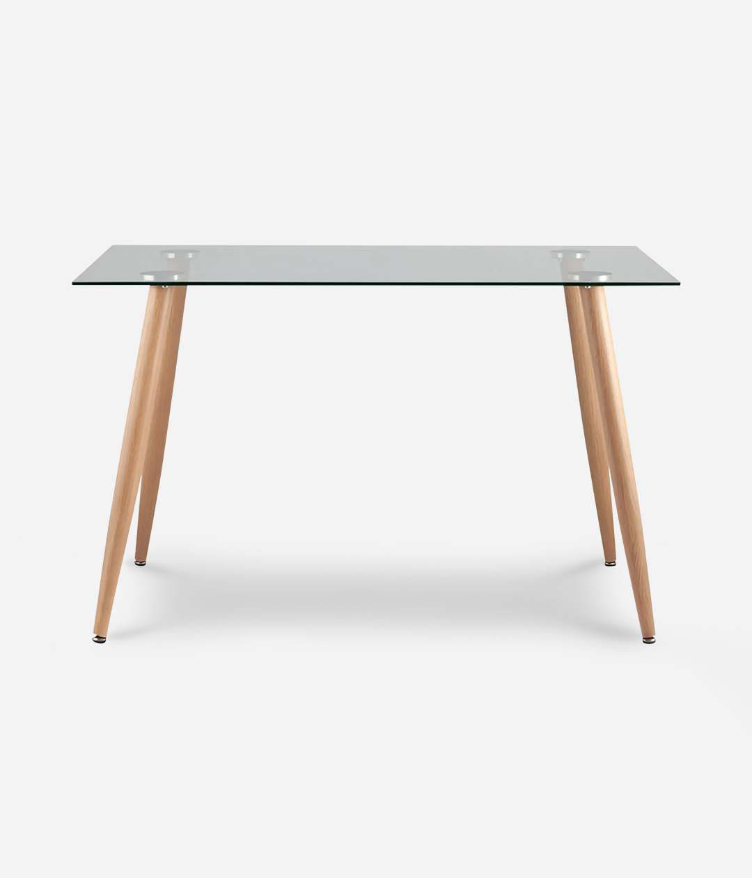 Обеденный стол со стеклянной столешницей. Закаленное стекло выдерживает большие нагрузки, обладает высокой термоустойчивостью и прочностью. Стол украшают крепкие ножки, выполненные из металла.