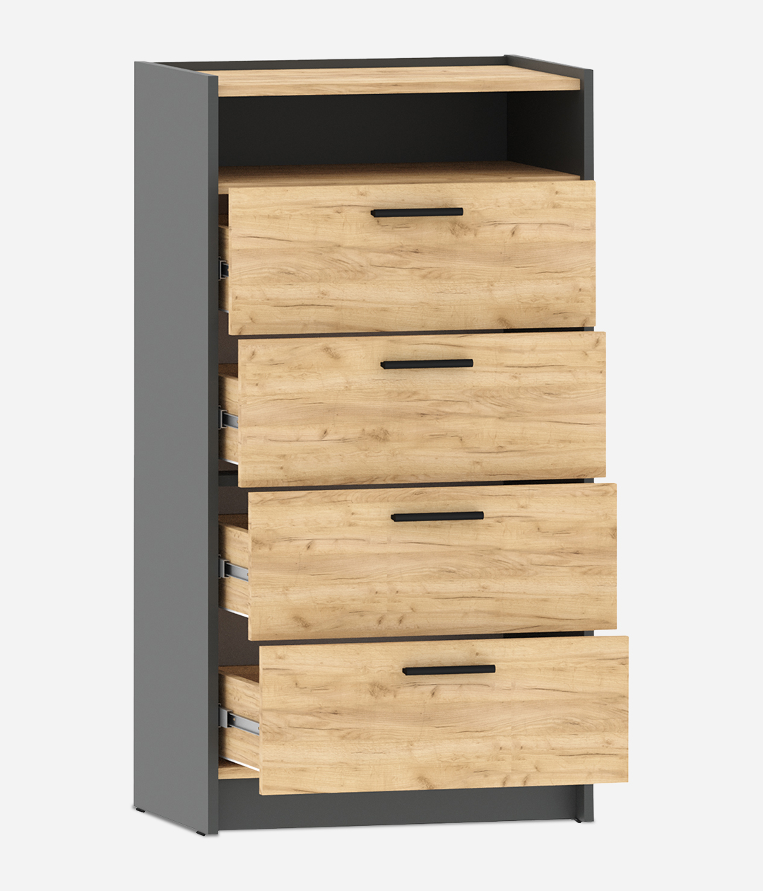 Комод с четырьмя ящиками и отрытой нишей из новой коллекции Оттавия представлен в двух оттенках на выбор – белый и антрацит, которые легко впишутся как в скандинавский, так и в урбанистический интерьер и придадут спальне современный вид.