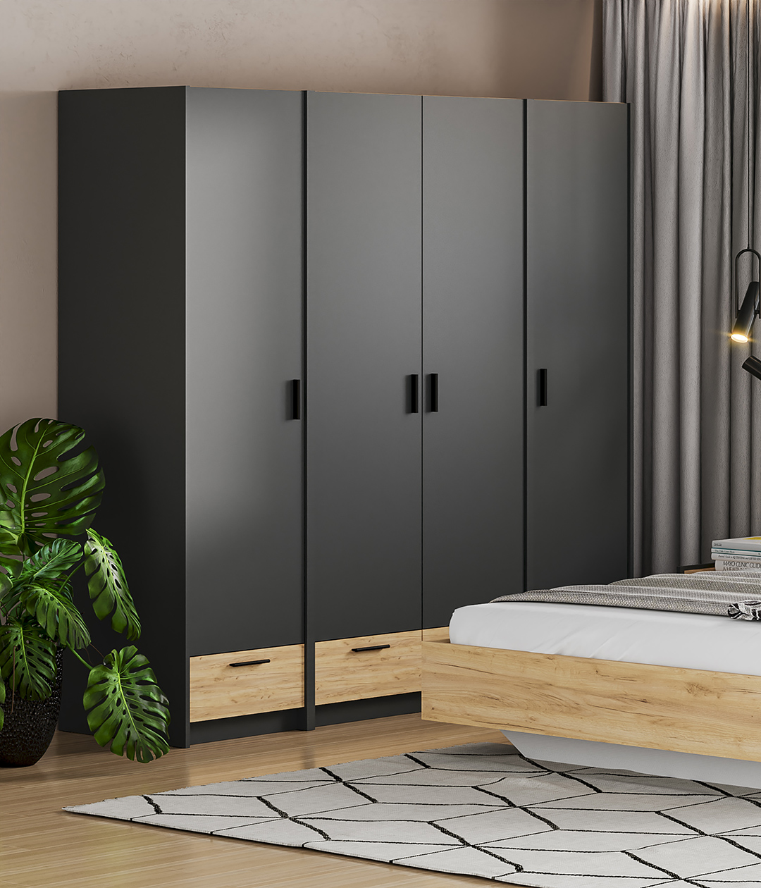 Четырехстворчатый шкаф со штангой, полками и четырьмя ящиками из новой коллекции Оттавия представлен в двух цветах на выбор – белый и антрацит. Шкаф отлично подойдет в гостиную для любого современного интерьера, как скандинавского, так и урбанистического.