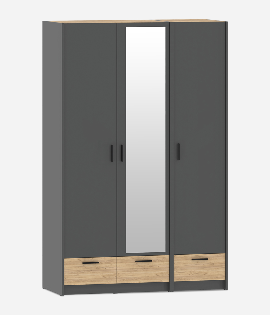 Трехстворчатый шкаф со штангой, полками и тремя ящиками новой коллекции Оттавия представлен в двух цветах на выбор – белый и антрацит. Шкаф отлично подойдет в гостиную для любого современного интерьера, как скандинавского, так и урбанистического.