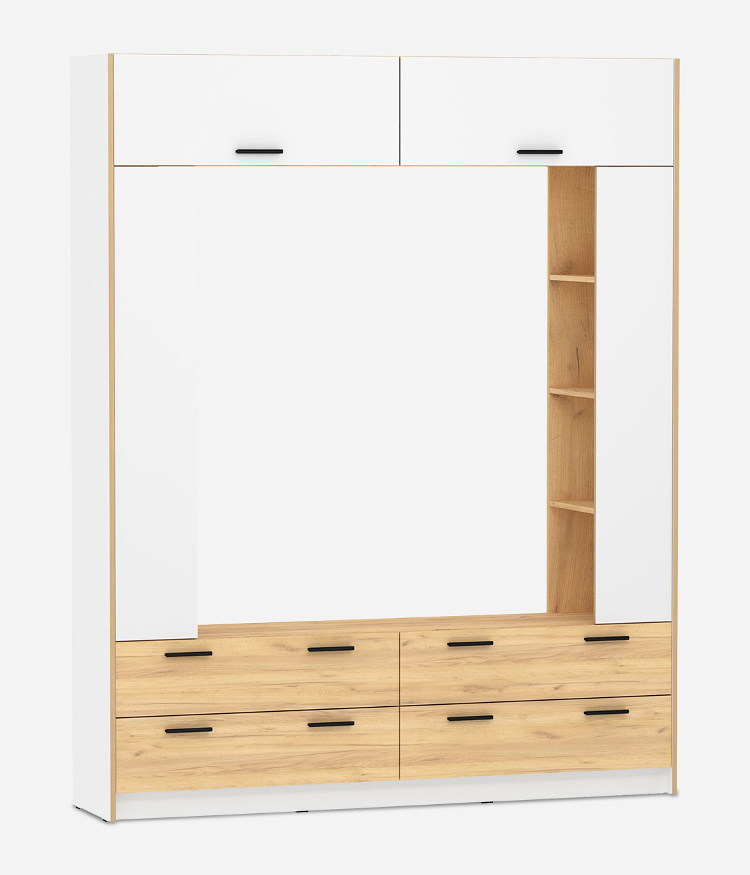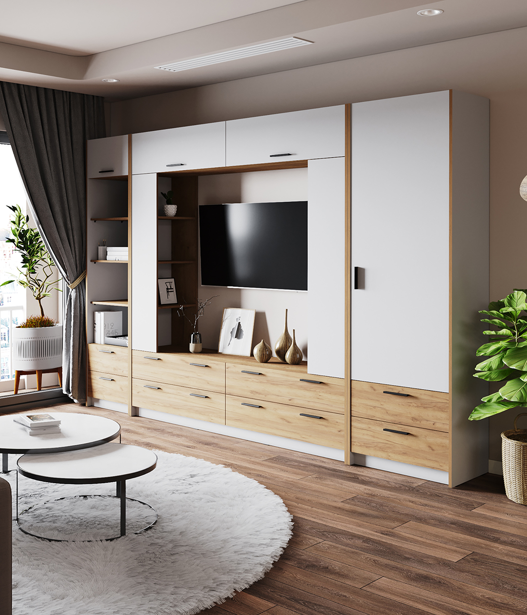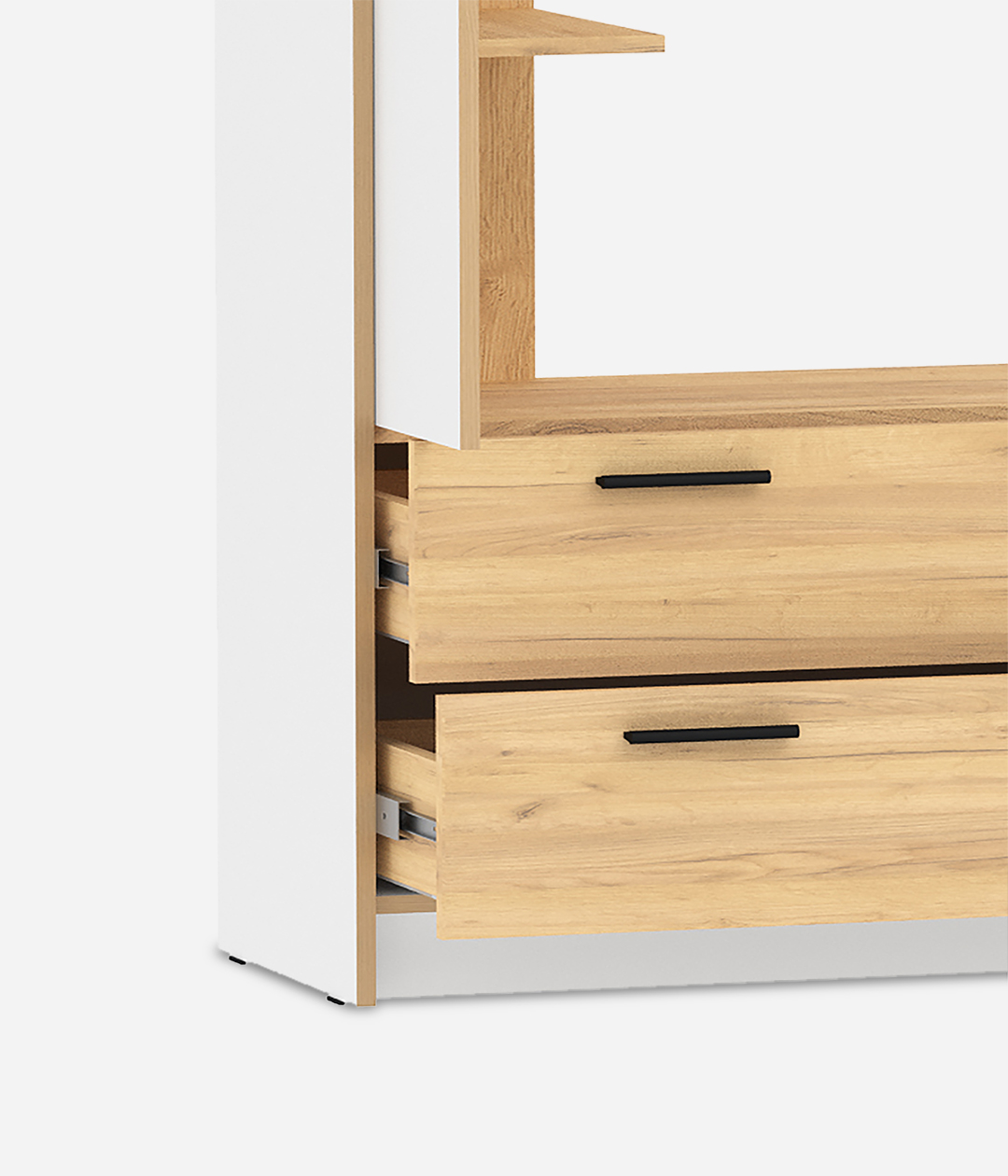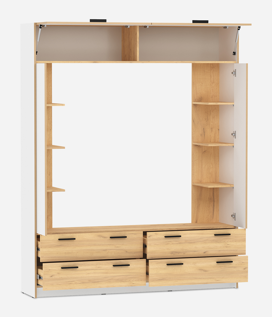 Комбинированный шкаф с четырьмя широкими ящиками и вместительными полками из новой коллекции Оттавия представлен в двух цветах на выбор – белый и антрацит. Шкаф отлично подойдет в гостиную для любого современного интерьера, как скандинавского, так и урбанистического.