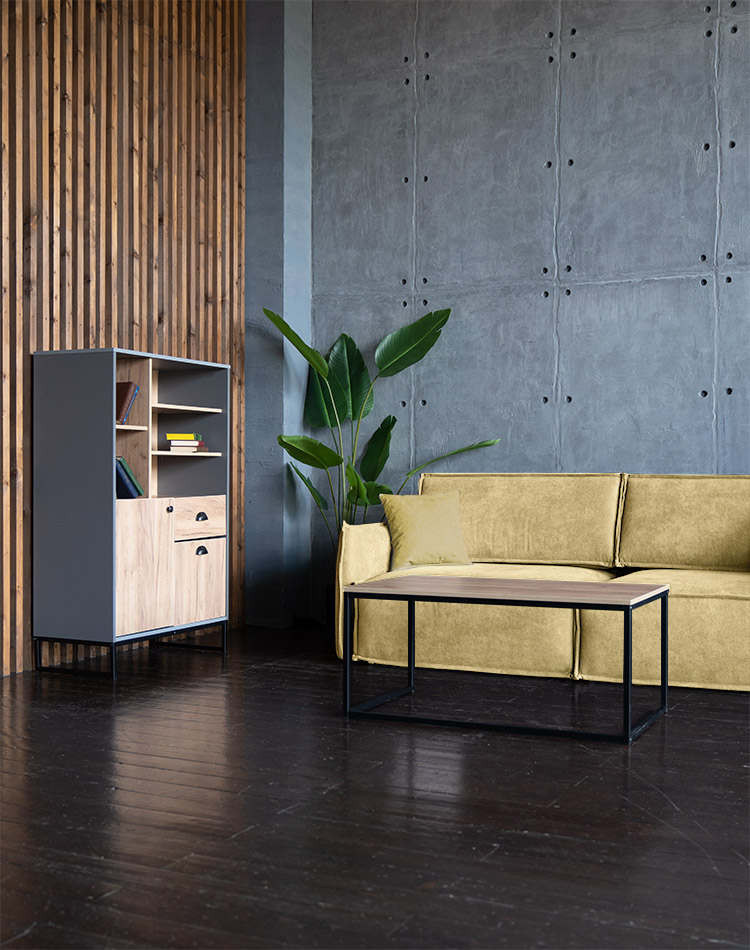 Диван Пеория Лимонный, Высокий шкаф Лофт и Журнальный стол Лофт