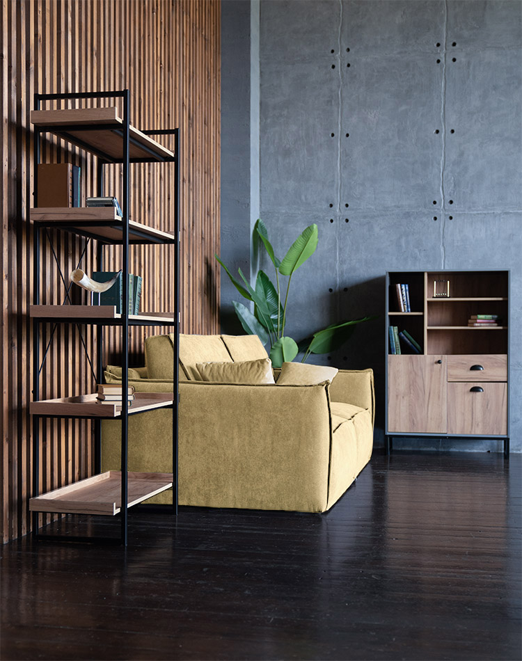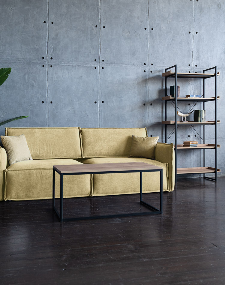 Диван Пеория Лимонный, Журнальный стол Лофт и Стеллаж Лофт
