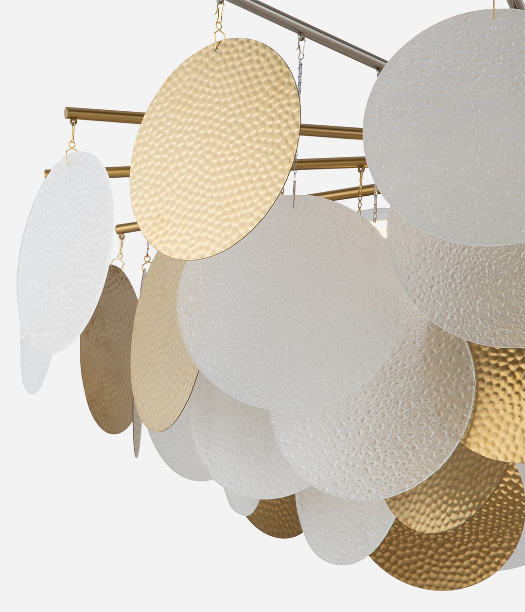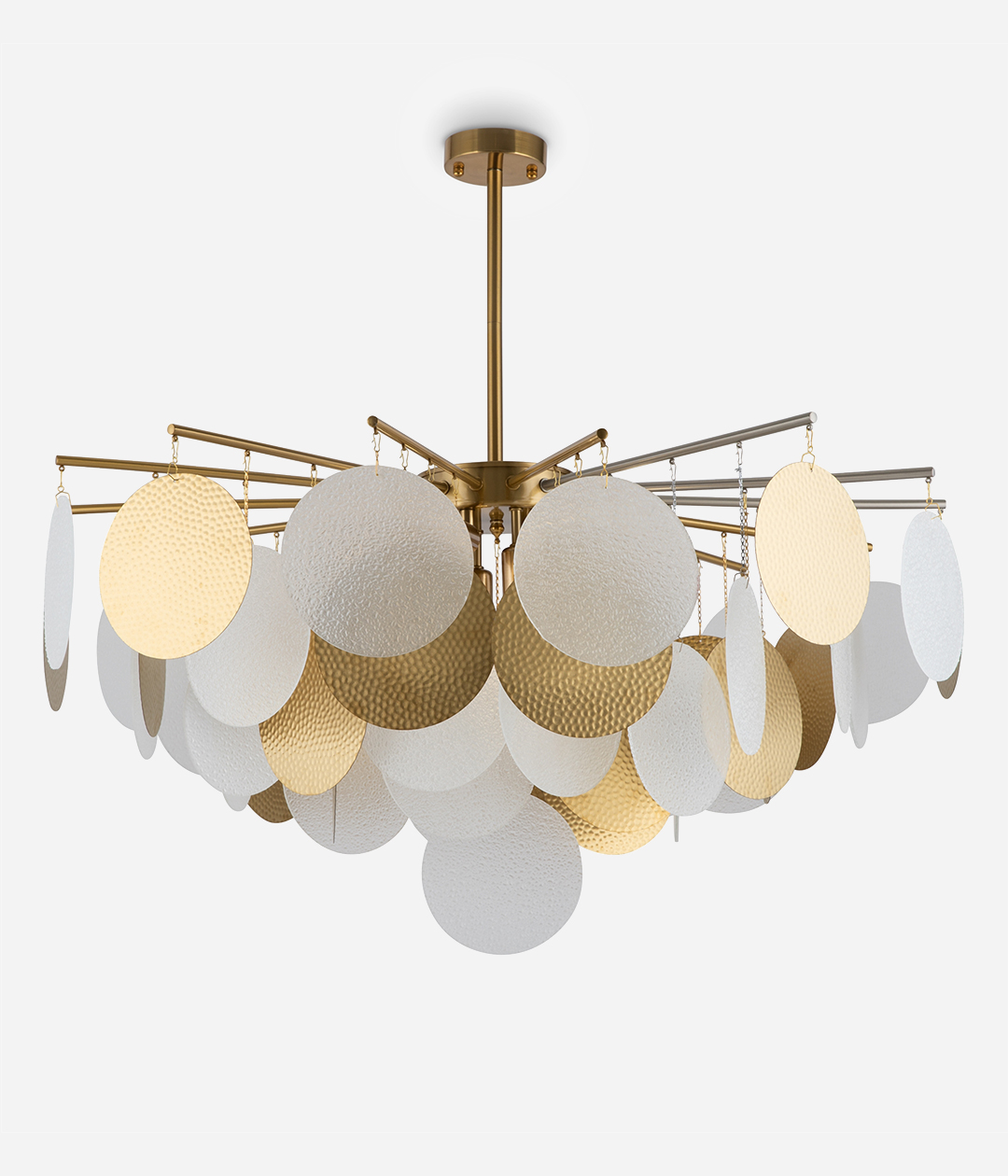 Магия фактур запечатлена в дизайне люстры Porto. Изюминка модели – декор в виде тонких округлых пластин с эффектом замороженного стекла. Популярная серия имеет два цветовых решения: декор цвета рисовых полей, а также комбинация фактурного стекла и металлических пластин в цвете латунь. Тонко очерченные рожки и воздушный стеклянный декор создают трендовый эффект парения.