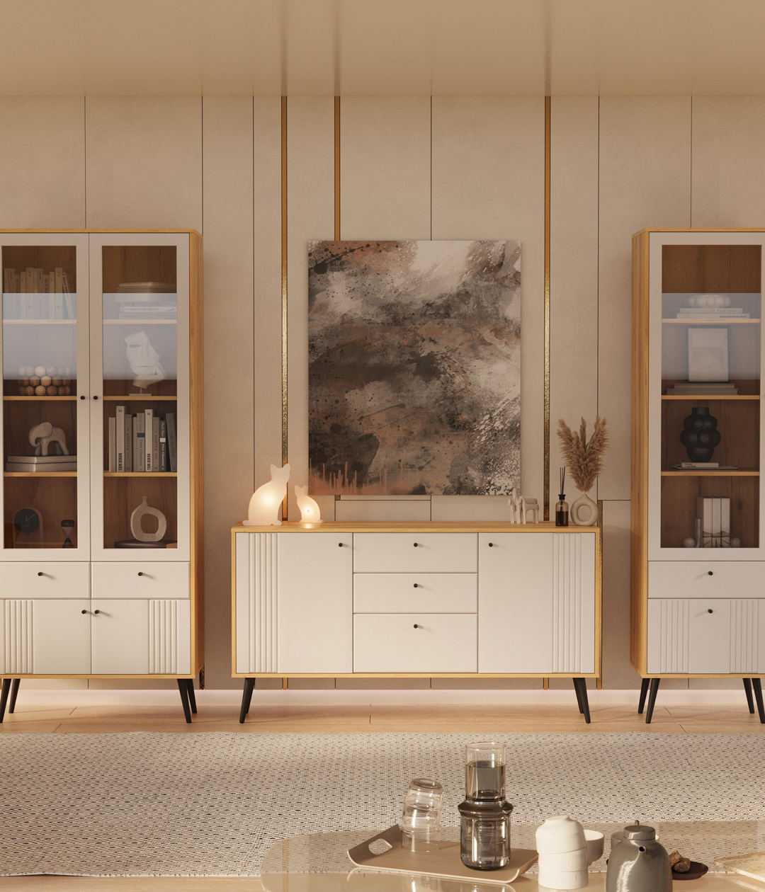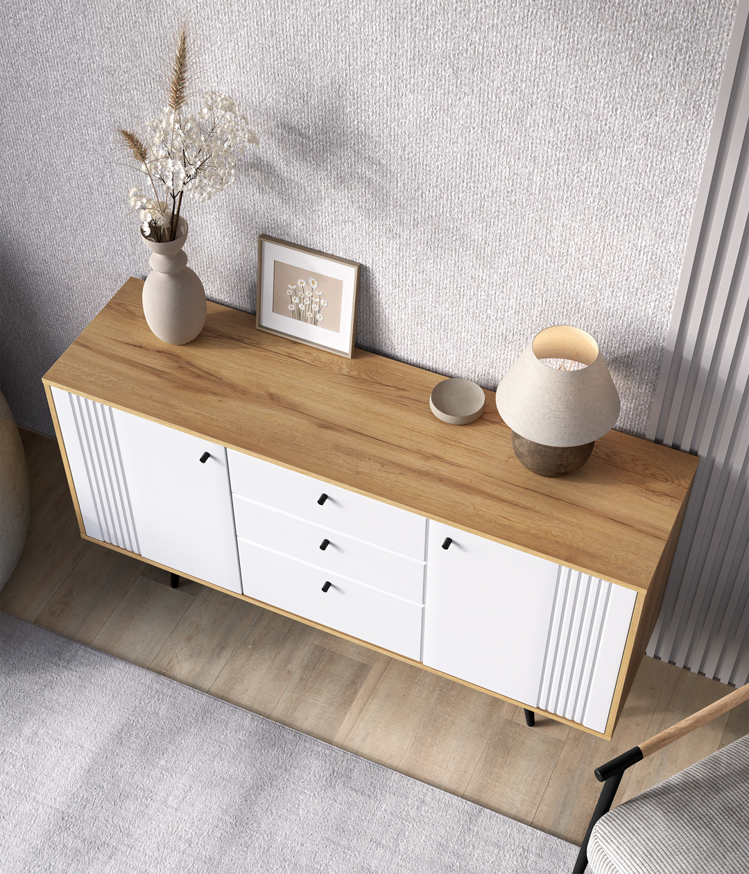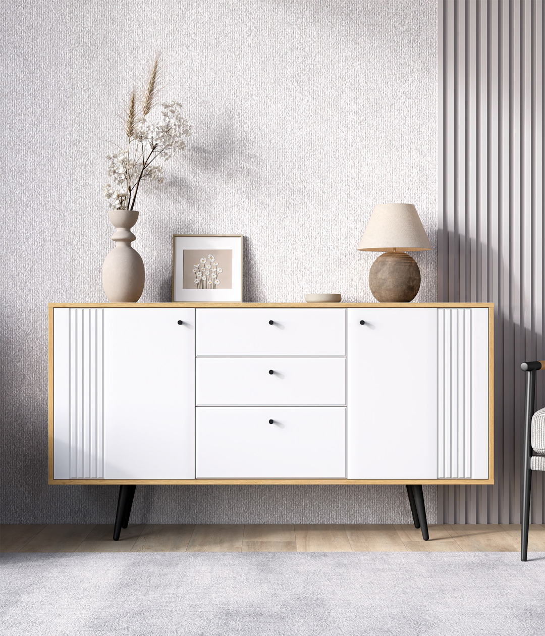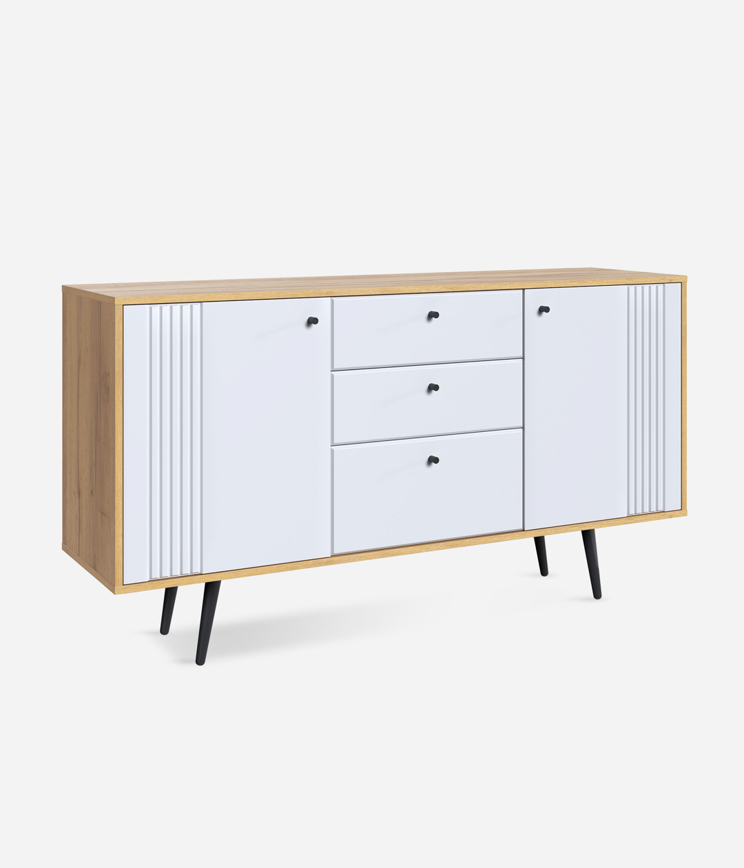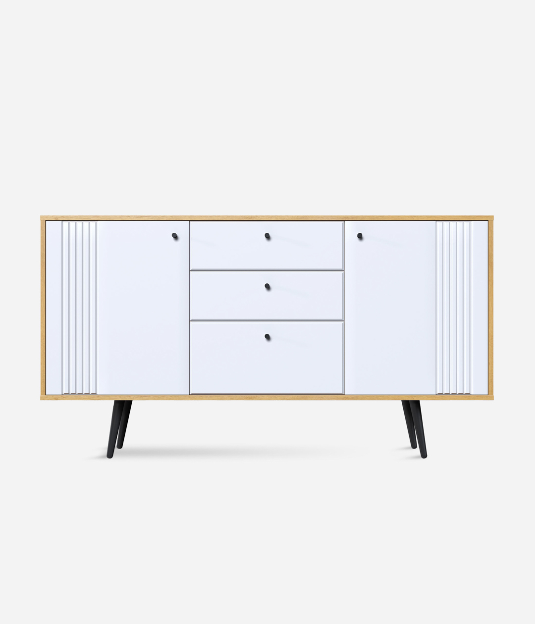 Комодино «Саксония» — это стильный модуль для спальни или гостиной. Оригинальный дизайн, в котором отсутствуют стандартные и скучные решения, придаст интерьеру уютный вид. Вы можете установить на него телевизор или украсить статуэтками, вазами или рамочками с любимыми фото. Удобство хранения в закрытом виде обеспечивают 3 выдвижных ящика, а также большие отделы с распашными дверцами.