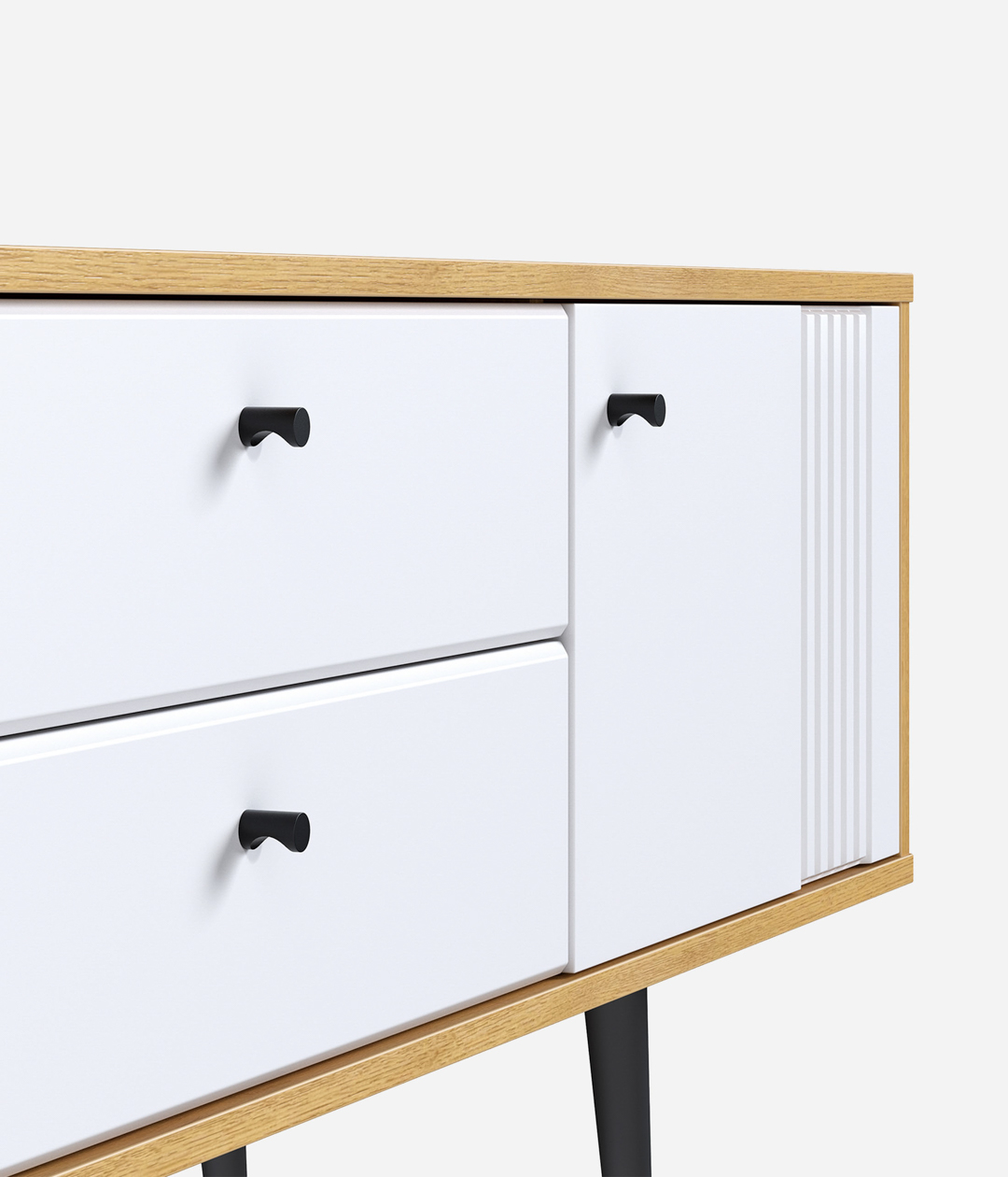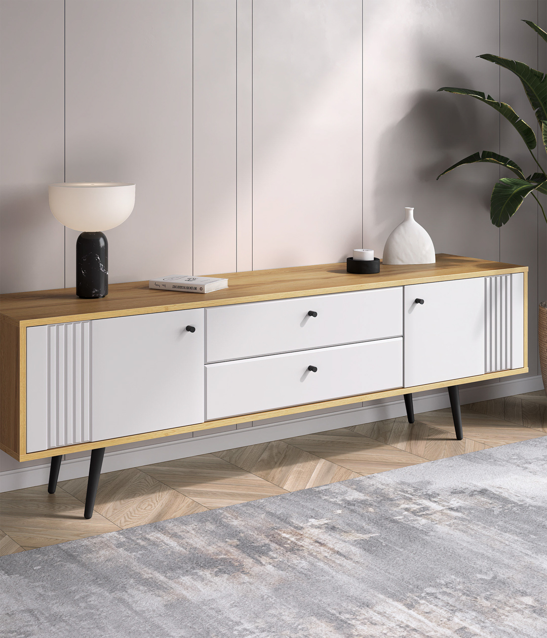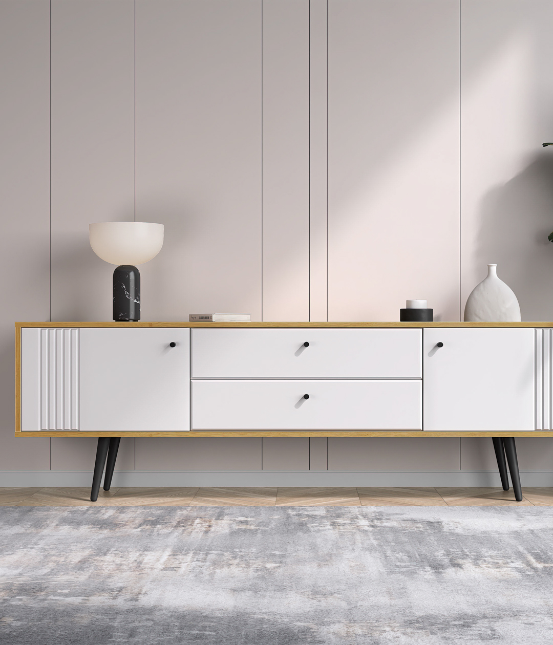 ТВ-тумба «Саксония» выполнена в спокойных тонах в сочетании с элементами из дерева, миниатюрными ручками и ножками. Оригинальный дизайн, в котором отсутствуют стандартные и скучные решения, придаст интерьеру гостиной уютный вид, где тумба с установленным на неё телевизором станет центром мебельной композиции.