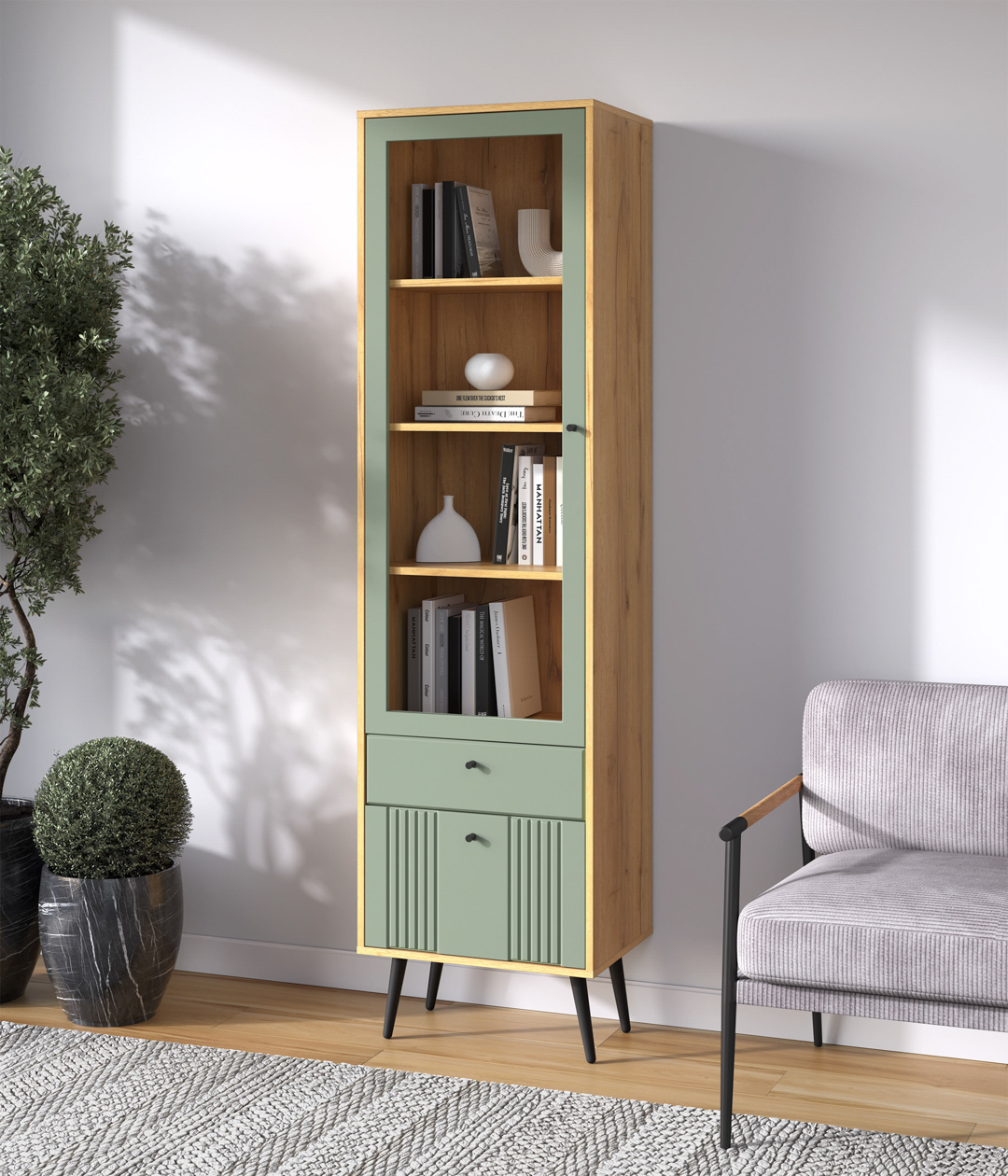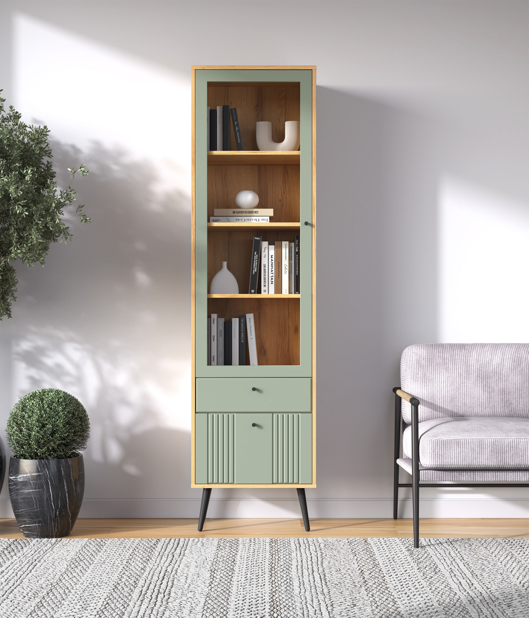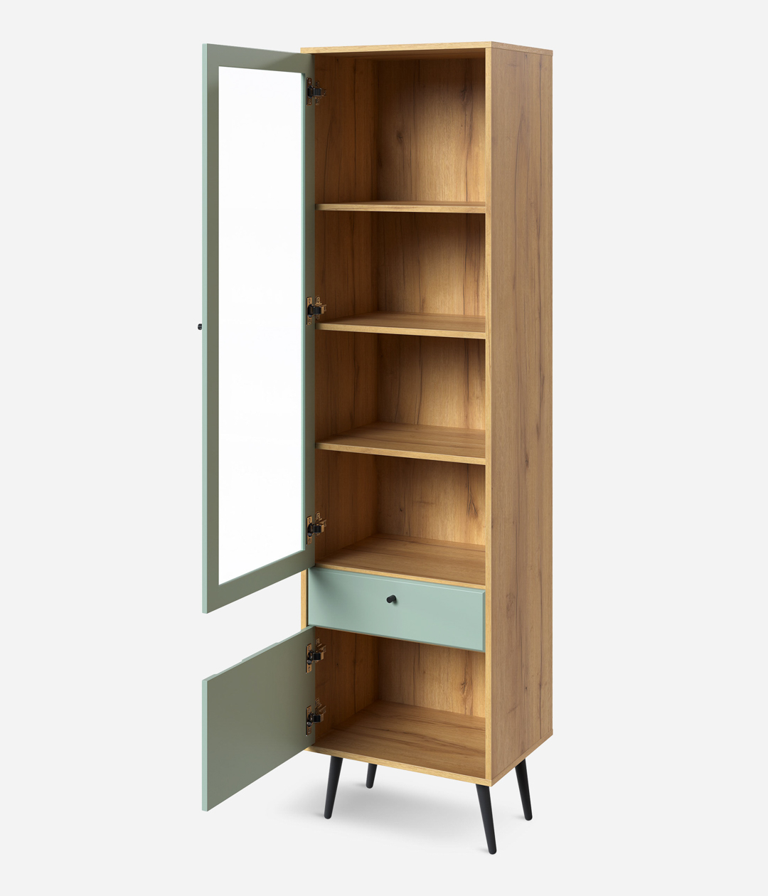 В дизайне витрины Саксония нет ничего лишнего. Такая мебель привлекает внимание своей лаконичностью, позволяющей легко вписать модель в любые современные интерьеры. Особенность шкафа — наличие как закрытых, так и открытых полок.