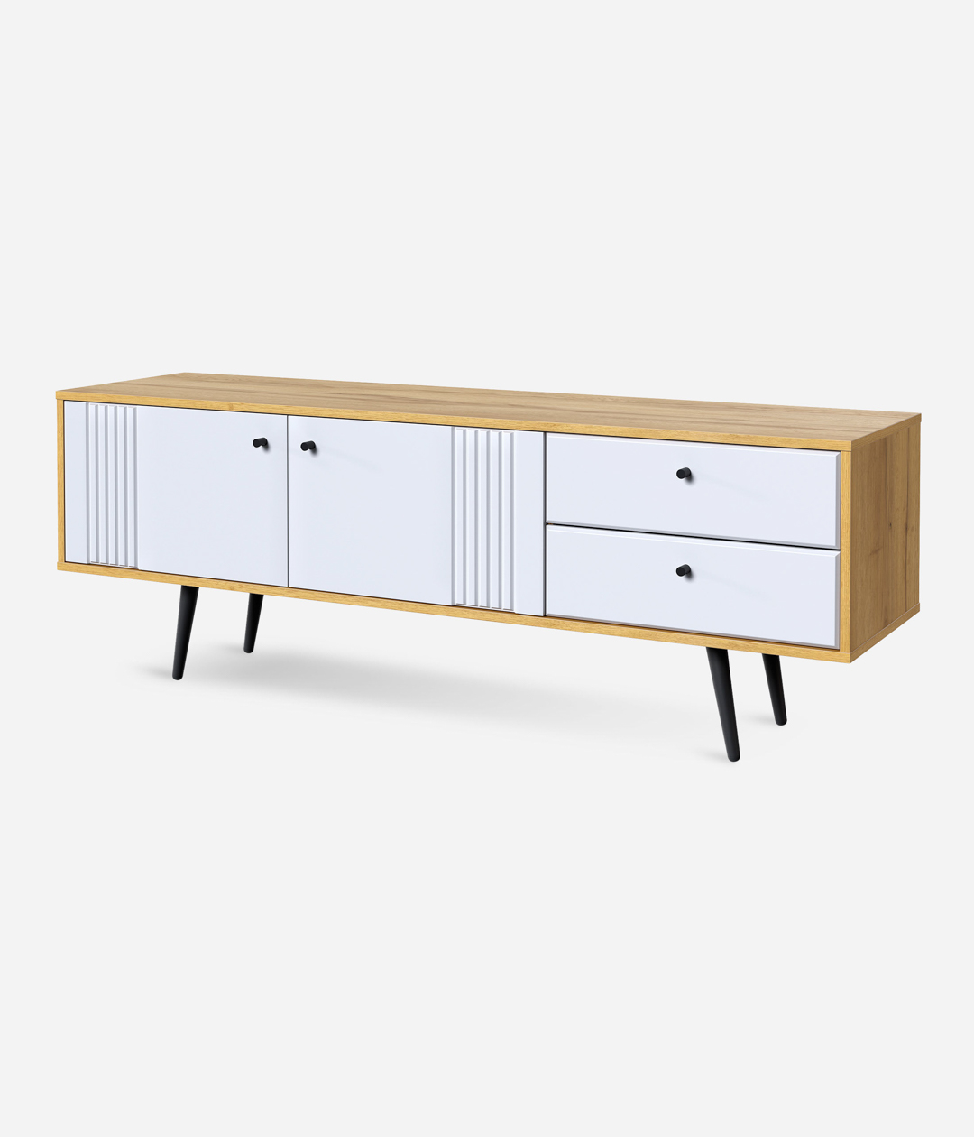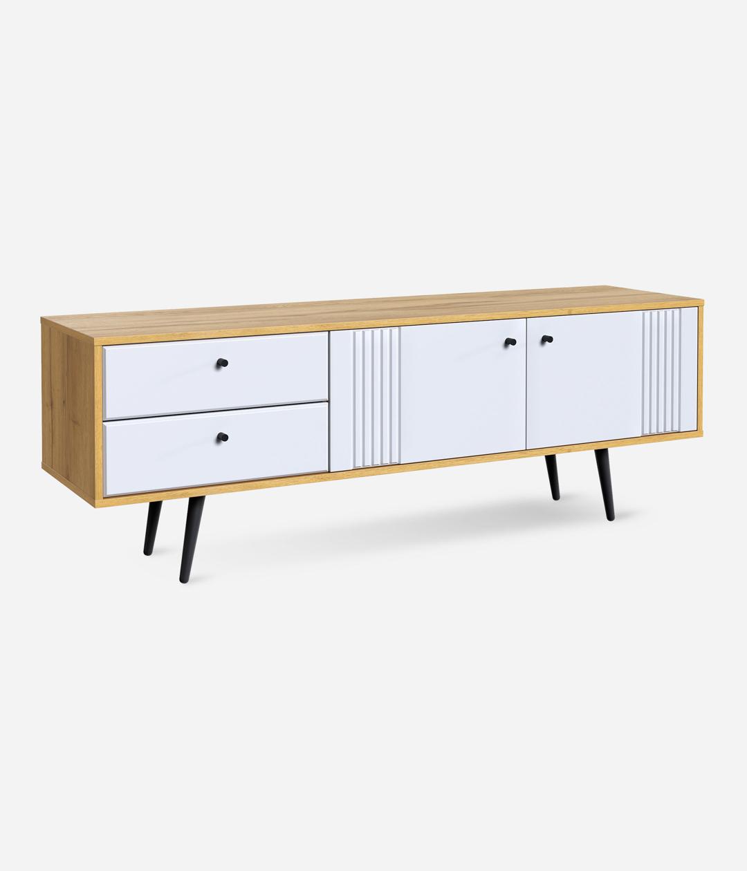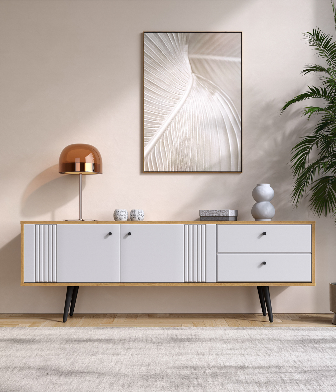 ТВ-тумба «Саксония» выполнена в спокойных тонах в сочетании с элементами из дерева, миниатюрными ручками и ножками. Оригинальный дизайн, в котором отсутствуют стандартные и скучные решения, придаст интерьеру гостиной уютный вид, где тумба с установленным на неё телевизором станет центром мебельной композиции.