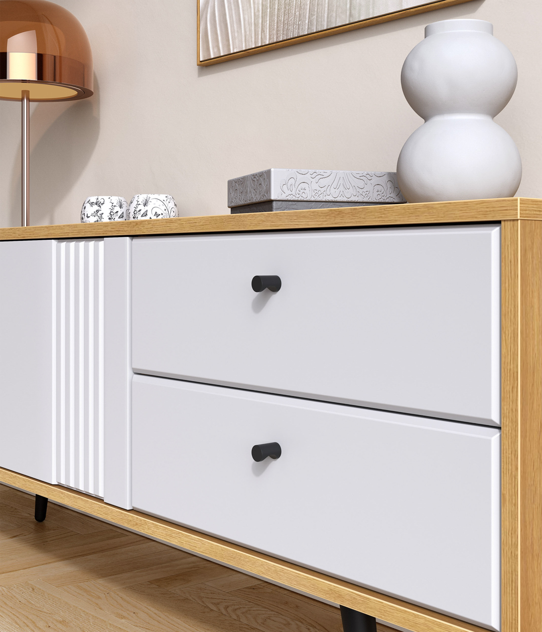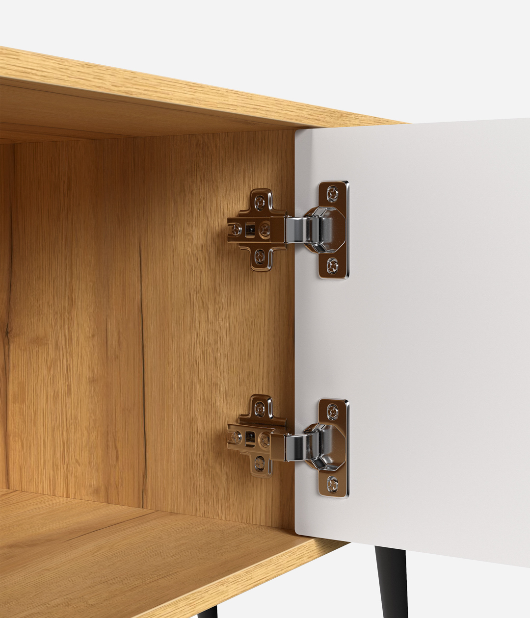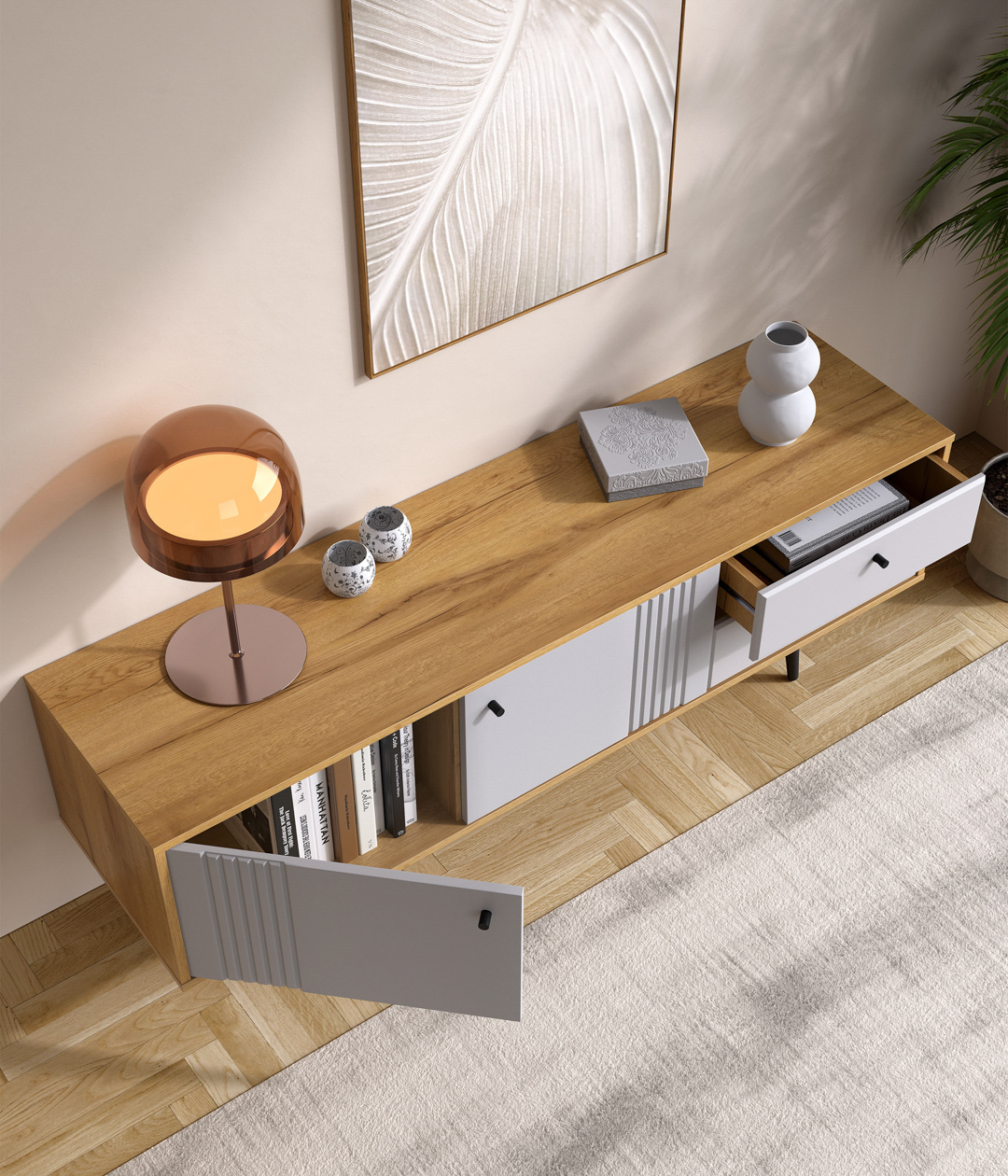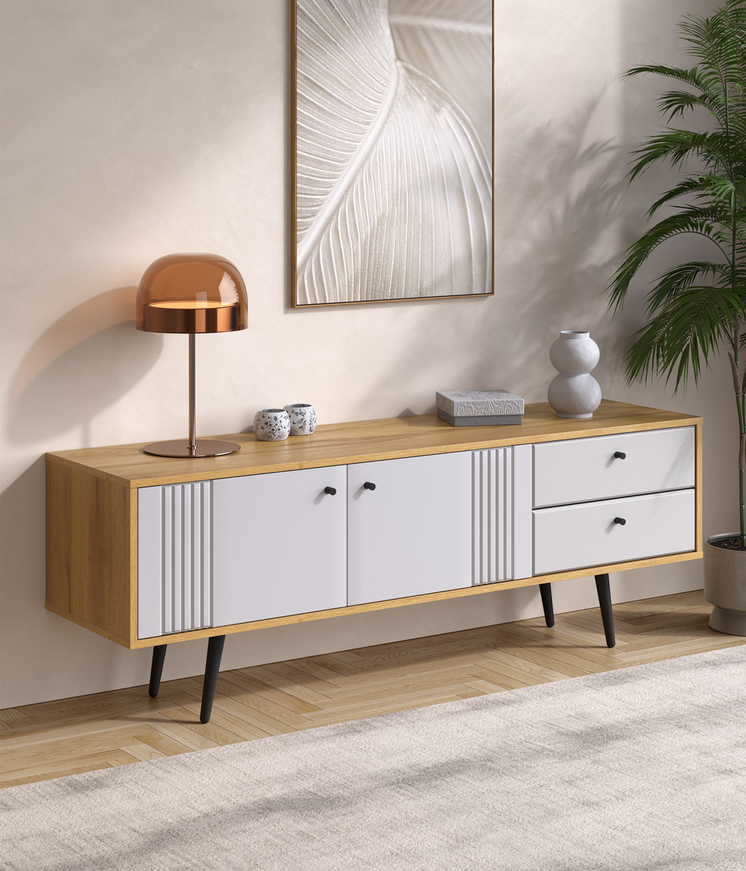 ТВ-тумба «Саксония» выполнена в спокойных тонах в сочетании с элементами из дерева, миниатюрными ручками и ножками. Оригинальный дизайн, в котором отсутствуют стандартные и скучные решения, придаст интерьеру гостиной уютный вид, где тумба с установленным на неё телевизором станет центром мебельной композиции.