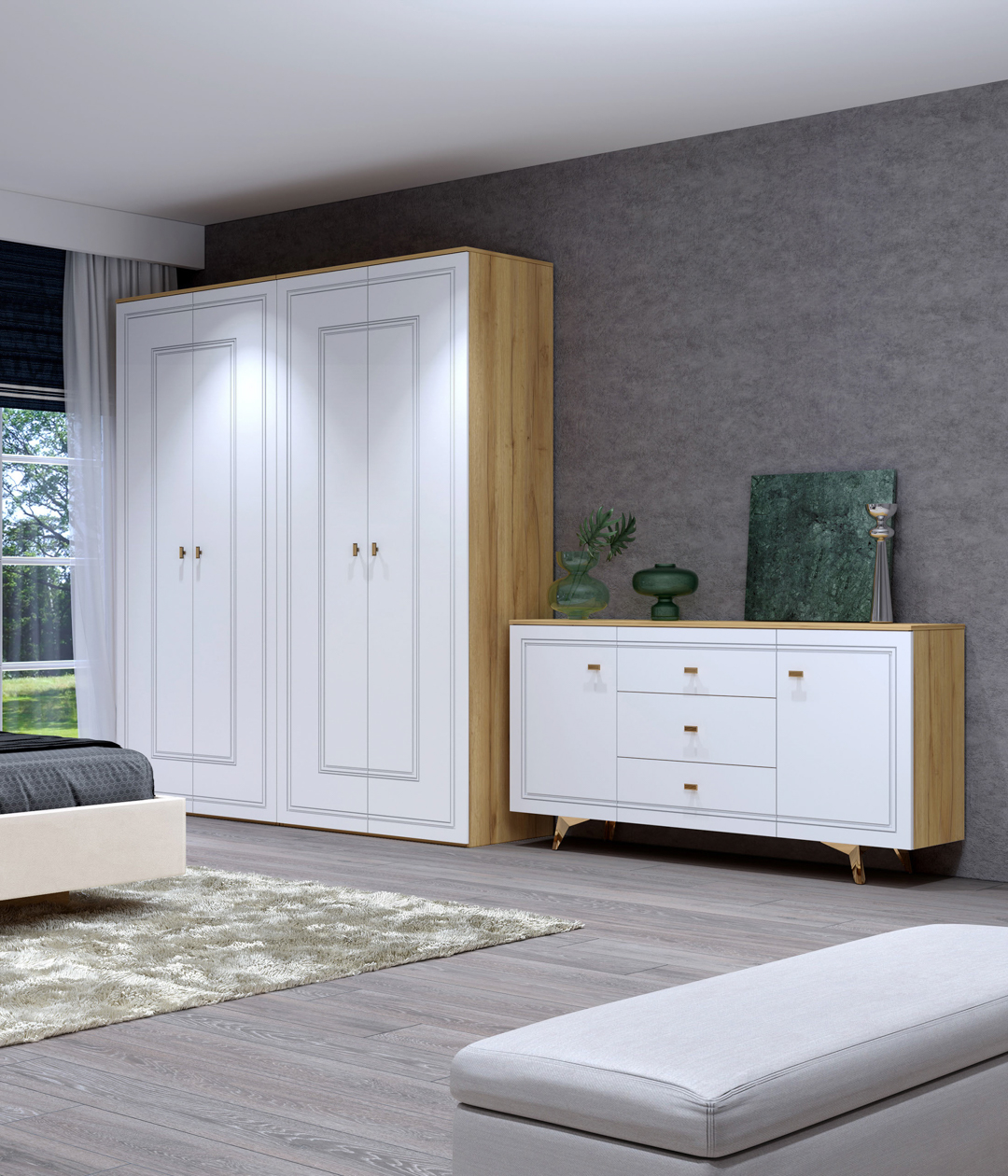 Комодино Вега Сапфир оснащен тремя широкими ящиками и полками, которые помогут поддерживать порядок в вещах. Высокие ножки служат эффектным акцентом модели и упрощают уборку. Тонкие линии фрезеровки и миниатюрные ручки в золотом декоре создают элегантный облик.