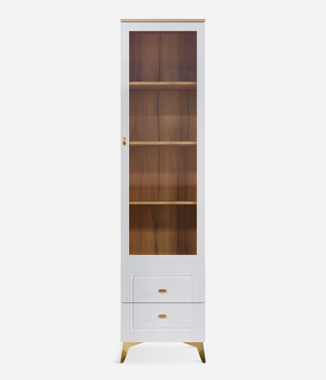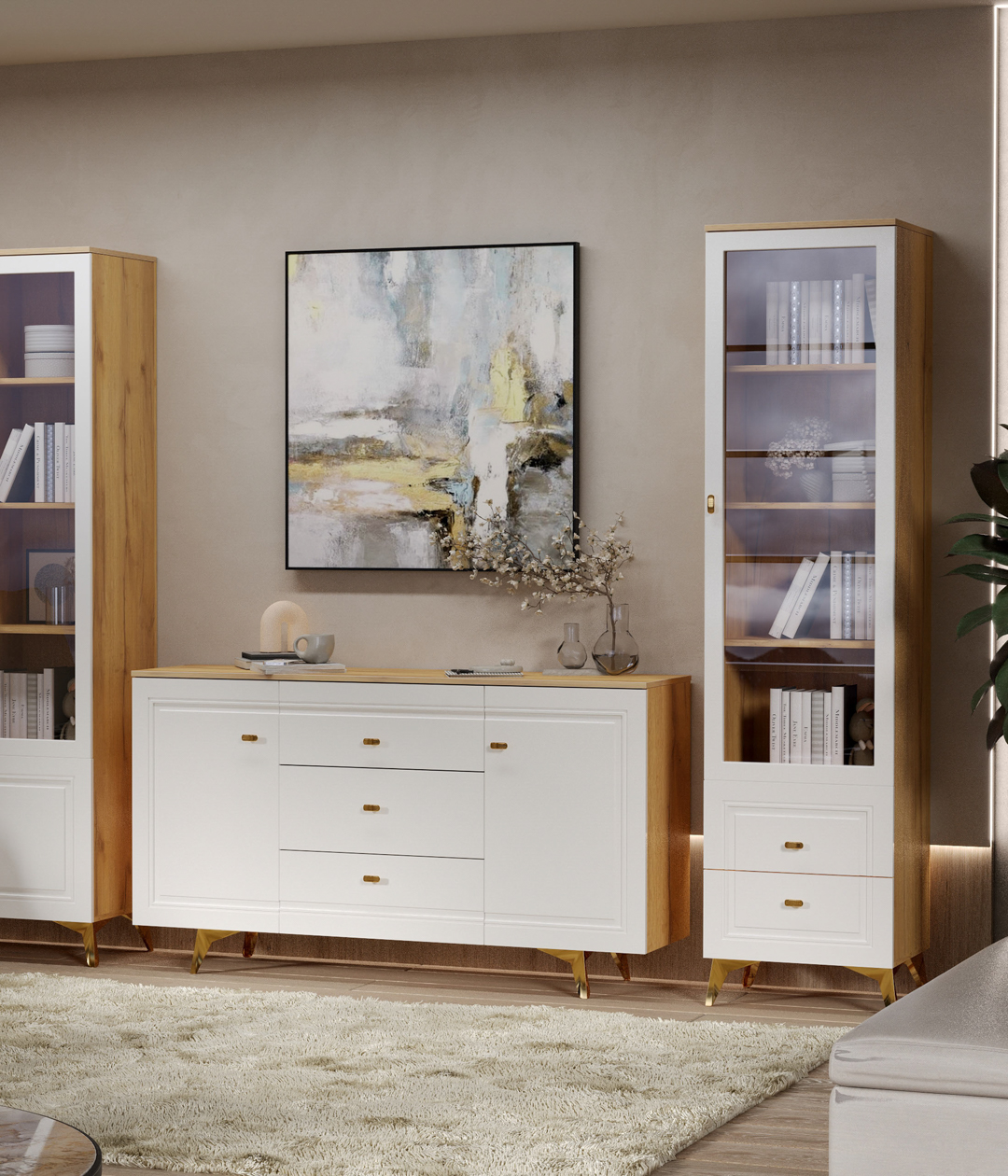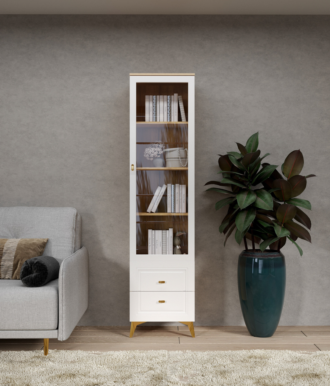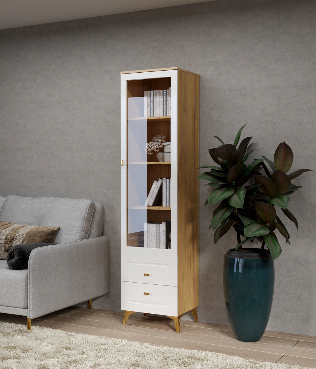 Шкаф-витрина Вега Сапфир станет украшением современной гостиной. Модель представляет идеальный баланс эстетики и комфорта. Фасады с элегантной фрезеровкой дополнены изящными акцентными ручками, что придает интерьеру более статусный вид.