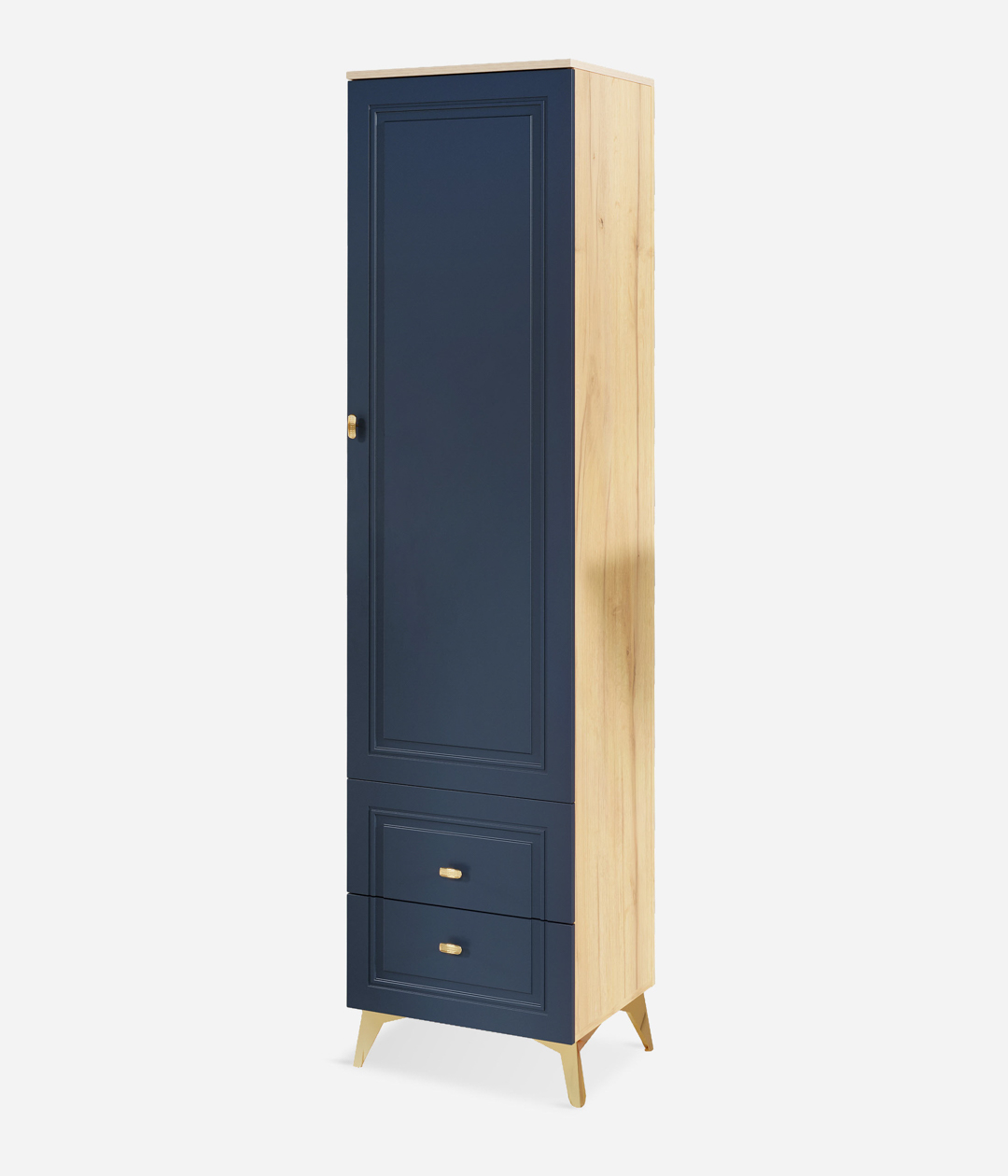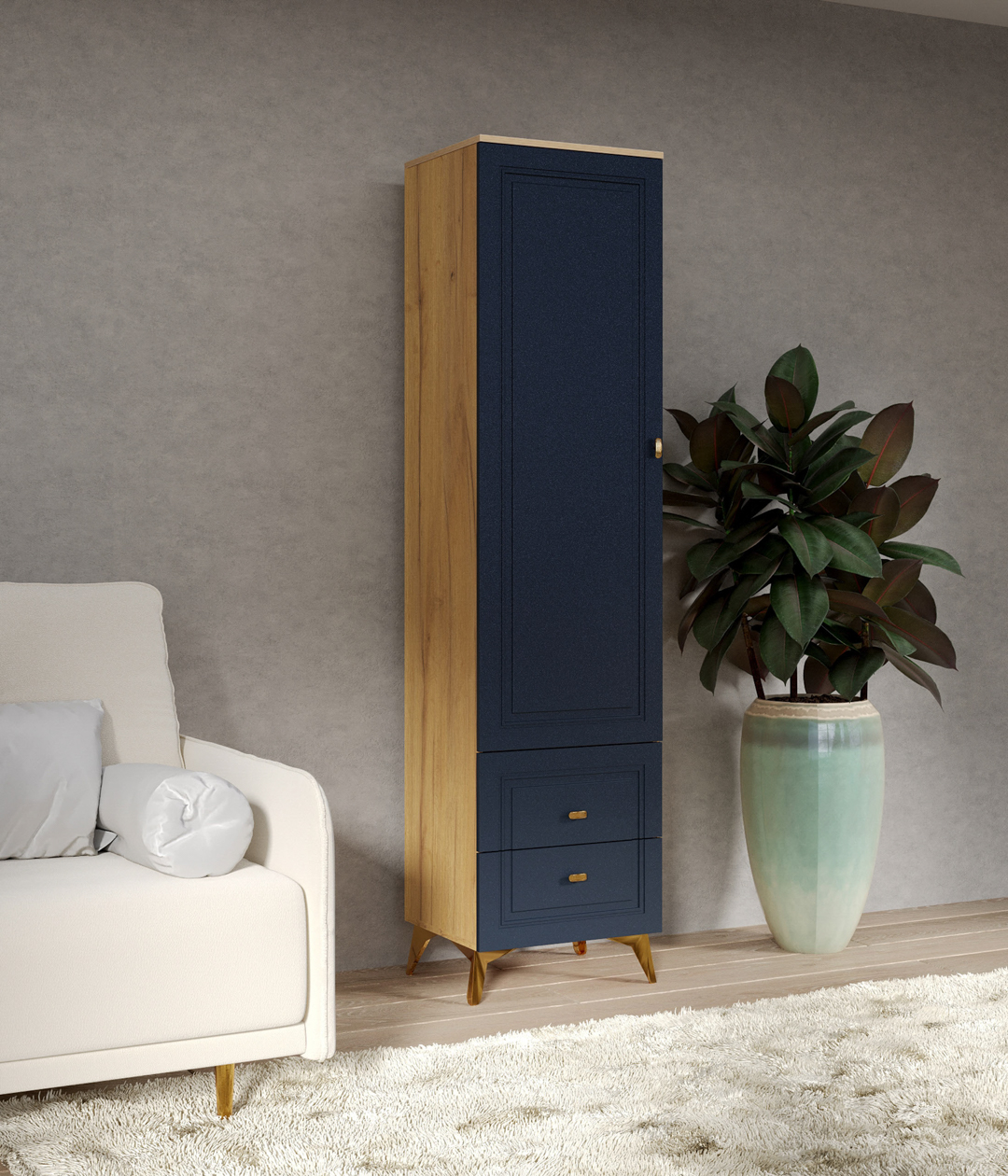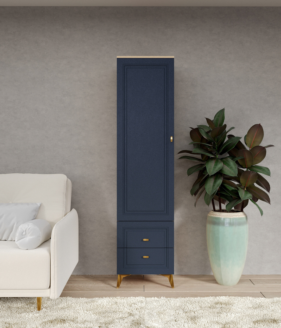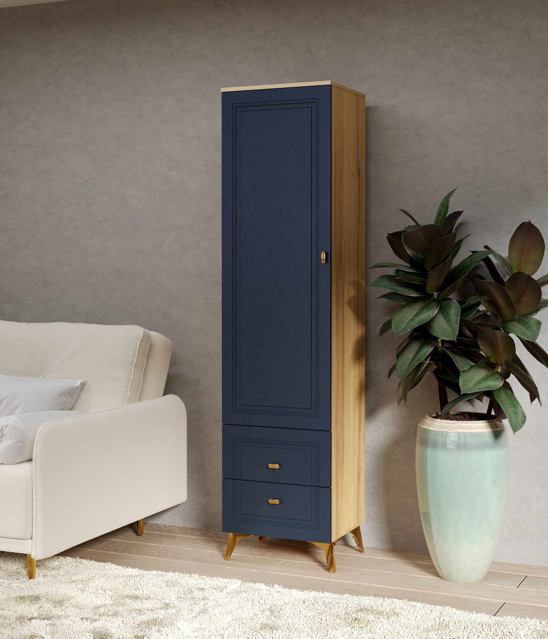 Распашной шкаф Вега Сапфир — изящное решение для интерьера гостиной. Узкая конструкция со строгими рамочными фасадами добавит эстетики и функционала даже небольшой комнате. Комплект полок и выдвижные ящики обеспечат место для предметов гардероба, аксессуаров и украшений.