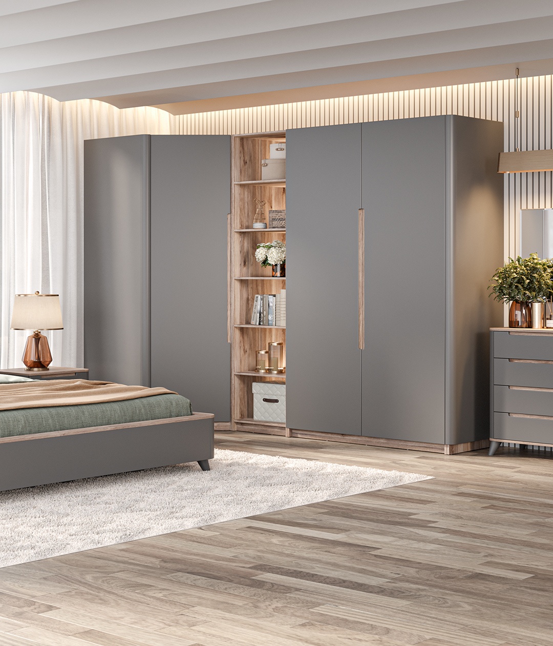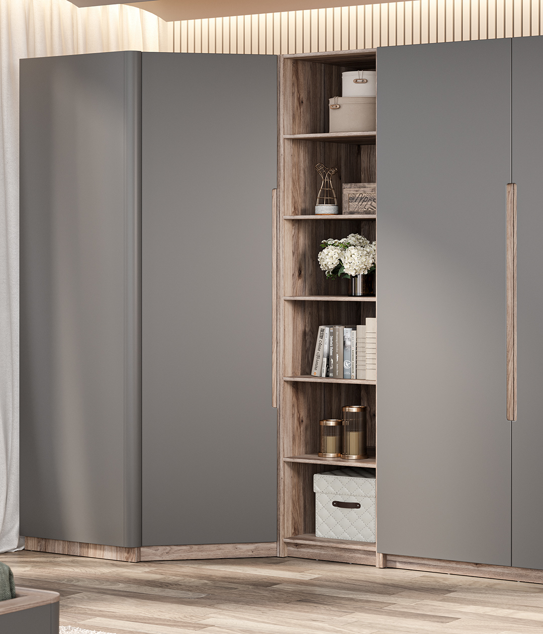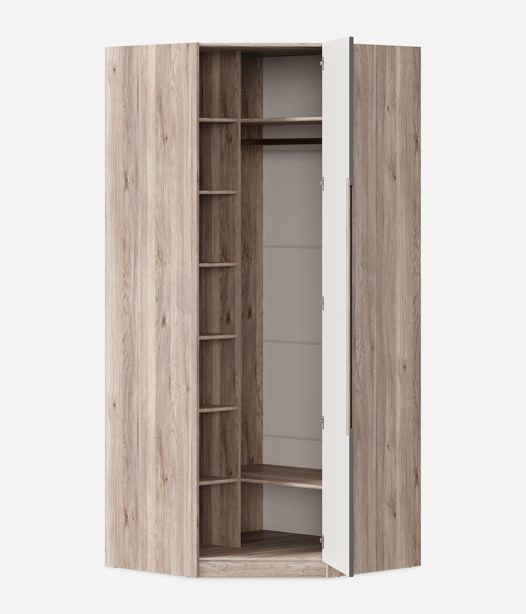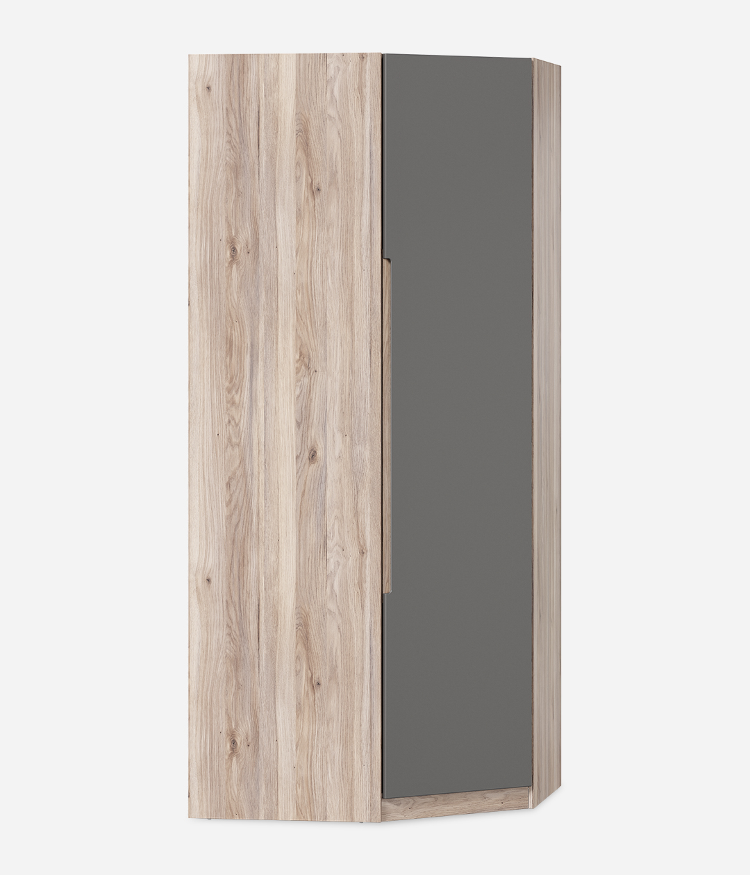 Угловой шкаф Стефания – стильная и компактная модель, которая позволит сэкономить пространство в комнате и при этом добавить обстановке оригинальности. Благодаря необычной геометрии шкаф выглядит небольшим, но у него значительный объём.