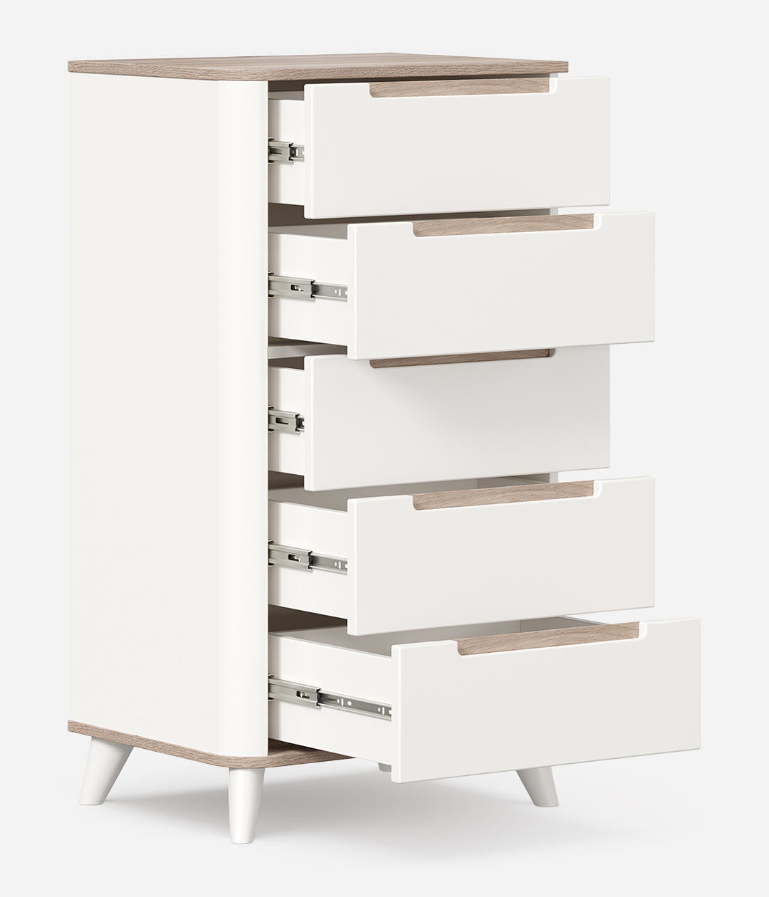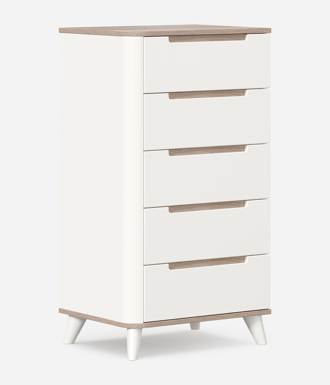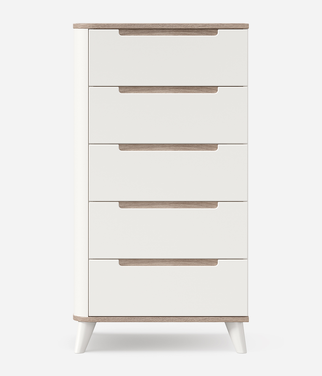 Комод из коллекции Стефания привлекает внимание эффектным дизайном. Отлично смотрится сочетание матовых однотонных элементов и деталей под золотистую древесину, а расставленные в стороны устойчивые ножки придают облику модели некоторую кокетливость.