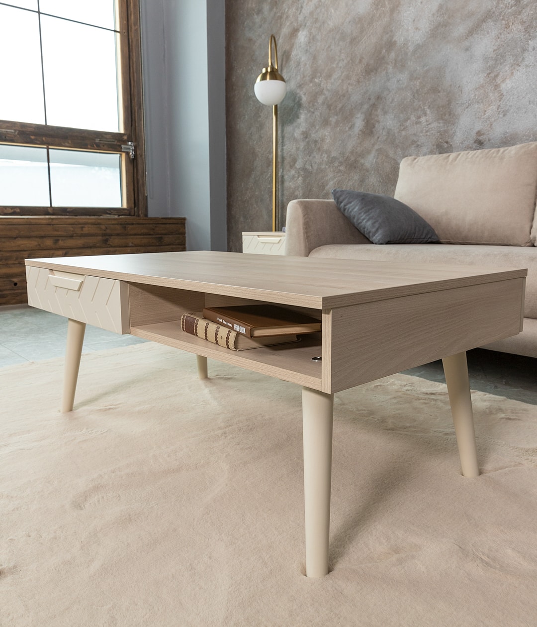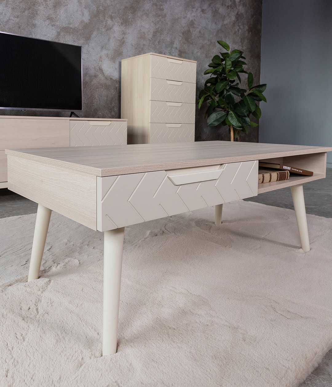 Украшением любой гостиной может стать журнальный столик Сканди. Прямоугольная столешница на изящных ножках комфортной высотой 45см, с удобной полочкой под столешницей и ящиком. Несколько вариантов фасадов и скандинавский стиль столика будет прекрасно сочетаться с большинством стилистик современных гостиных комнат.