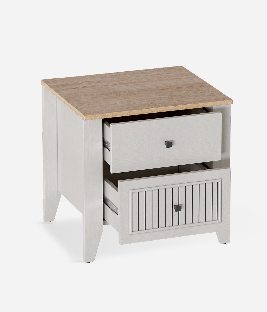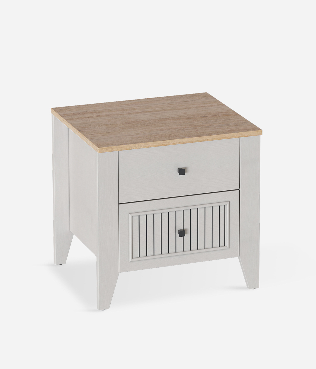 Прикроватная тумба Валенсия в цвете Персидский жемчуг / Дуб натуральный светлый с изящной фрезеровкой на фасадах. Тёплый оттенок с красивой древесной текстурой удачно подчеркивает атмосферу уюта и комфорта, а чёрные стильные ручки придают законченный вид. На крышке органично будут смотреться предметы интерьера и аксессуары.