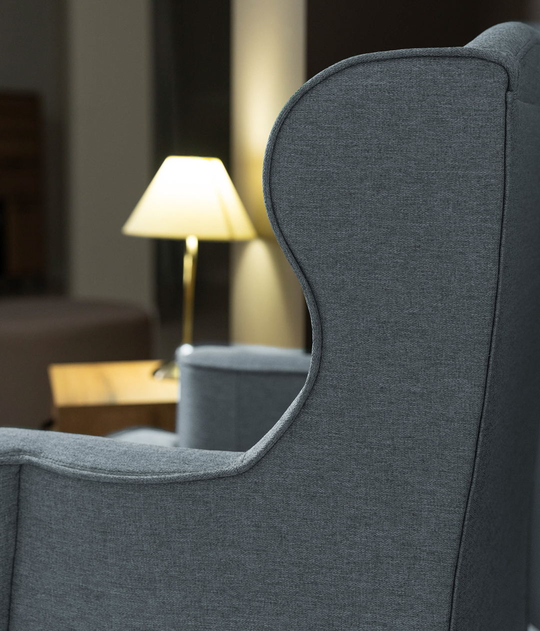 Высокие ножки кресла делают его форму легкой, максимально открывая пространство. К тому же, такая конструкция упрощает уборку, делая доступным напольное покрытие.