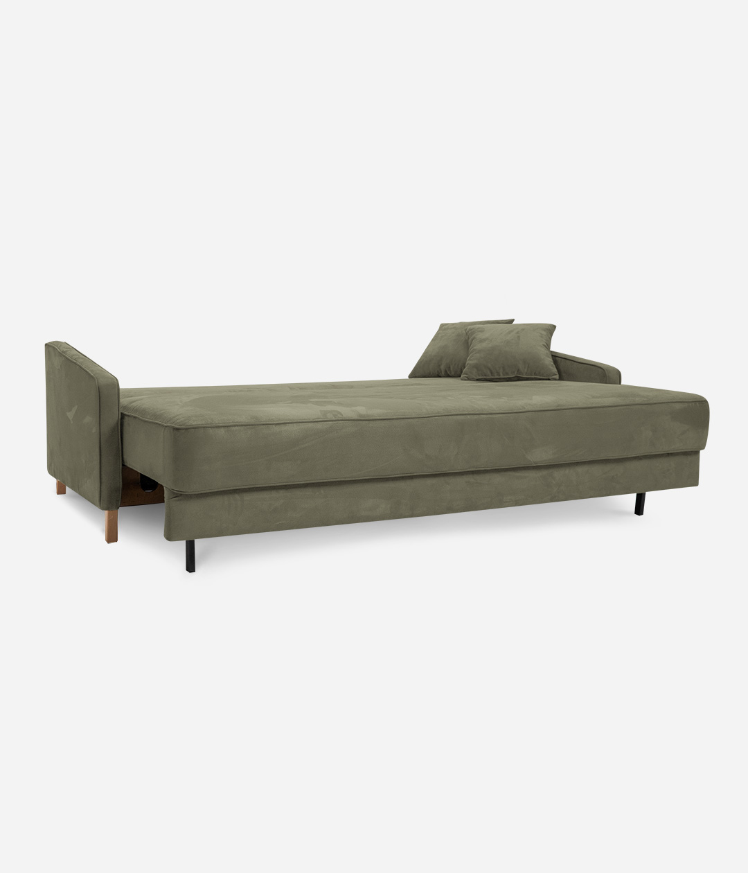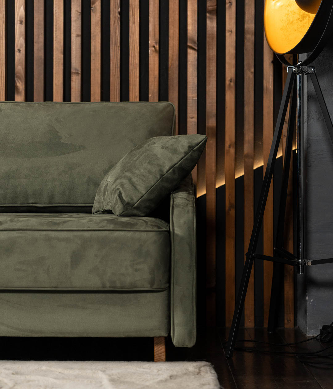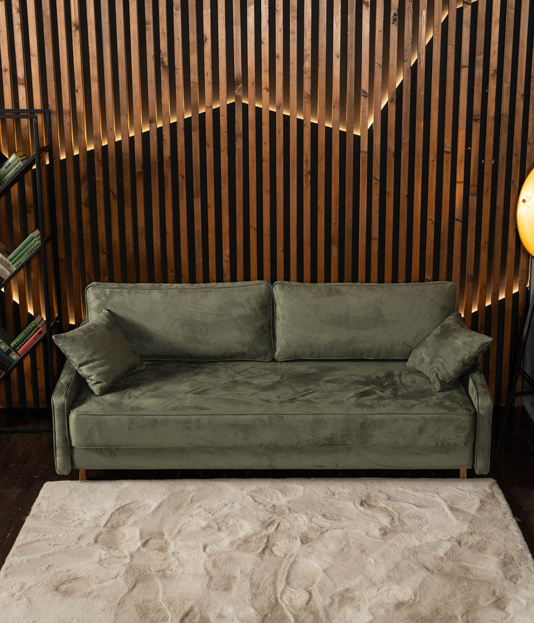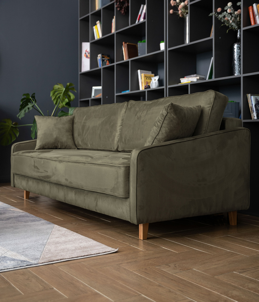 Высокие ножки дивана делают его форму легкой, максимально открывая пространство. А натуральное дерево подчеркивает естественность материалов. Кроме того, такая конструкция упрощает уборку, делая доступным напольное покрытие.