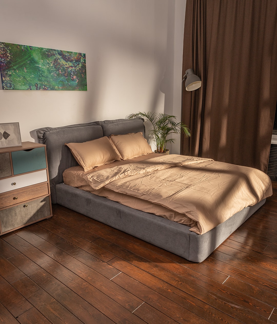 Кровать Аврора в стиле лофт привнесет в вашу спальню атмосферу уюта и роскоши, став символом семейного тепла и традиций. Двойное изголовье, обрамленное декоративным кантом с вывернутыми швами, добавит мягкости и теплоты в ваш интерьер, подчеркивая его уникальность и стиль.