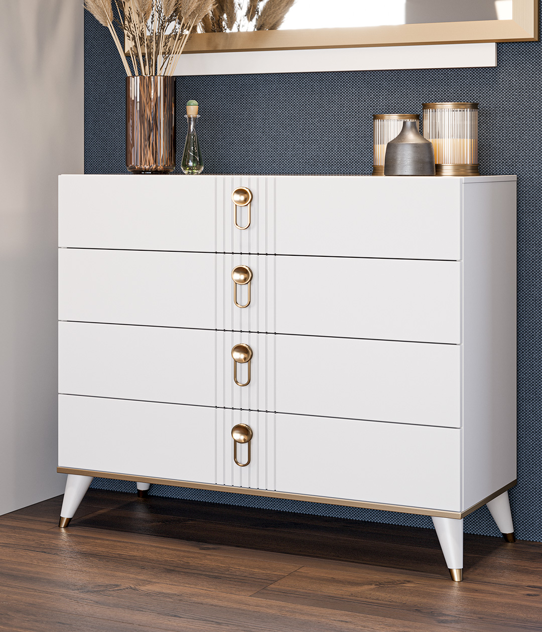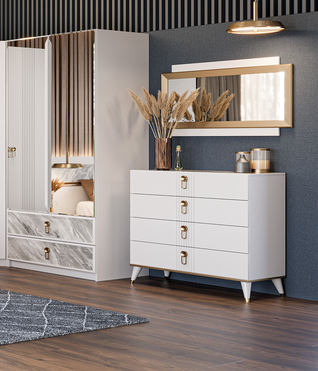 Комод «Айла» с ящиками подойдет для создания уникального интерьера в стиле эклектика. Вместительные четыре ящика помогут бережно хранить множество разных вещей. Крышка комода стилизована под мраморное покрытие. Фрезерованные фасады изящно сочетаются с металлической ручкой, ножки с золотой окантовкой завершают элегантный стиль модели.