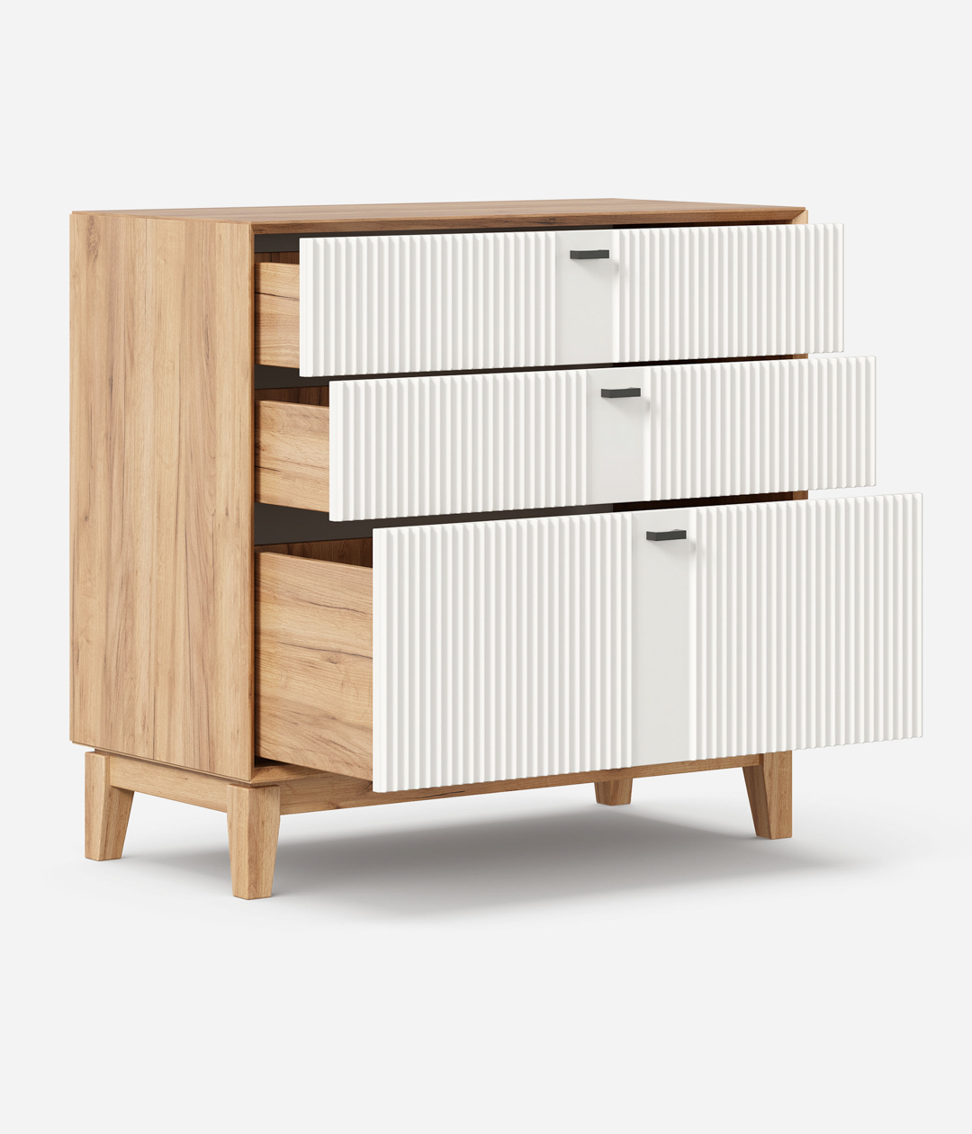 Функциональный и надежный комод Бари — это залог уютного и аккуратного интерьера. Вместительные ящики оснащены современными шариковыми направляющими, которые обеспечивают лёгкое и практически бесшумное скольжение, а также его полное выдвижение. Высокие ножки не перегружают обстановку и позволяют удобно проводить уборку.