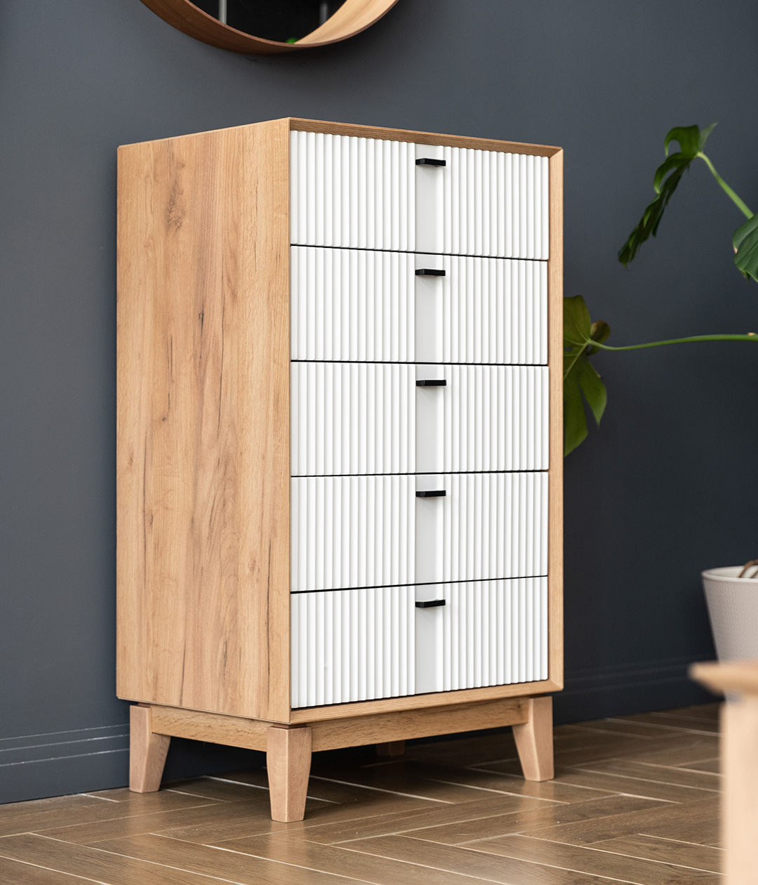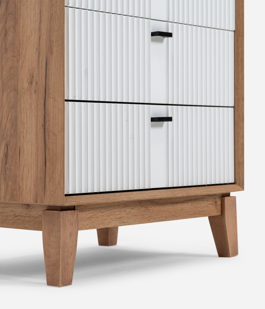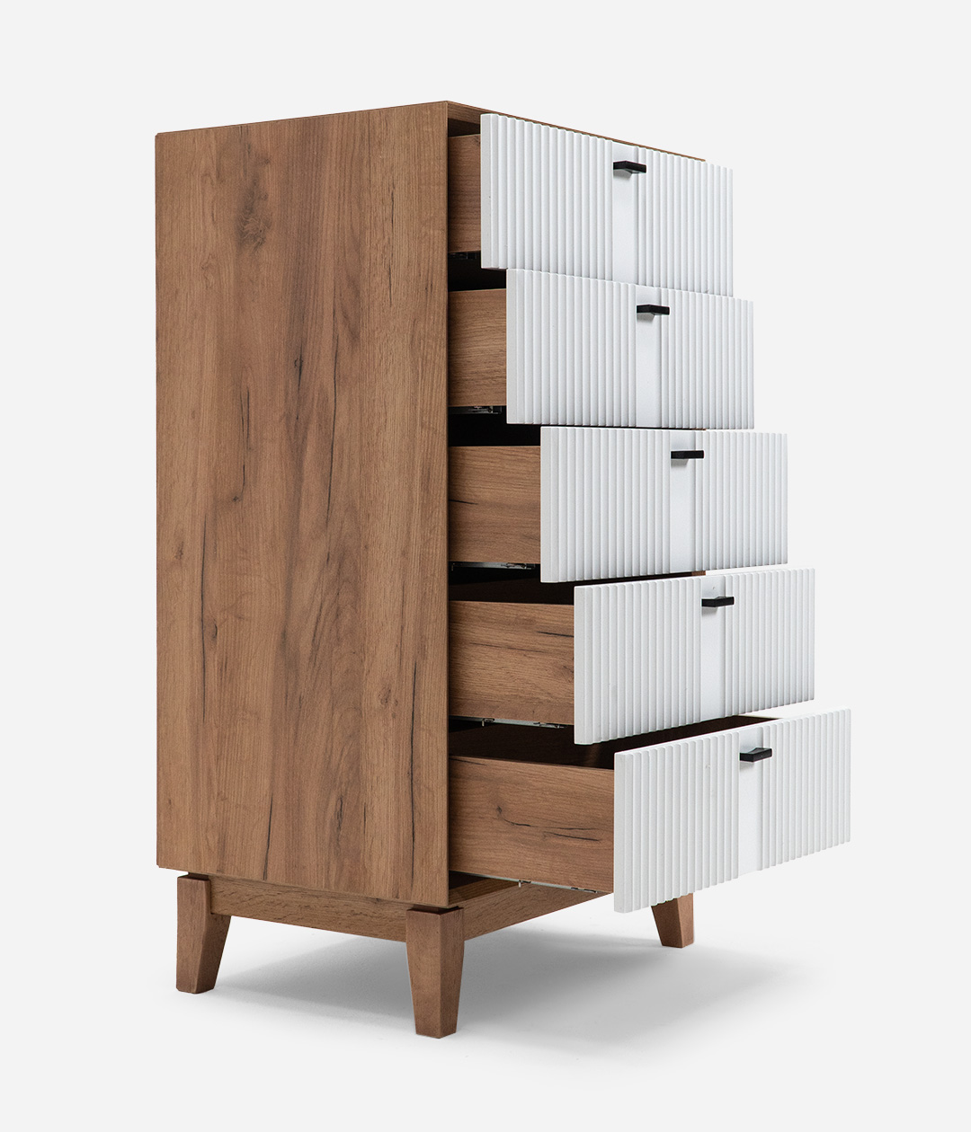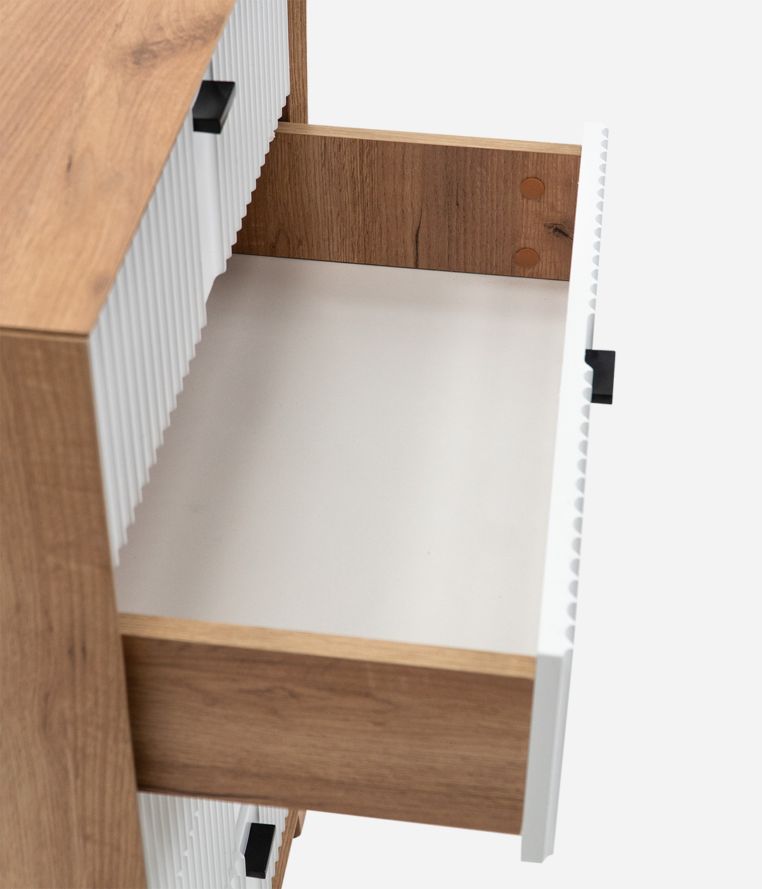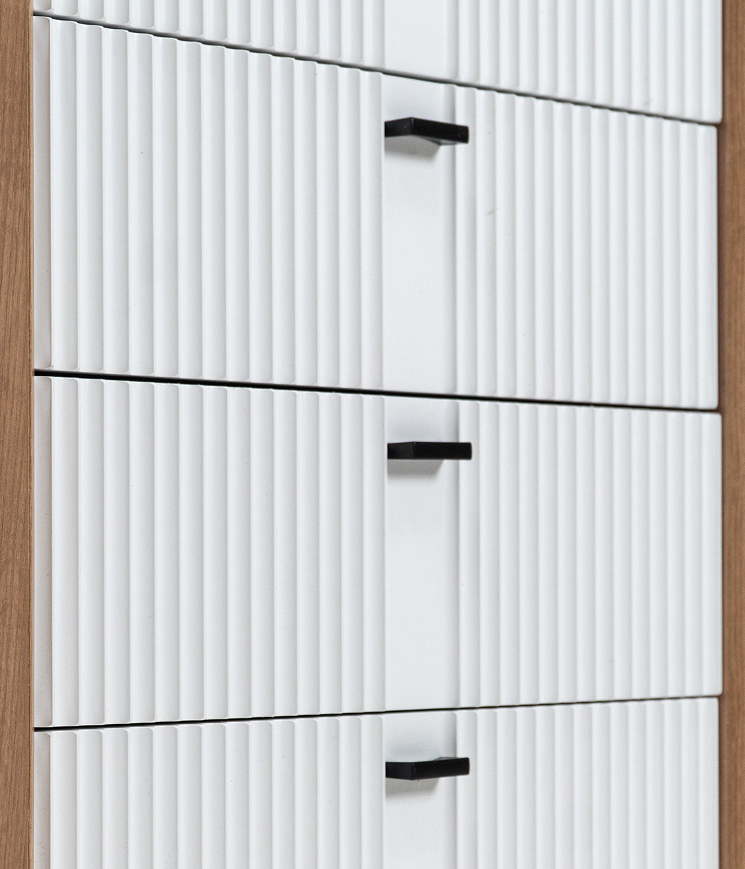 Комод Бари станет практичным дополнением спальни или гостиной. Модель имеет небольшую глубину, что позволит разместить его даже в условиях небольшого пространства. Вместительные ящики оснащены современными шариковыми направляющими, которые обеспечивают легкое и практически бесшумное скольжение, а также его полное выдвижение.