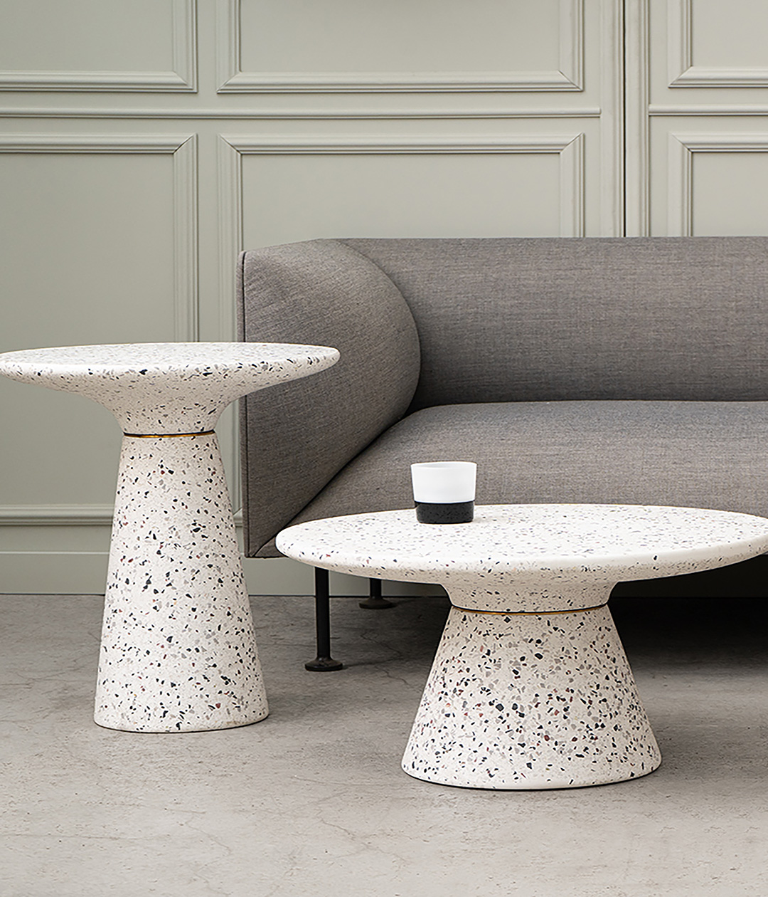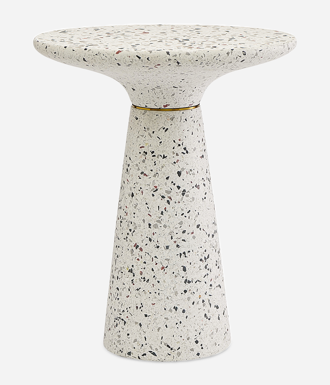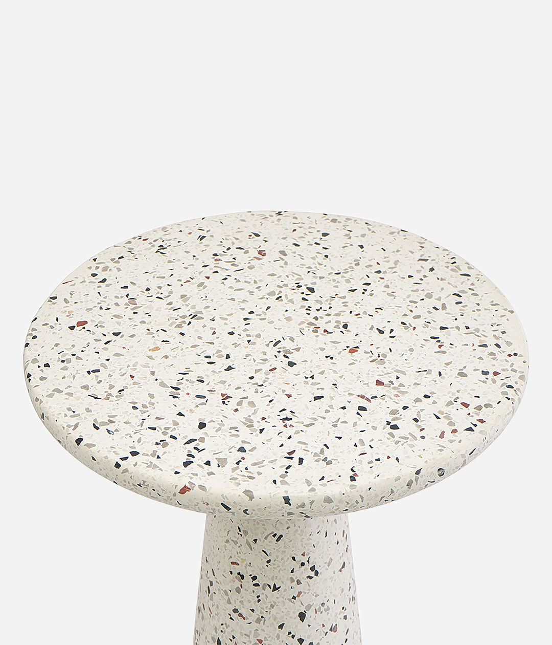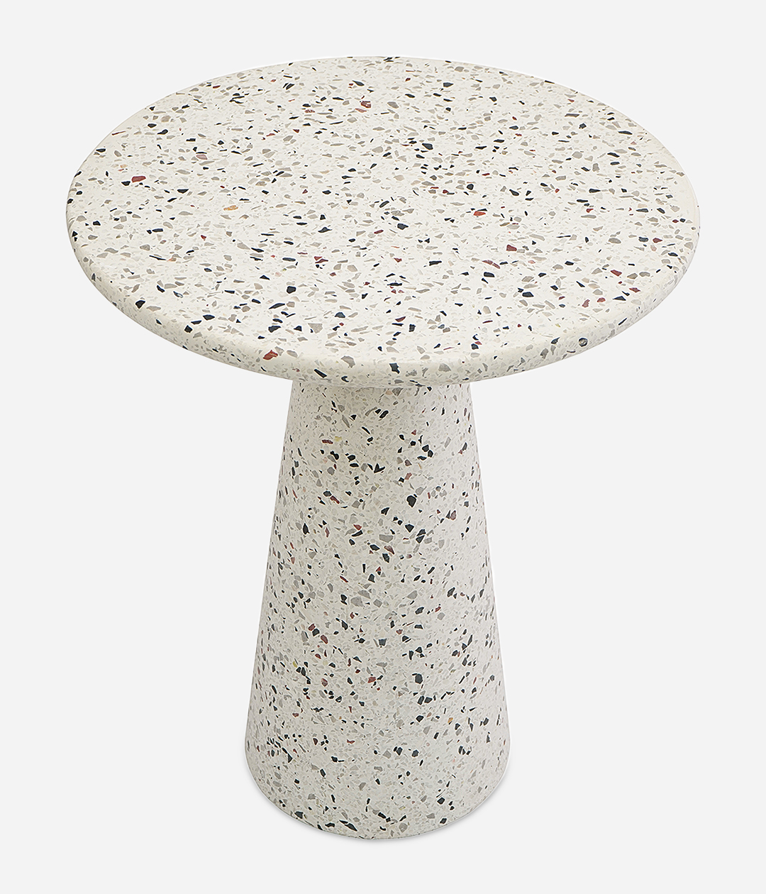 Столешница и основание столика выполнены из материала терраццо, характеризующегося высокой прочностью и устойчивостью к износу. В его состав входят мелкие кусочки натурального камня, скрепленные цементным раствором с добавлением пластификаторов.
