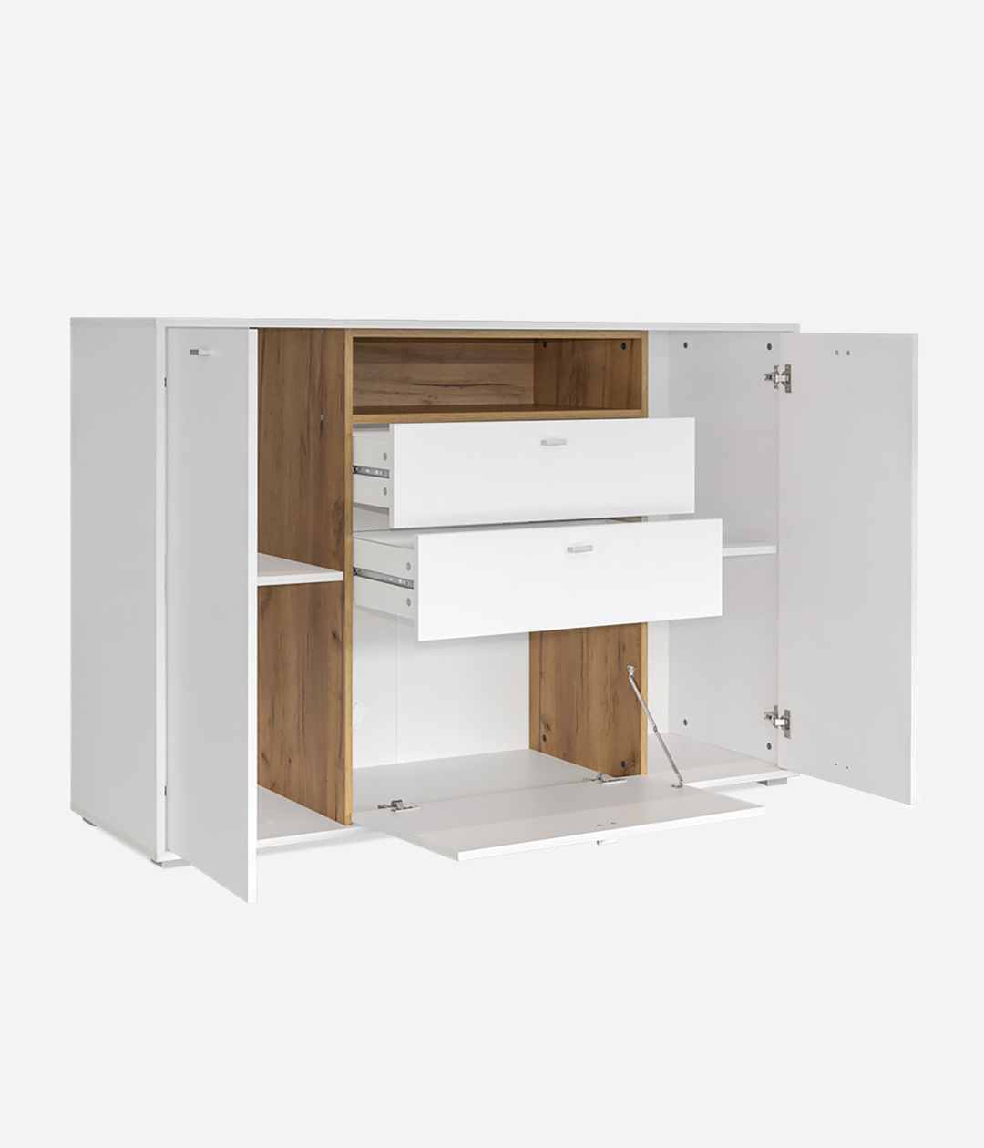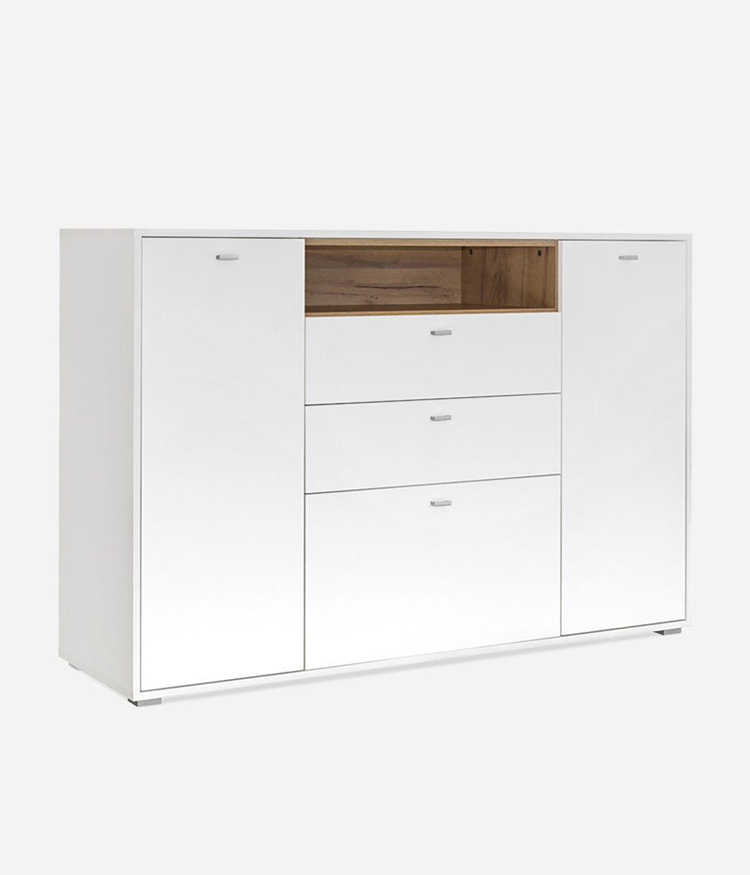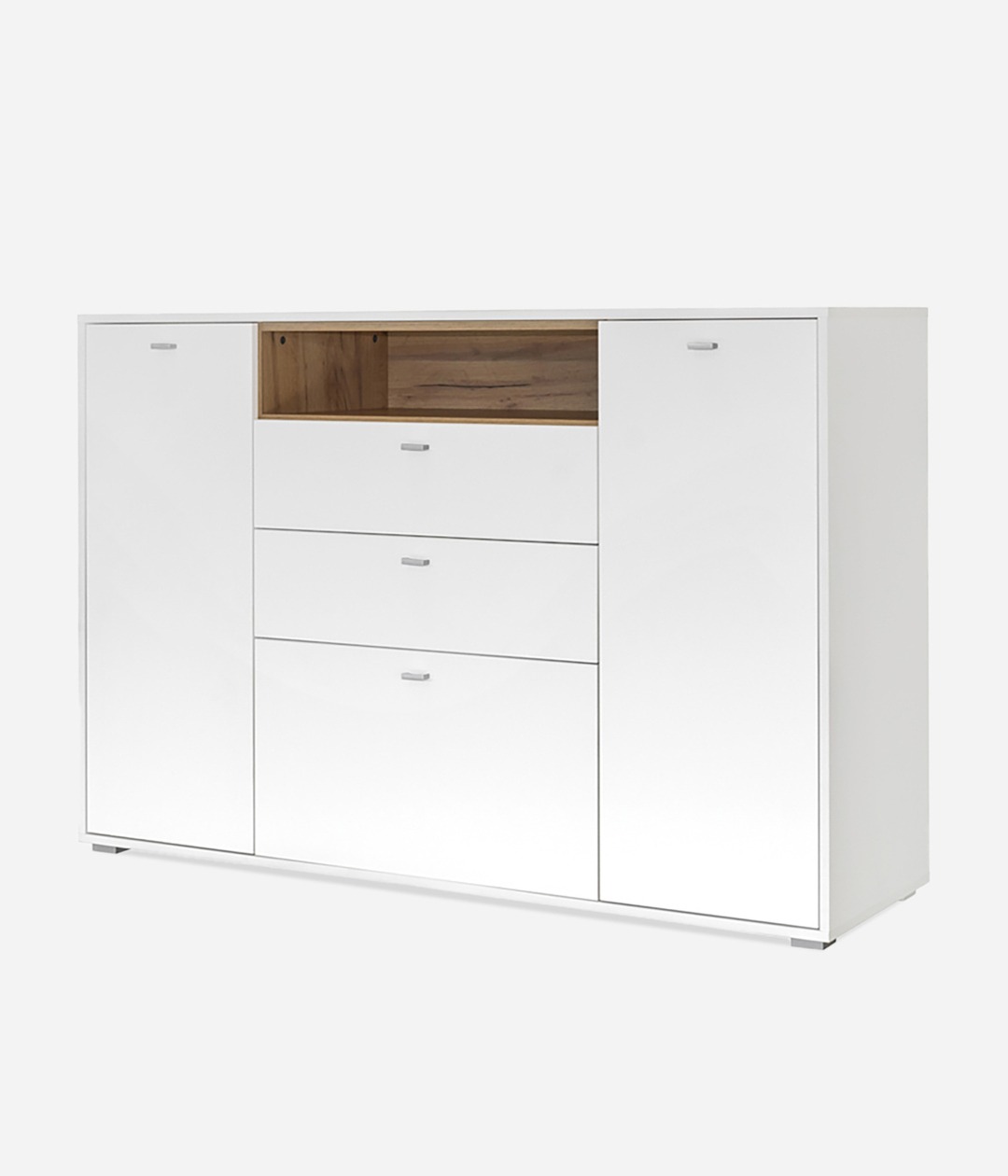Организовать рациональное хранение вещей поможет широкий комод Бэль. Комбинированное наполнение предусматривает выдвижные ящики и закрытые отделения для размещения белья, постельных принадлежностей и сложенных вещей.