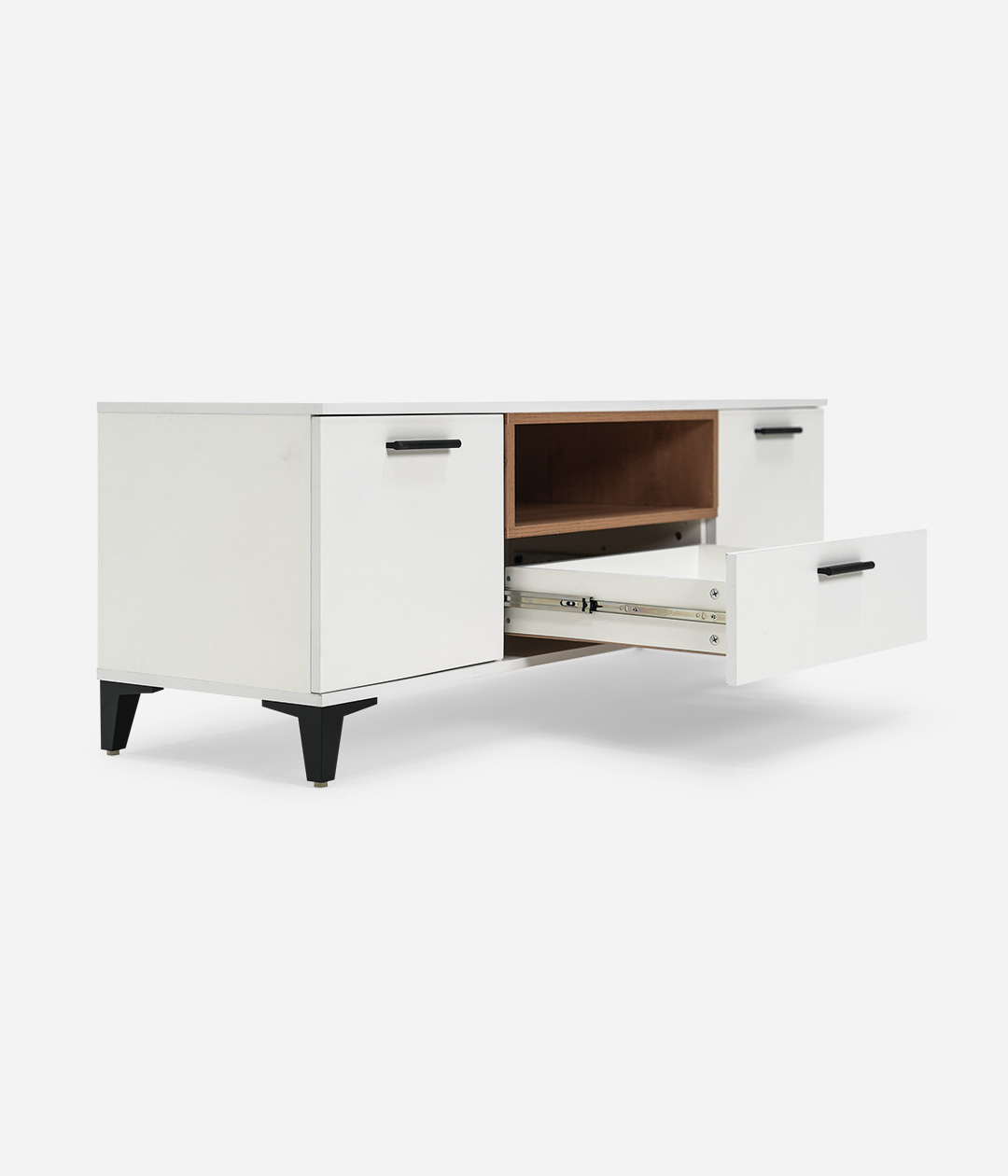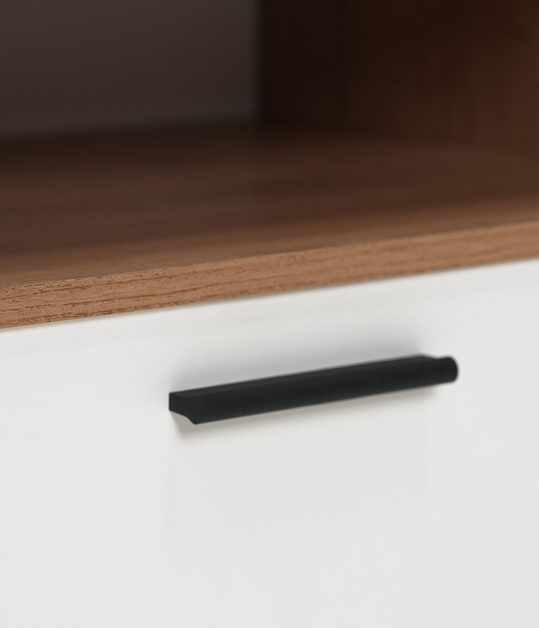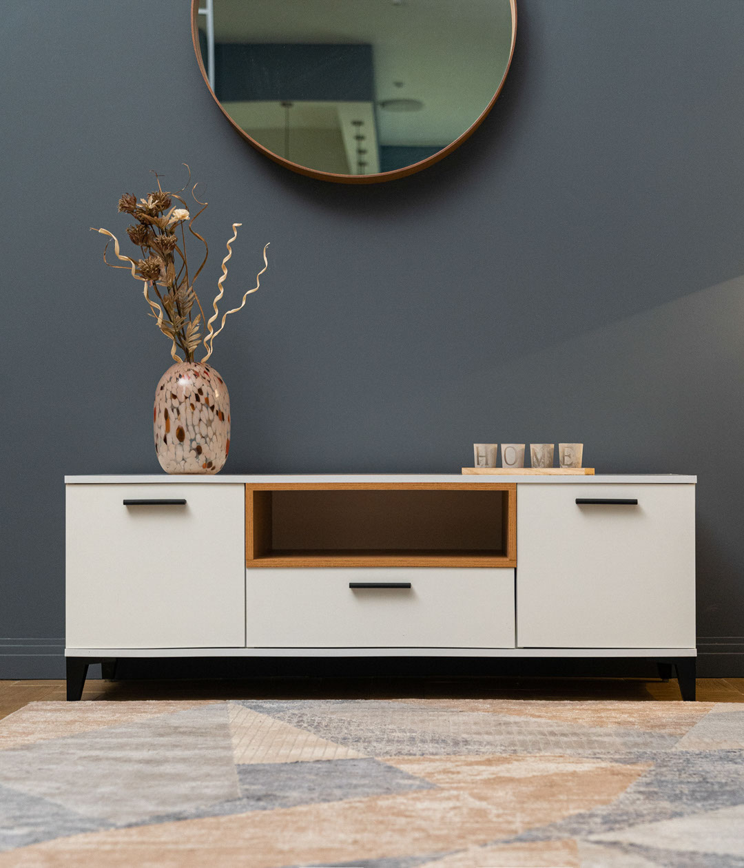 Продуманная конструкция и минимальные габариты делают тумбу функциональной и стильной. Простые геометрические формы, нейтральные цвета с ярко выраженными элементами, в виде контрастных вставок и ручек, подойдут для светлых и тёмных интерьеров. Характерная особенность тумбы Берген - комбинация полок и ящиков. На полках можно размещать предметы декора, книги, а также памятные вещи. Вместительная ниша за распашными дверями будет удобна для хранения необходимых мелочей.