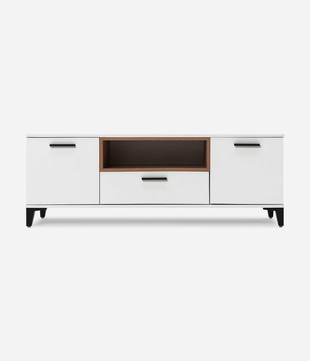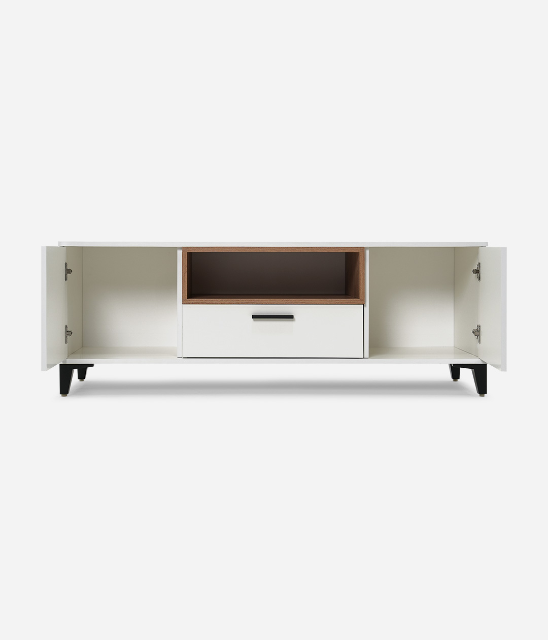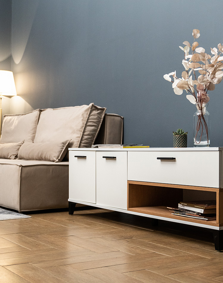 Продуманная конструкция и минимальные габариты делают тумбу функциональной и стильной. Простые геометрические формы, нейтральные цвета с ярко выраженными элементами, в виде контрастных вставок и ручек, подойдут для светлых и тёмных интерьеров. Характерная особенность тумбы Берген - комбинация полок и ящиков. На полках можно размещать предметы декора, книги, а также памятные вещи. Вместительная ниша за распашными дверями будет удобна для хранения необходимых мелочей.