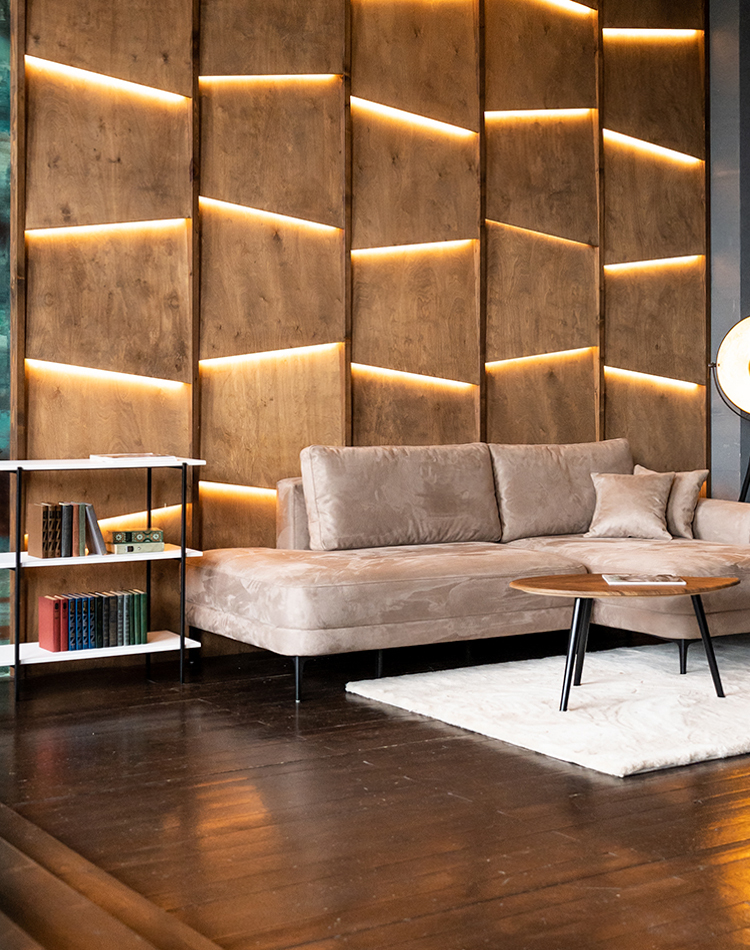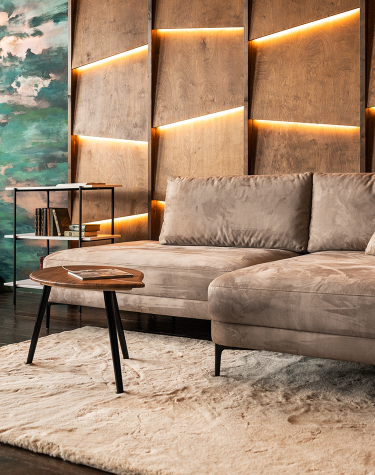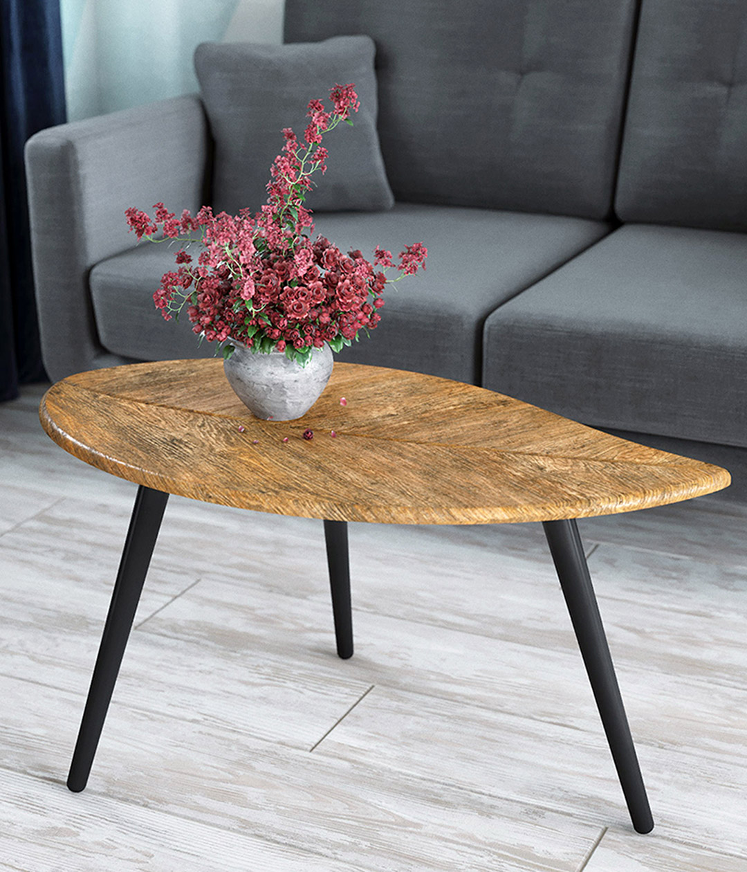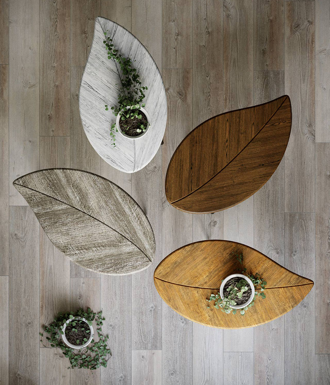 Особенностью дизайнерского решения является оригинальное сочетание фрезеровки столешницы в форме листа дерева и текстуры декоративного покрытия.