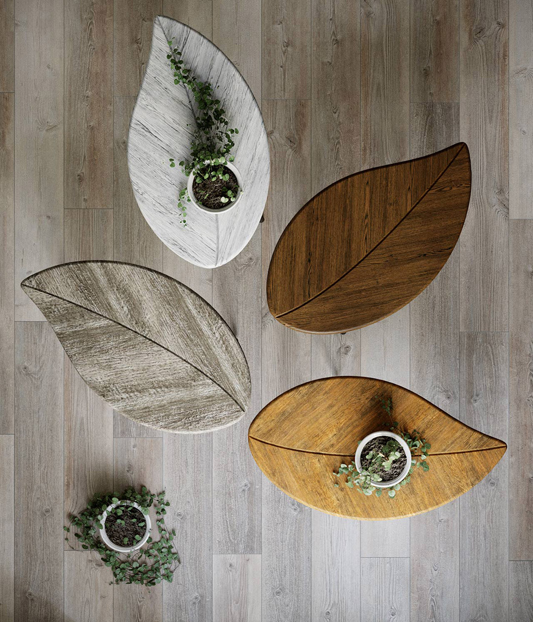 Особенностью дизайнерского решения является оригинальное сочетание фрезеровки столешницы в форме листа дерева и текстуры декоративного покрытия.