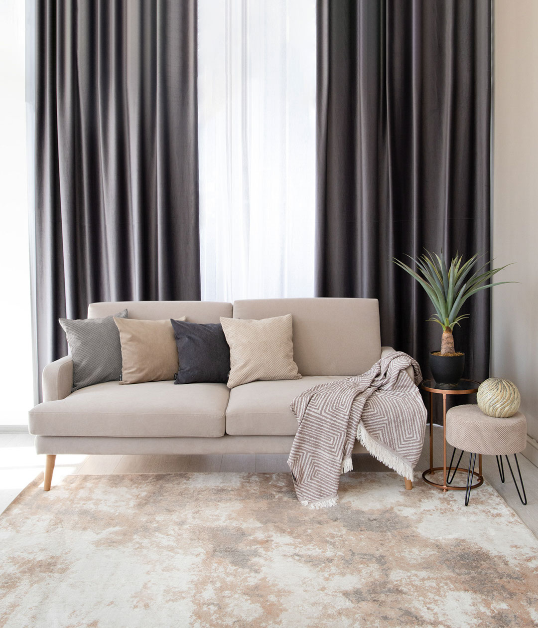 Имитация мрамора или же легкая динамичная абстракция? В BERNE VEGA каждый увидит что-то своё. Но одно можно сказать точно: ковёр невероятно красивый и актуальный. Он совместил в себе лаконичный дизайн, благородную фрактуру и тёплые песочные оттенки. Он идеально подойдёт для светлого современного интерьера, добавляя пространству целостности и завершенности.