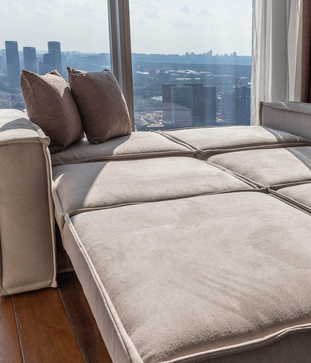 В собранном виде занимает очень маленькую площадь, в разложенном — образует просторное и удобное спальное место для двоих.