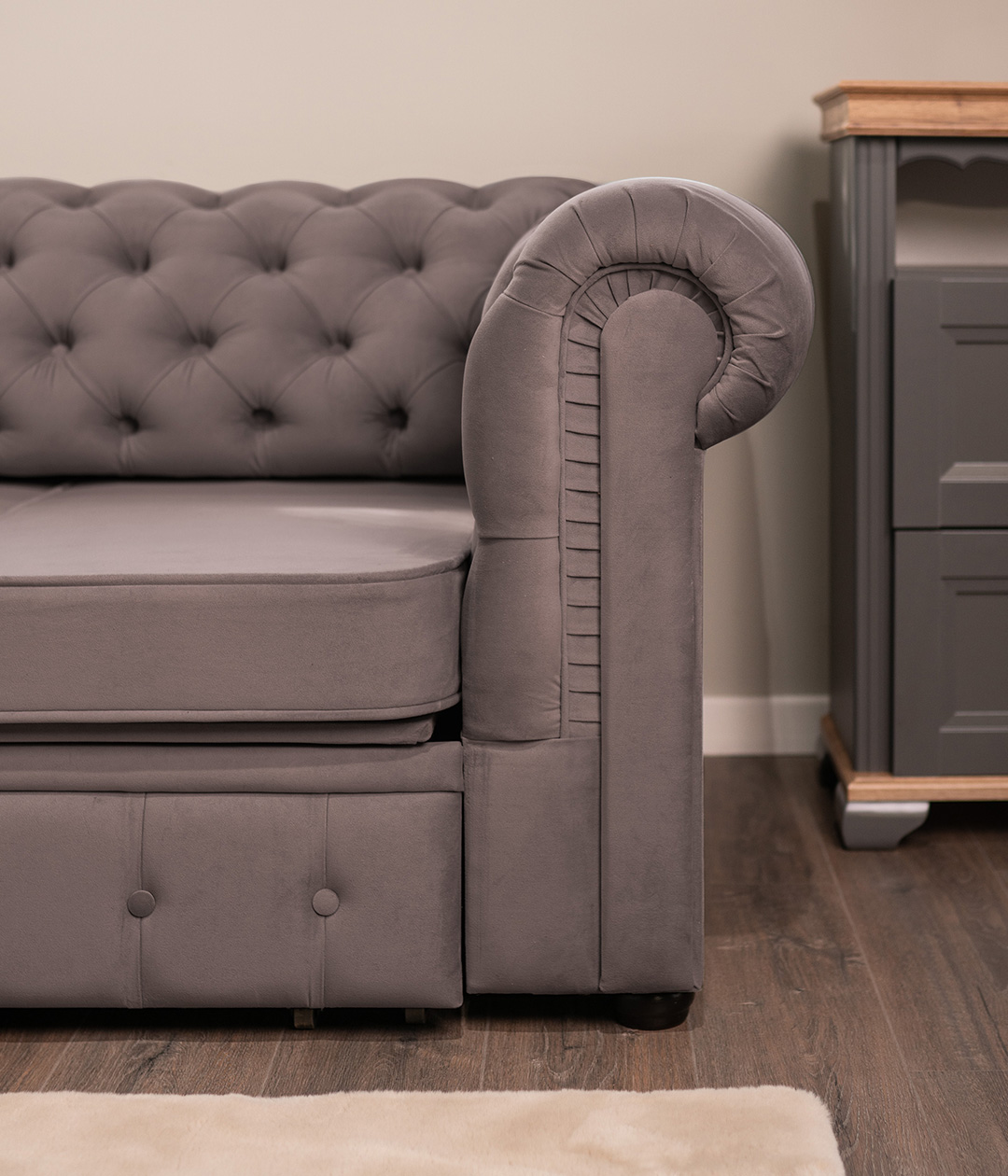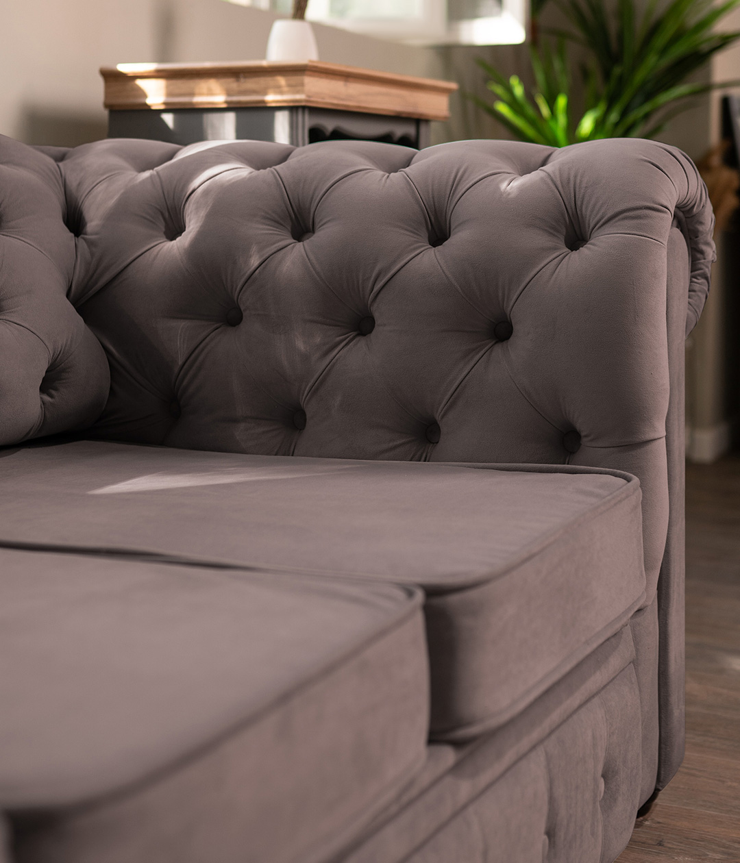 Диван Честер в стиле современной классики станет ярким акцентом любого интерьера. Высокие подлокотники и спинка, украшенные каретной стяжкой, придают ему утонченный и элегантный вид. Глубокая посадка обеспечивает максимальный комфорт для отдыха, а продуманный дизайн делает диван Честер не только функциональным, но и эффектным элементом обстановки. Идеальное сочетание стиля и удобства для вашего дома.