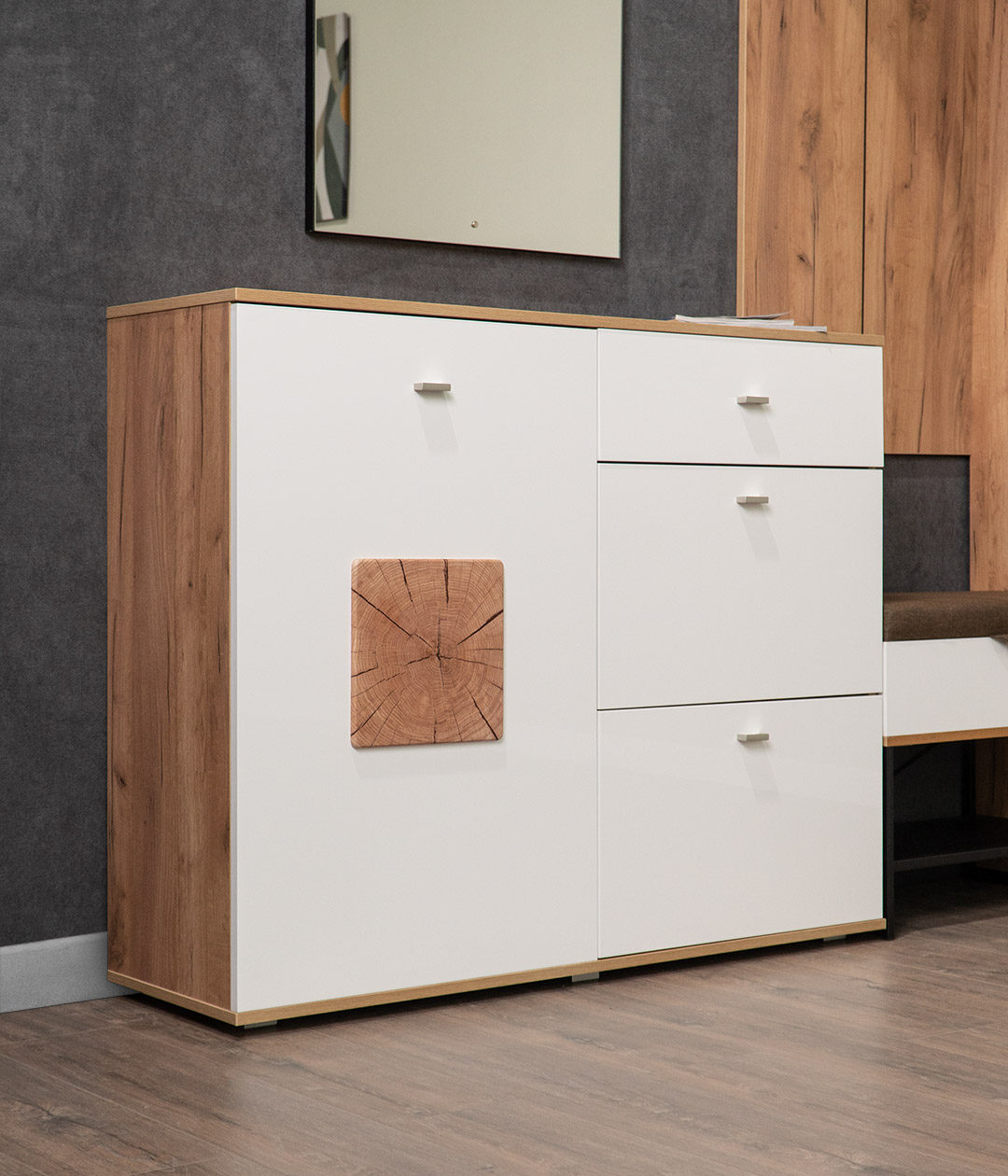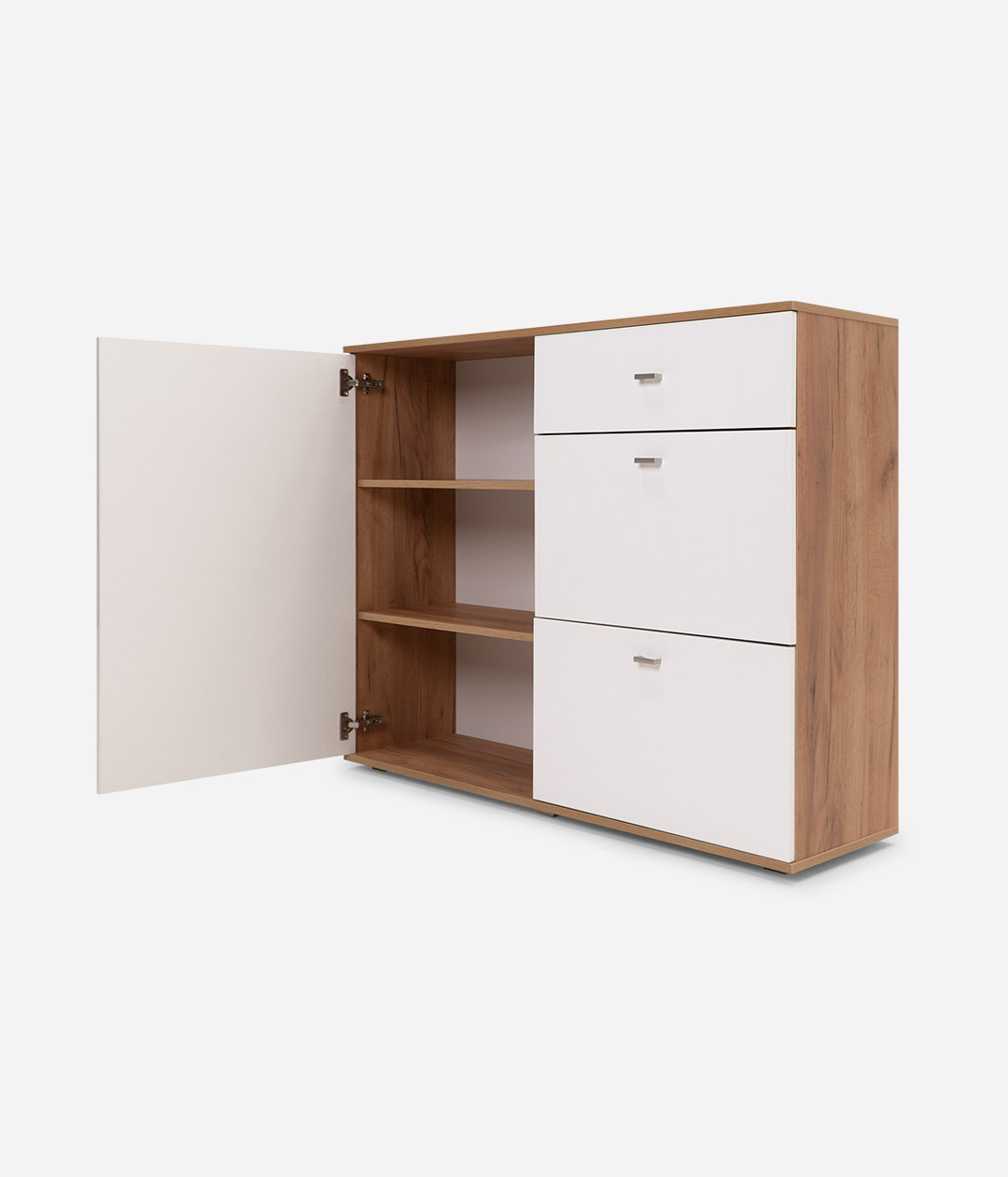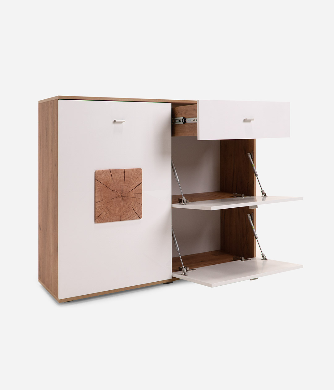 Комод Фиджи поможет с удобством хранить обувь, различные аксессуары и другие необходимые мелочи. Два откидных отделения дополнены выдвижным ящиком и отделением с закрытыми полками.