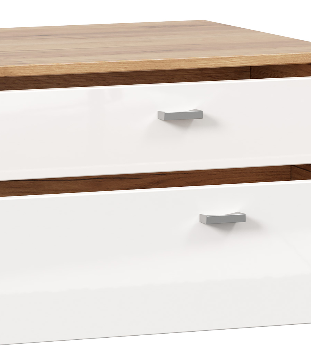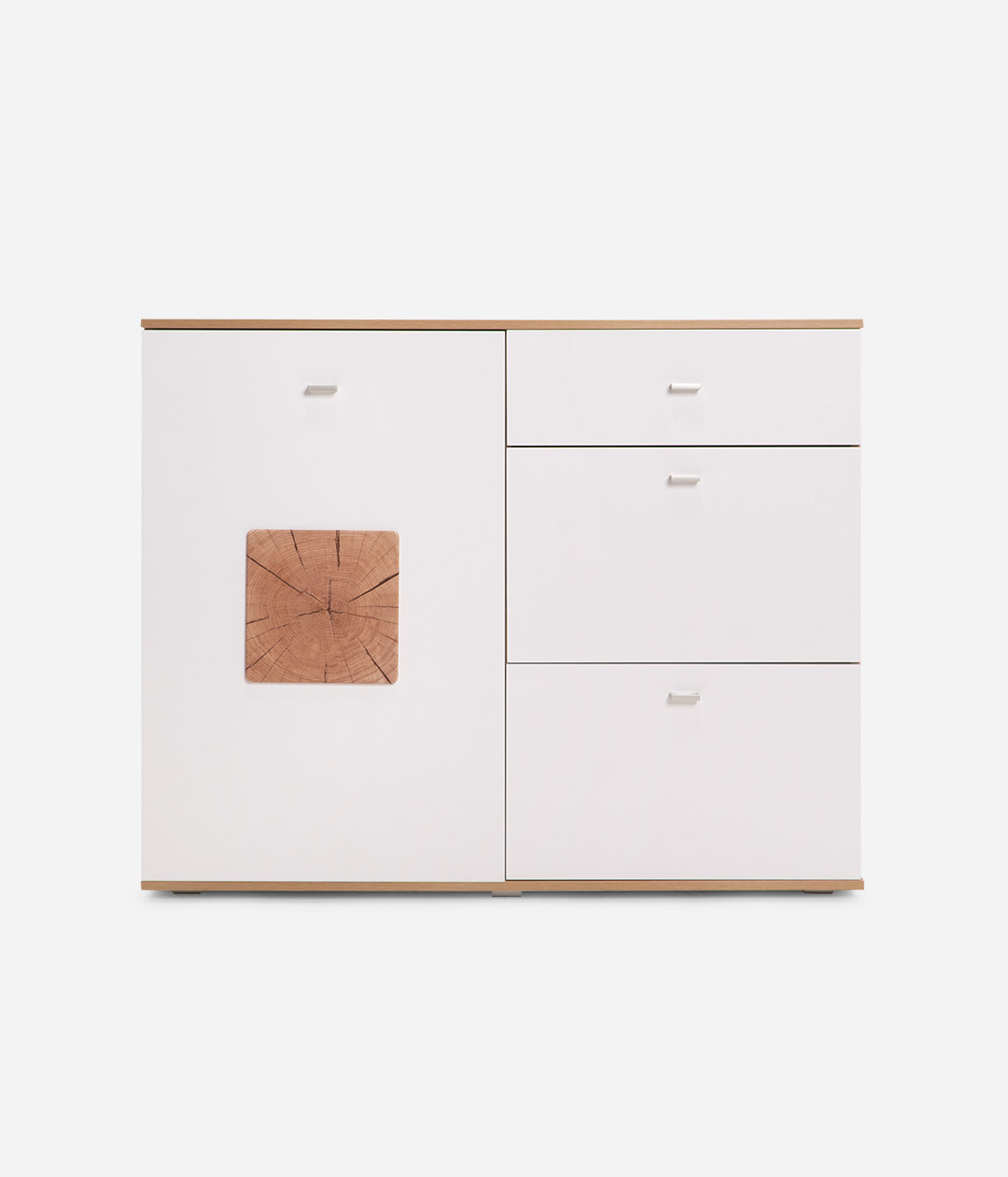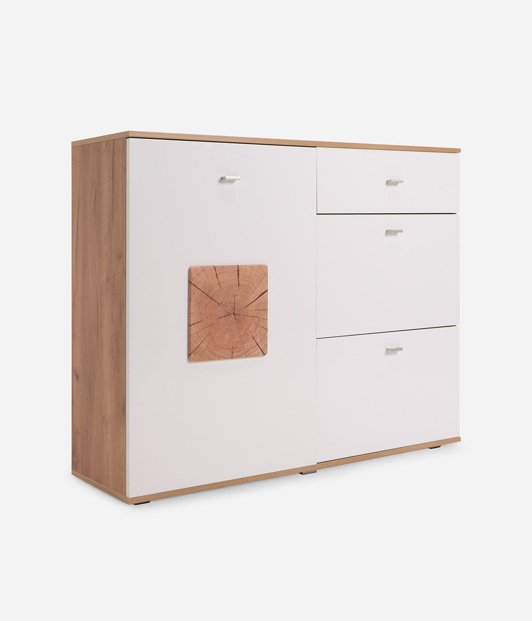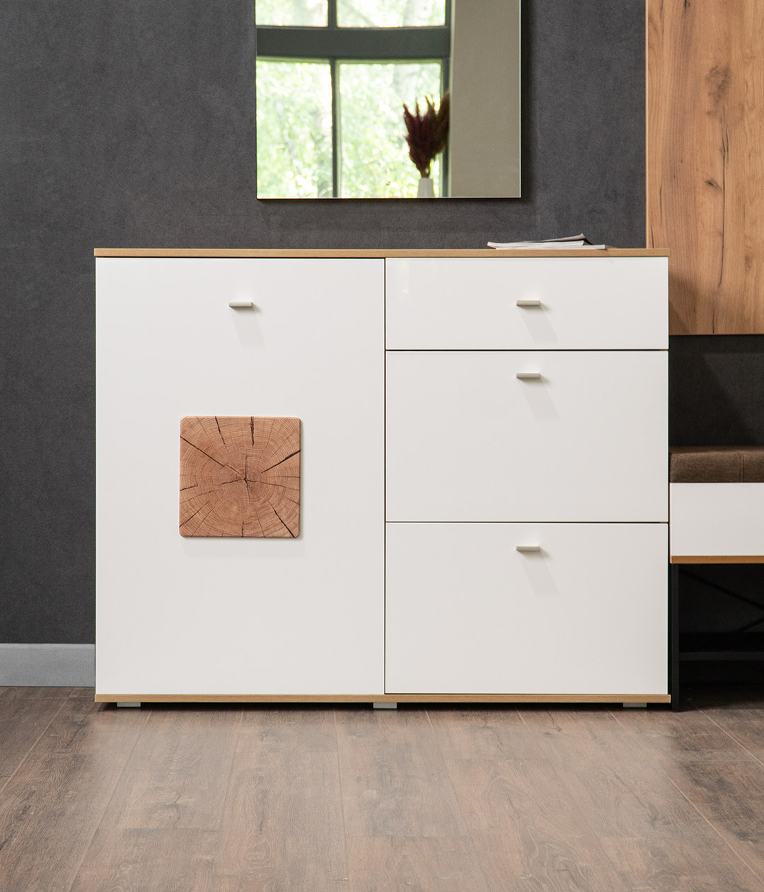 Комод Фиджи поможет с удобством хранить обувь, различные аксессуары и другие необходимые мелочи. Два откидных отделения дополнены выдвижным ящиком и отделением с закрытыми полками.