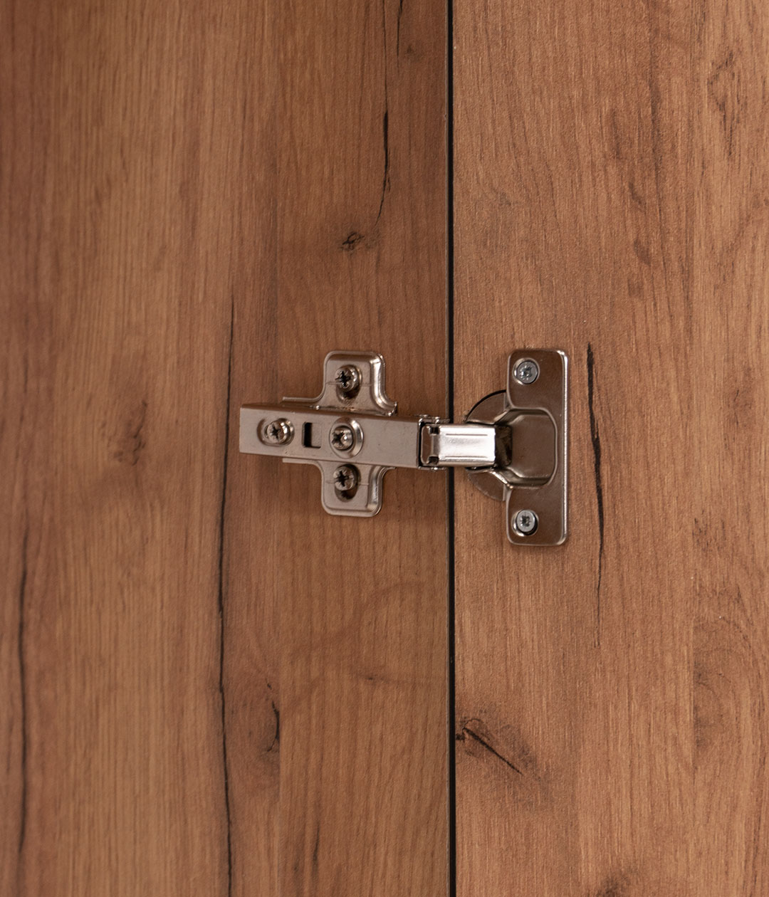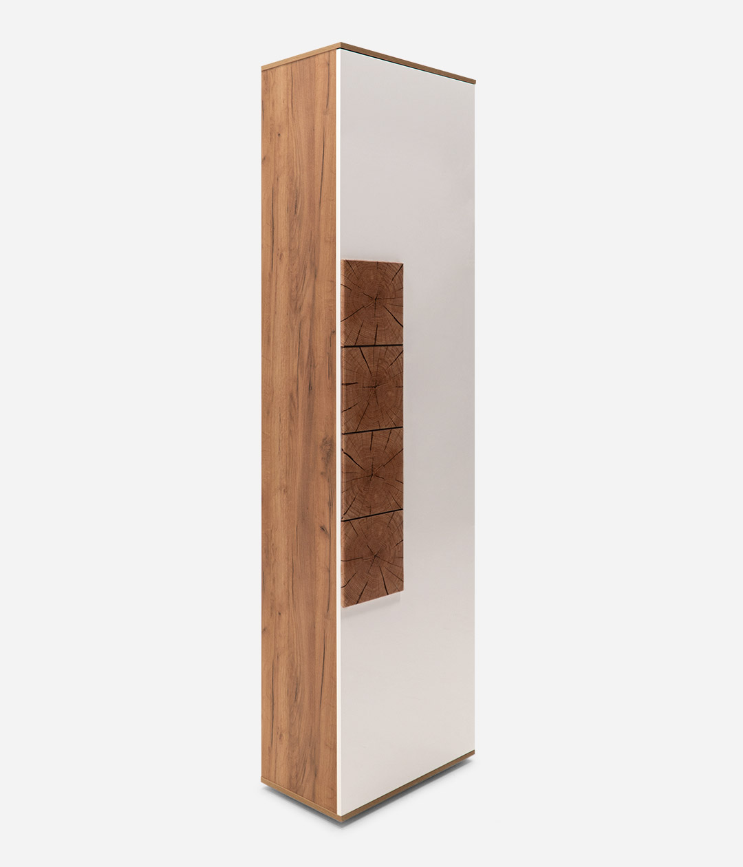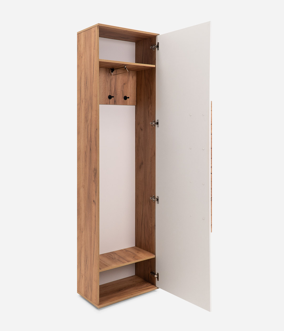 Распашной шкаф Фиджи — модель, в которой удачно сочетаются стильное исполнение и практичный дизайн. Внутри есть ниша с евро-штангой для верхней одежды и пара полок для хранения коробок с обувью, сумок или сезонных аксессуаров.