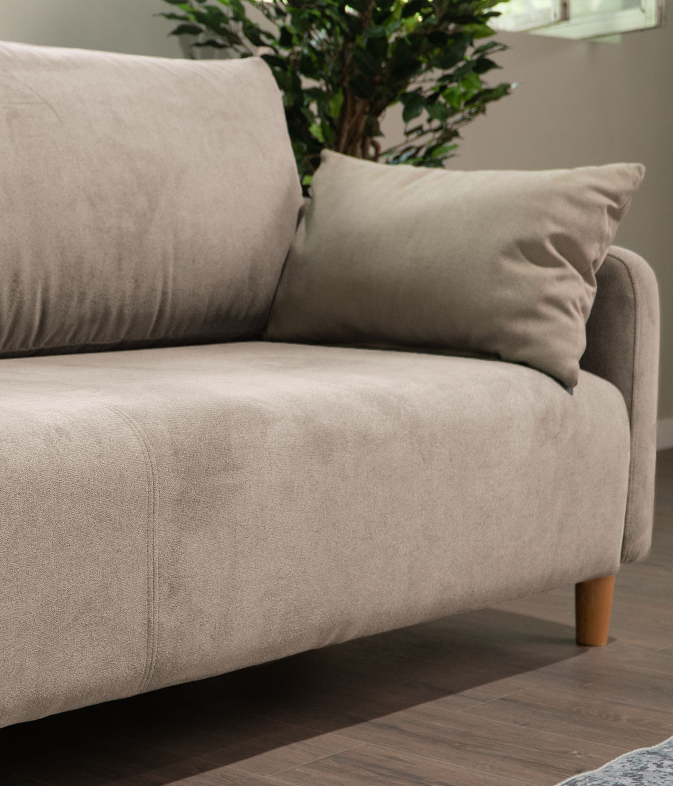 Высокие ножки дивана делают его форму легкой, максимально открывая пространство. А натуральное дерево подчеркивает естественность материалов. Кроме того, такая конструкция упрощает уборку, делая доступным напольное покрытие.