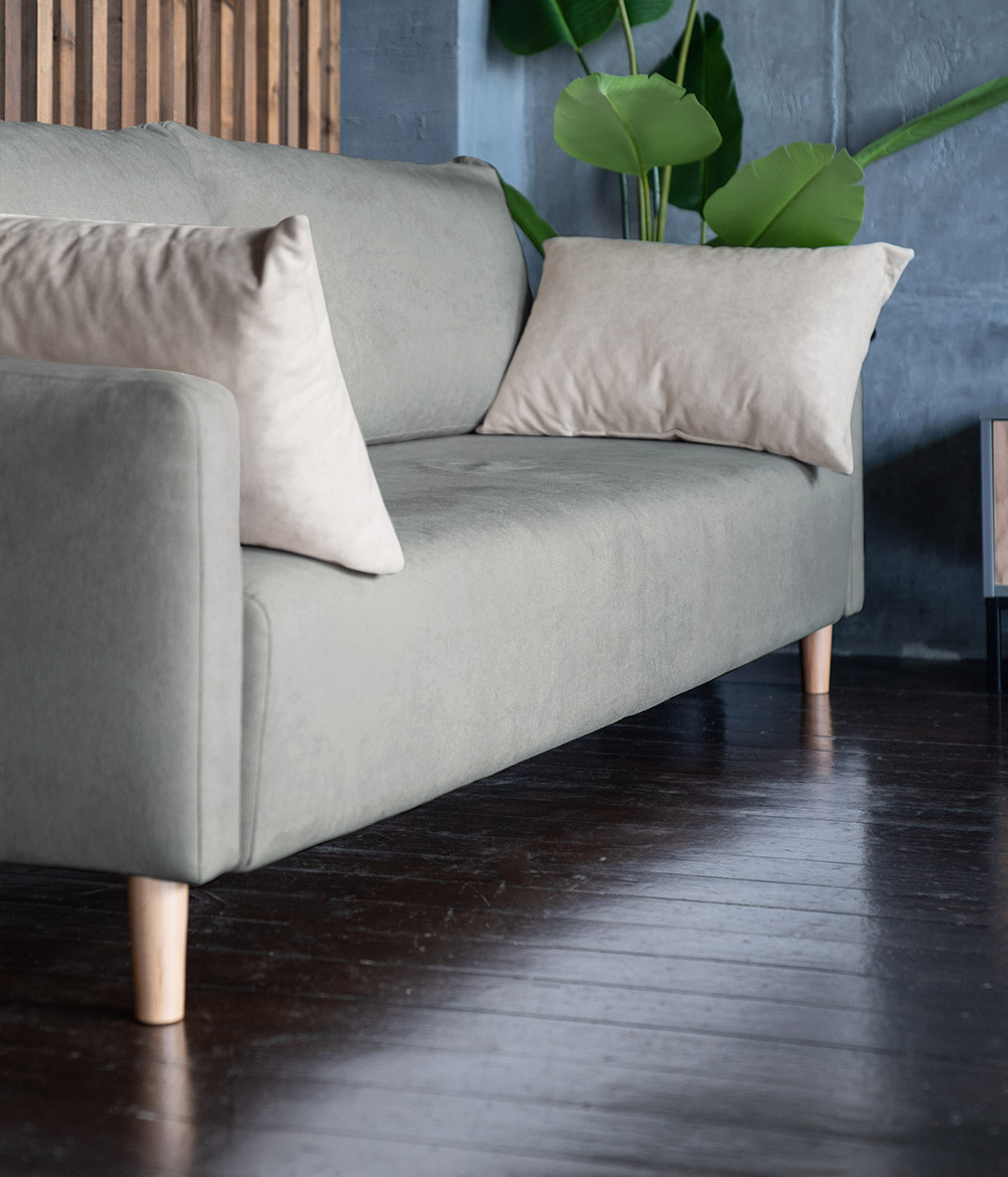 Высокие ножки дивана делают его форму легкой, максимально открывая пространство. А натуральное дерево подчеркивает естественность материалов. Кроме того, такая конструкция упрощает уборку, делая доступным напольное покрытие.