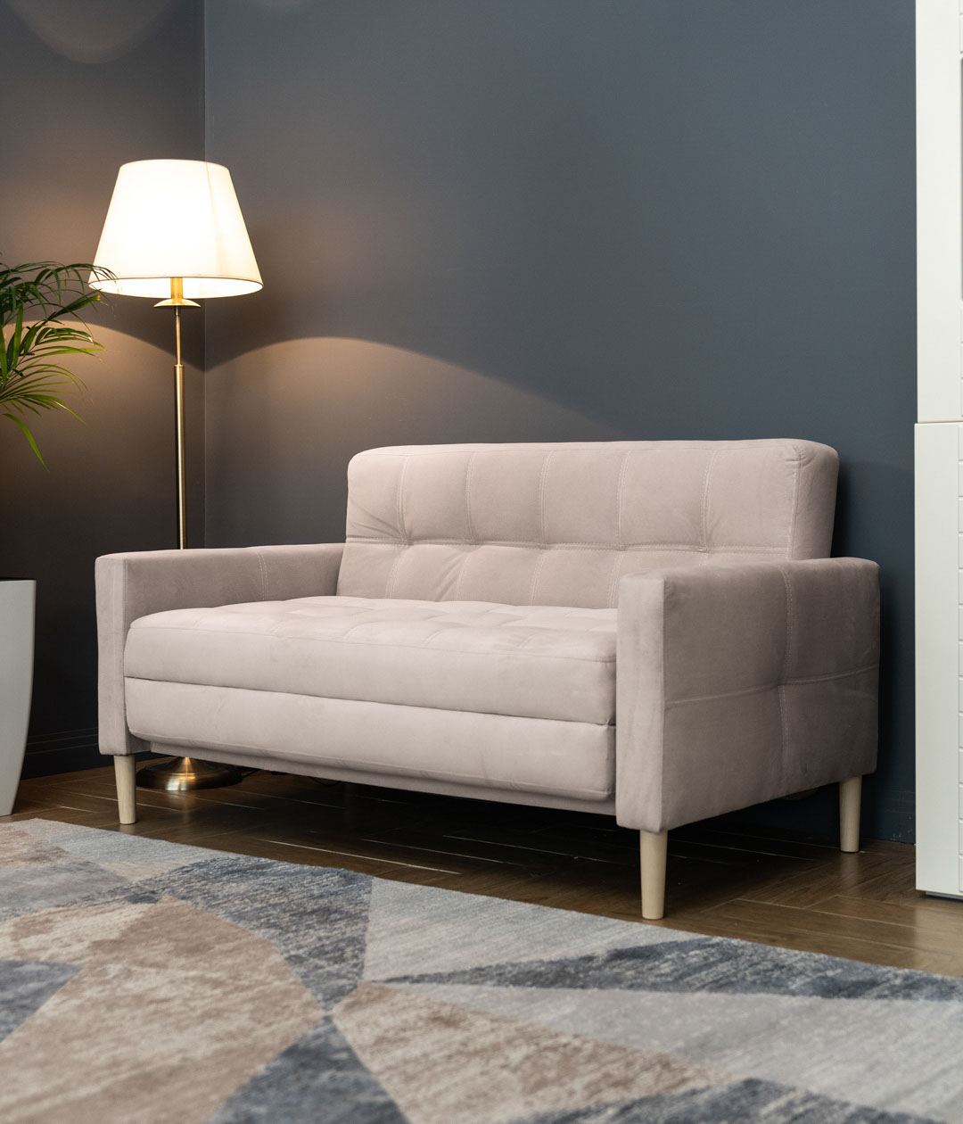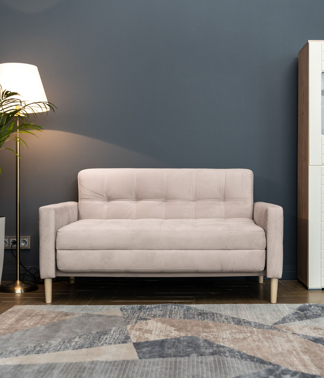 В собранном виде занимает очень маленькую площадь, в разложенном — образует просторное и удобное спальное место. А узкие подлокотники не увеличивают габариты дивана.