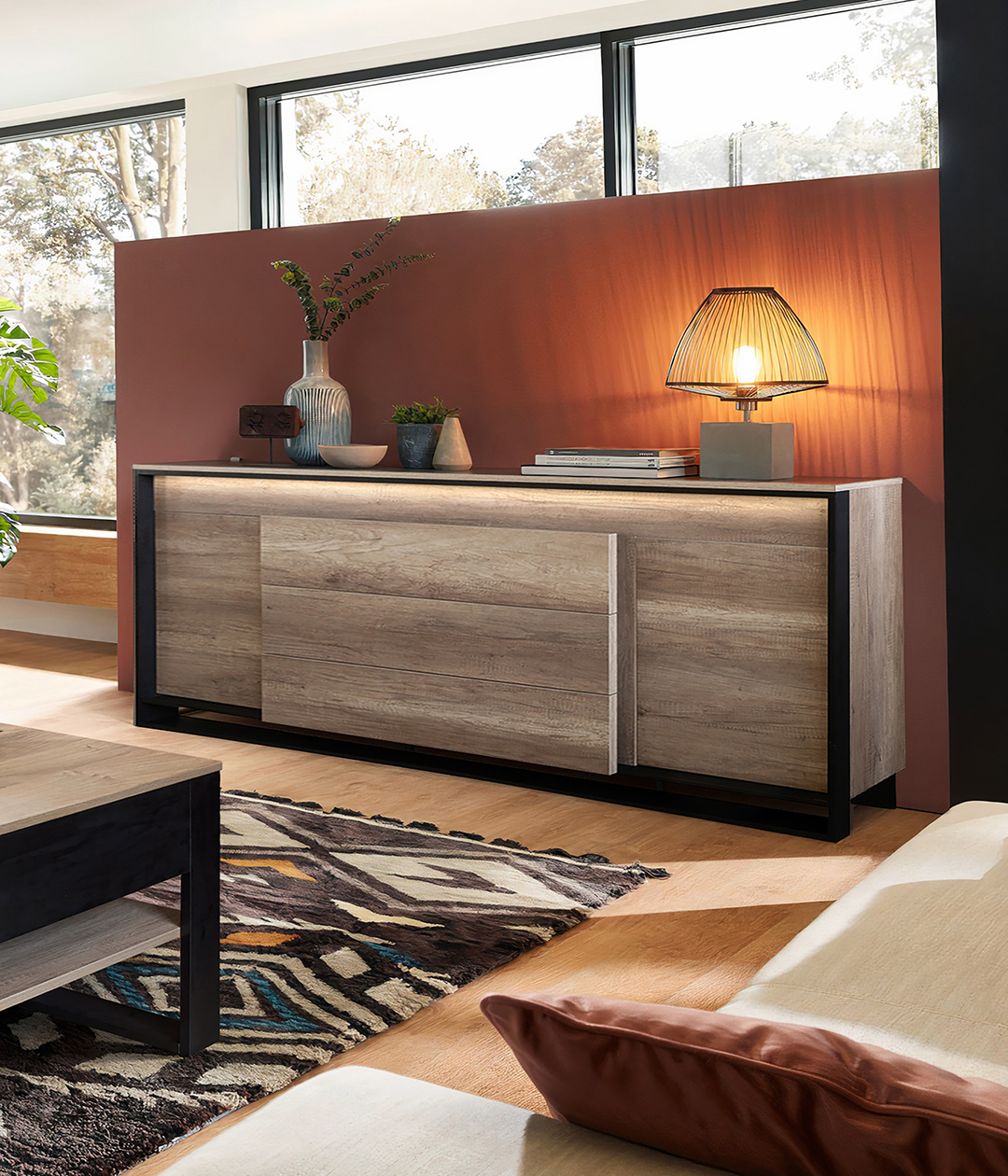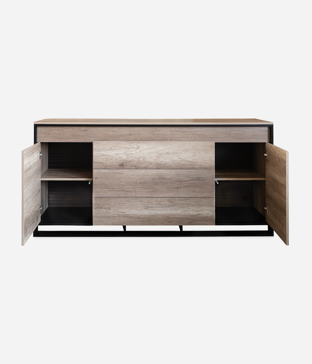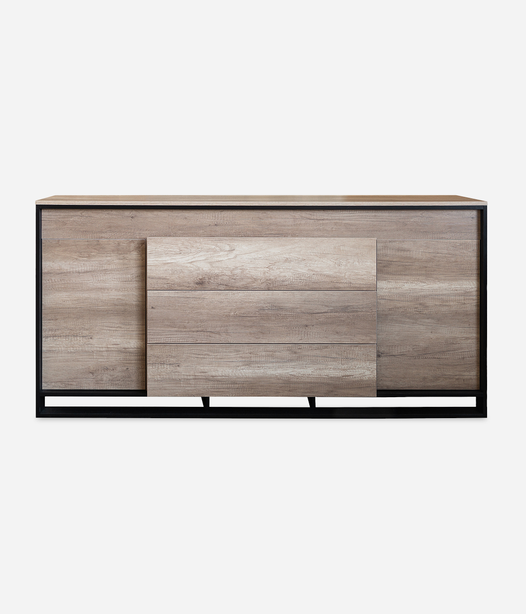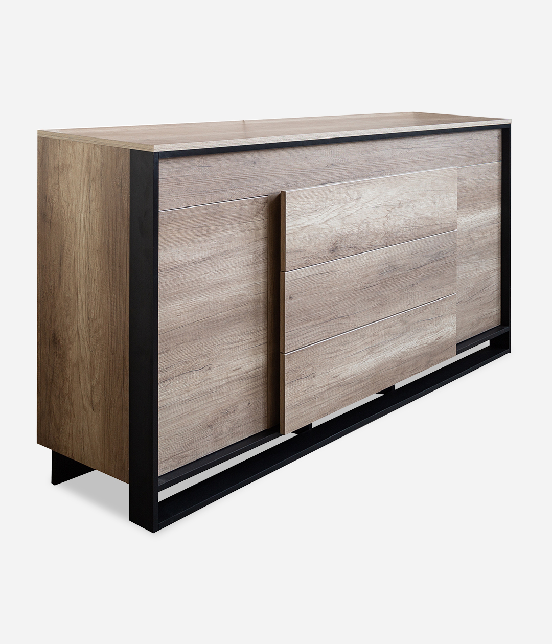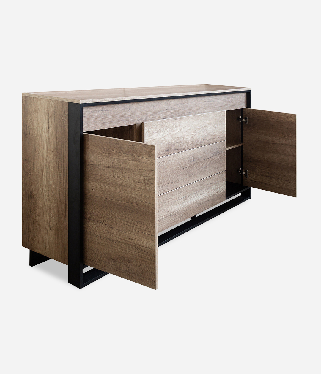 Широкий комод Каньон в натуральных оттенках не перегрузит интерьер, добавит тепла и уюта в гостиную. Чёрные пластиковые опоры и декоративные вставки по периметру фасадов позволяют получить красивую комбинацию, подчеркнуть текстуру, расставить акценты.