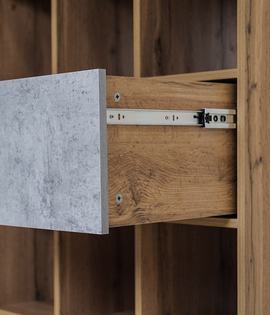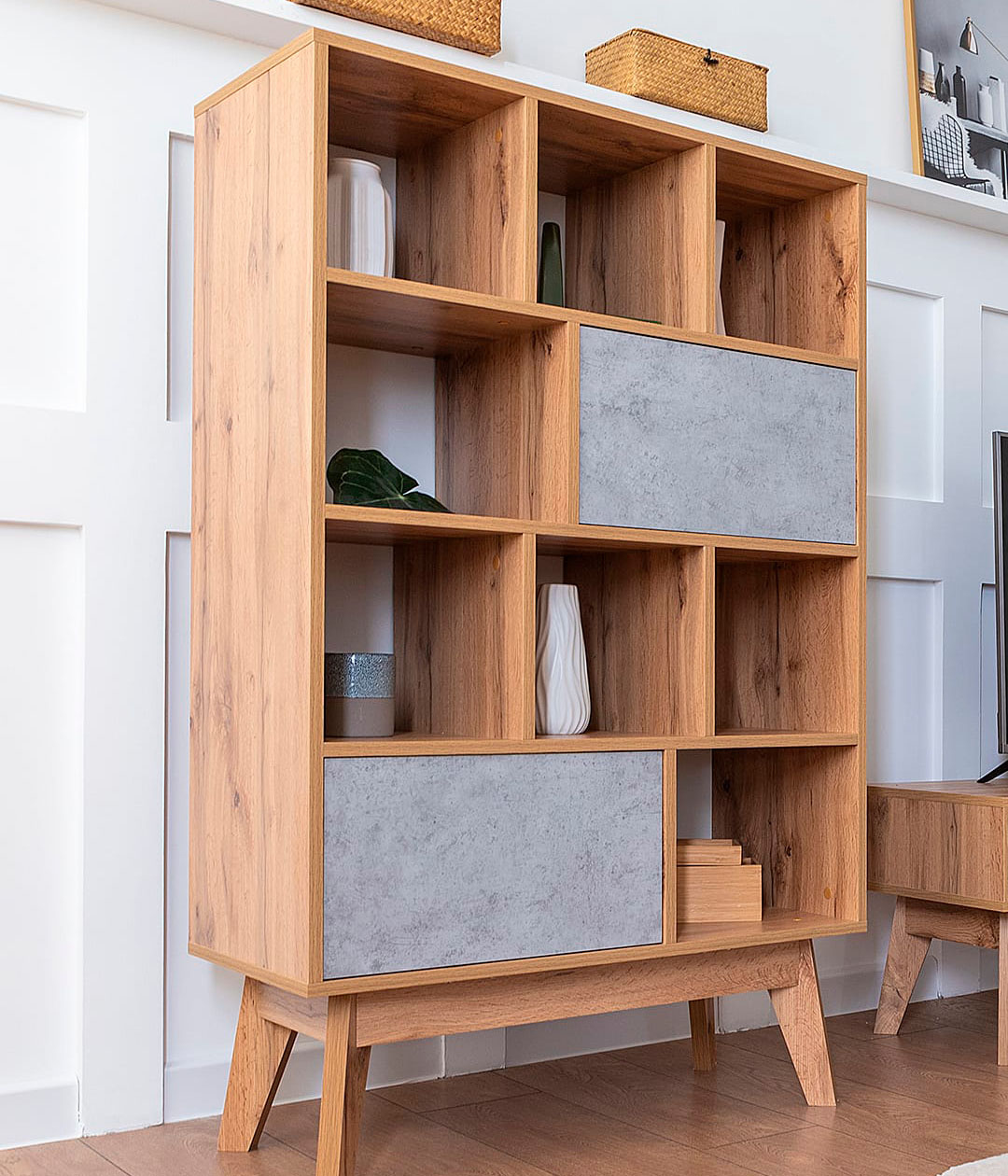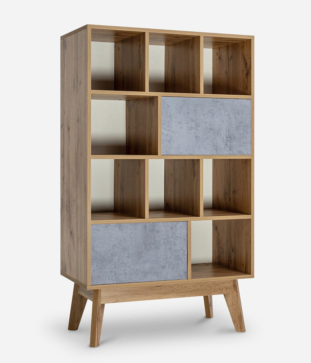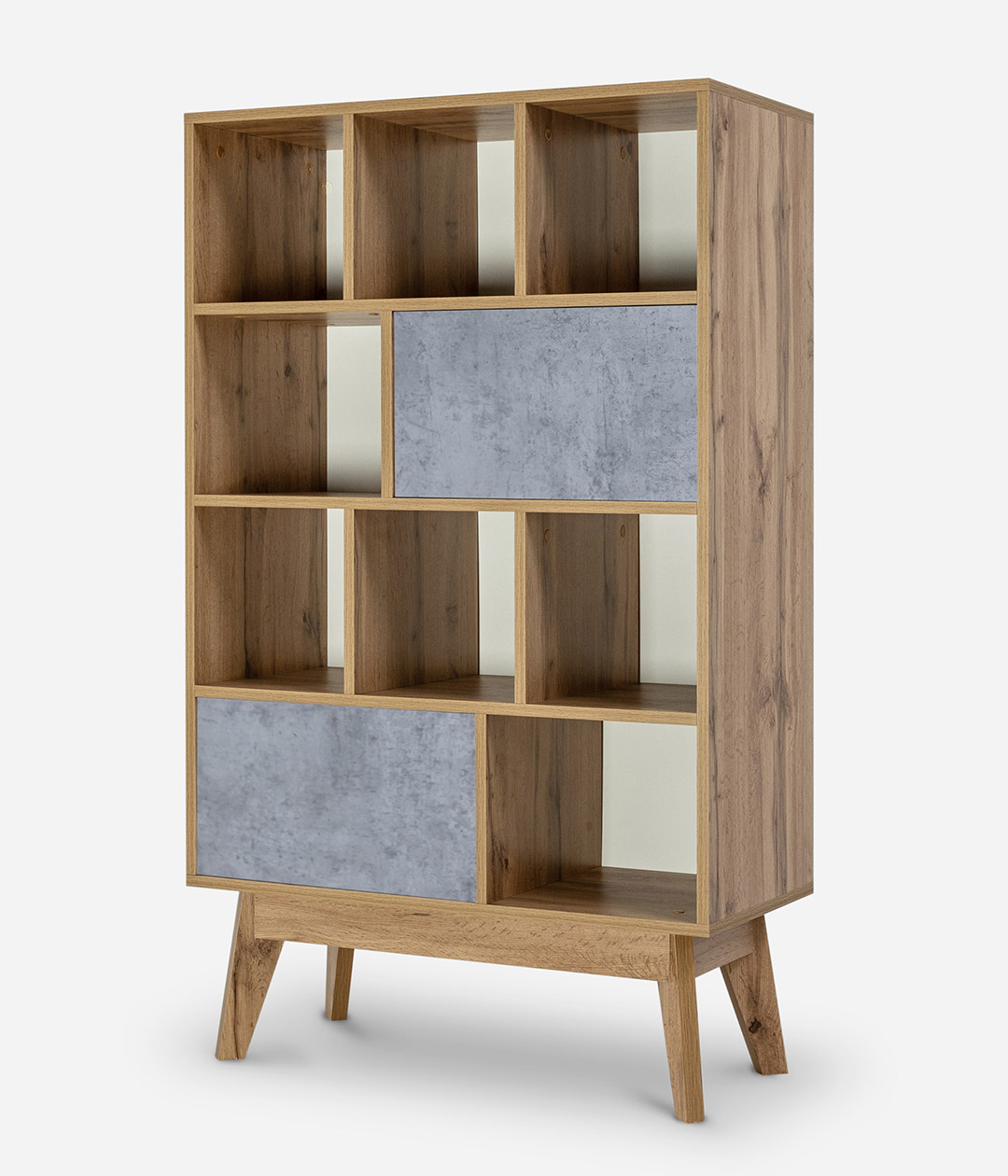 Стеллаж Хелен — это лаконичность, четкость геометрических линий, минимальное количество фурнитуры. Отличительной чертой изделия по праву можно назвать большое количество открытых полок, выполненных в контрастной отделке. Фасады закрытых отделений оснащены механизмами push to open. Среди конструктивных особенностей стоит отметить наличие высоких ножек, визуально облегчающих модель.
