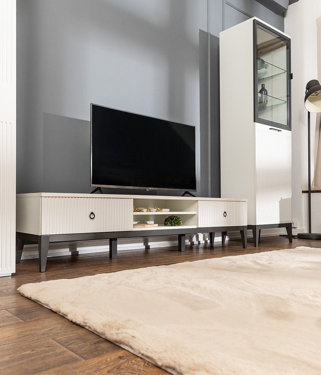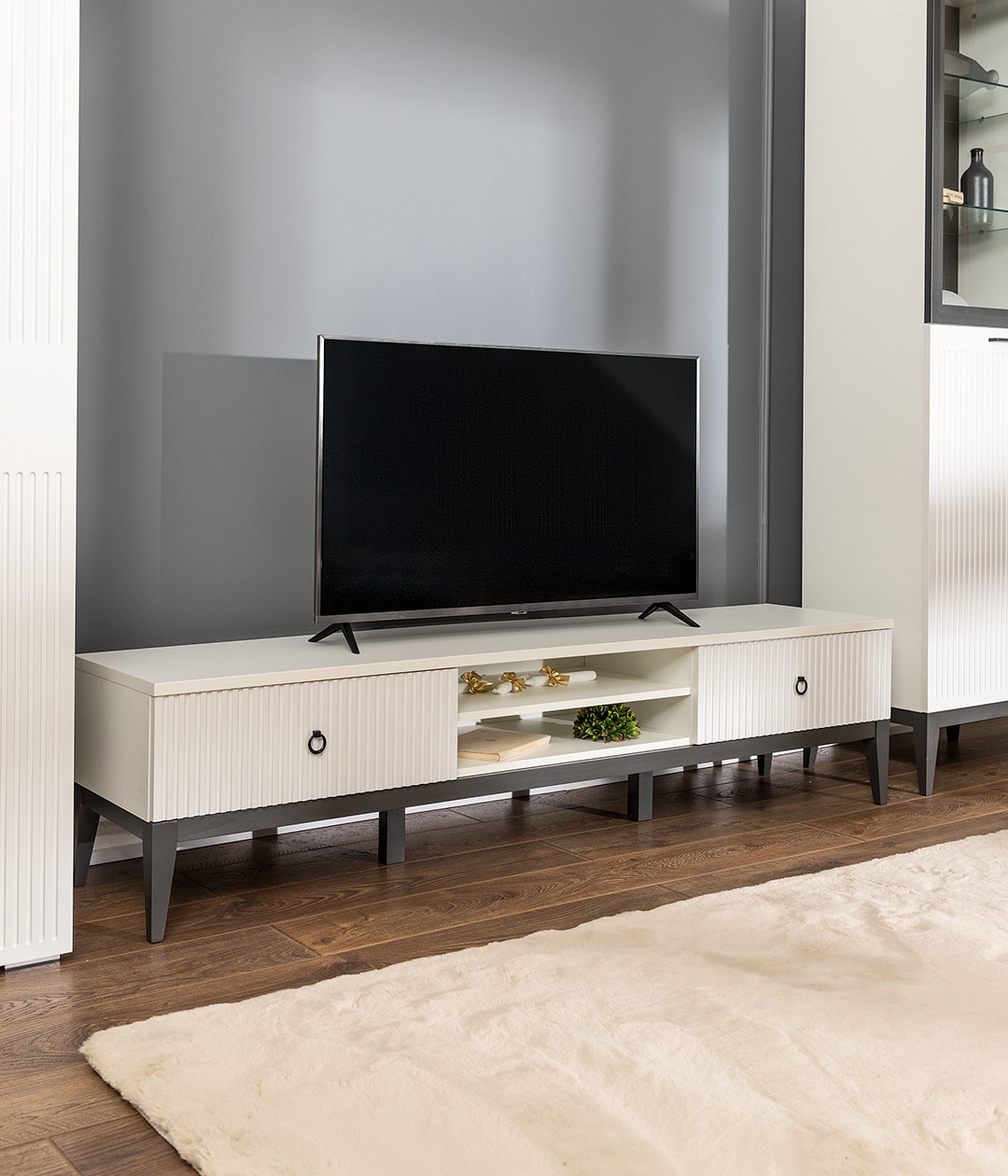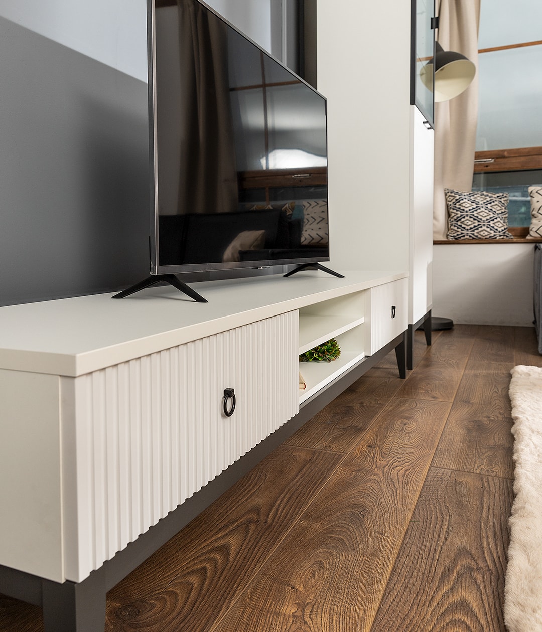 Высокие ножки тумбы делают её форму легкой, максимально открывая пространство. А натуральное дерево подчеркивает естественность материалов. Кроме того, такая конструкция упрощает уборку, делая доступным напольное покрытие