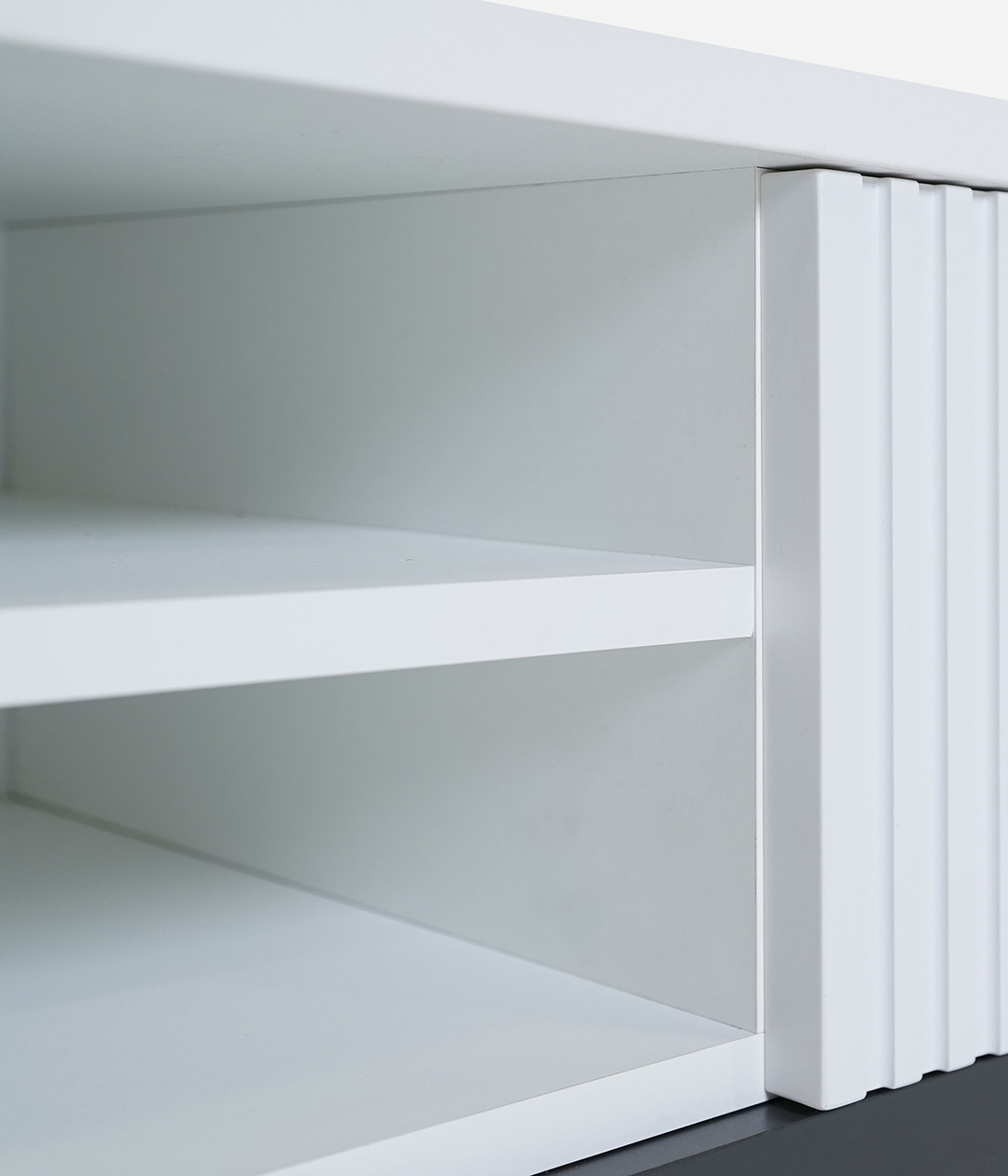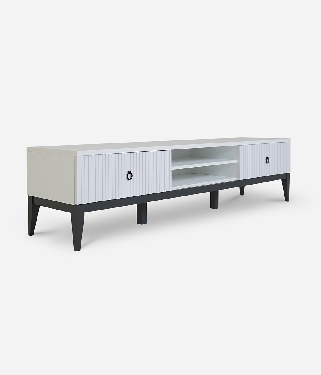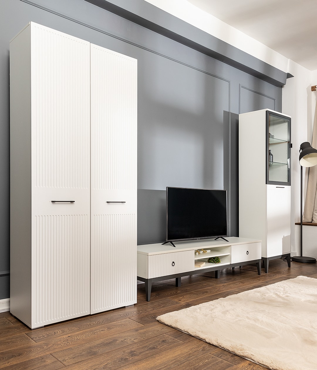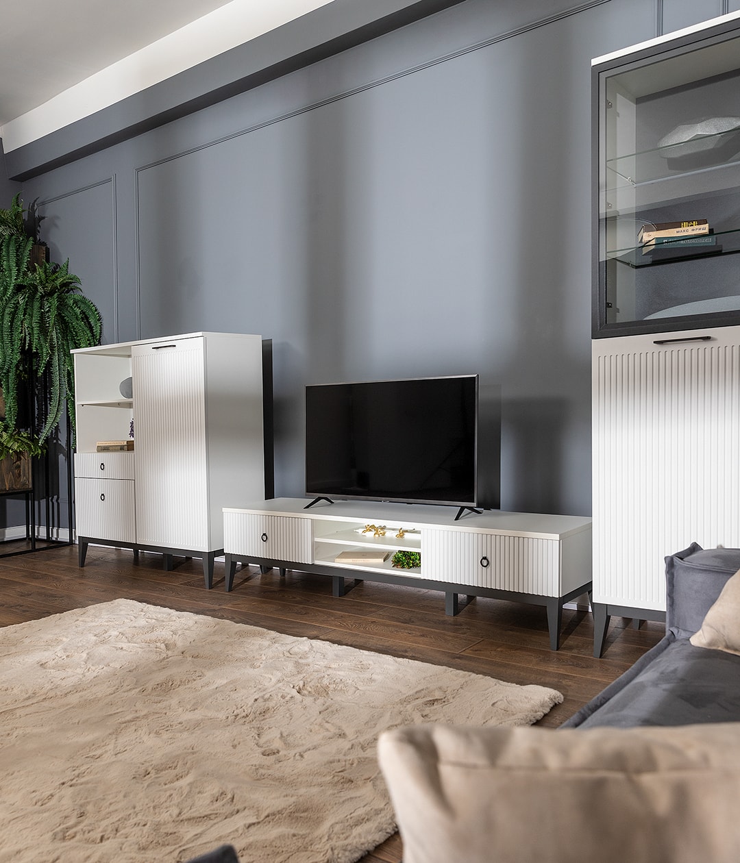 Высокие ножки тумбы делают её форму легкой, максимально открывая пространство. А натуральное дерево подчеркивает естественность материалов. Кроме того, такая конструкция упрощает уборку, делая доступным напольное покрытие
